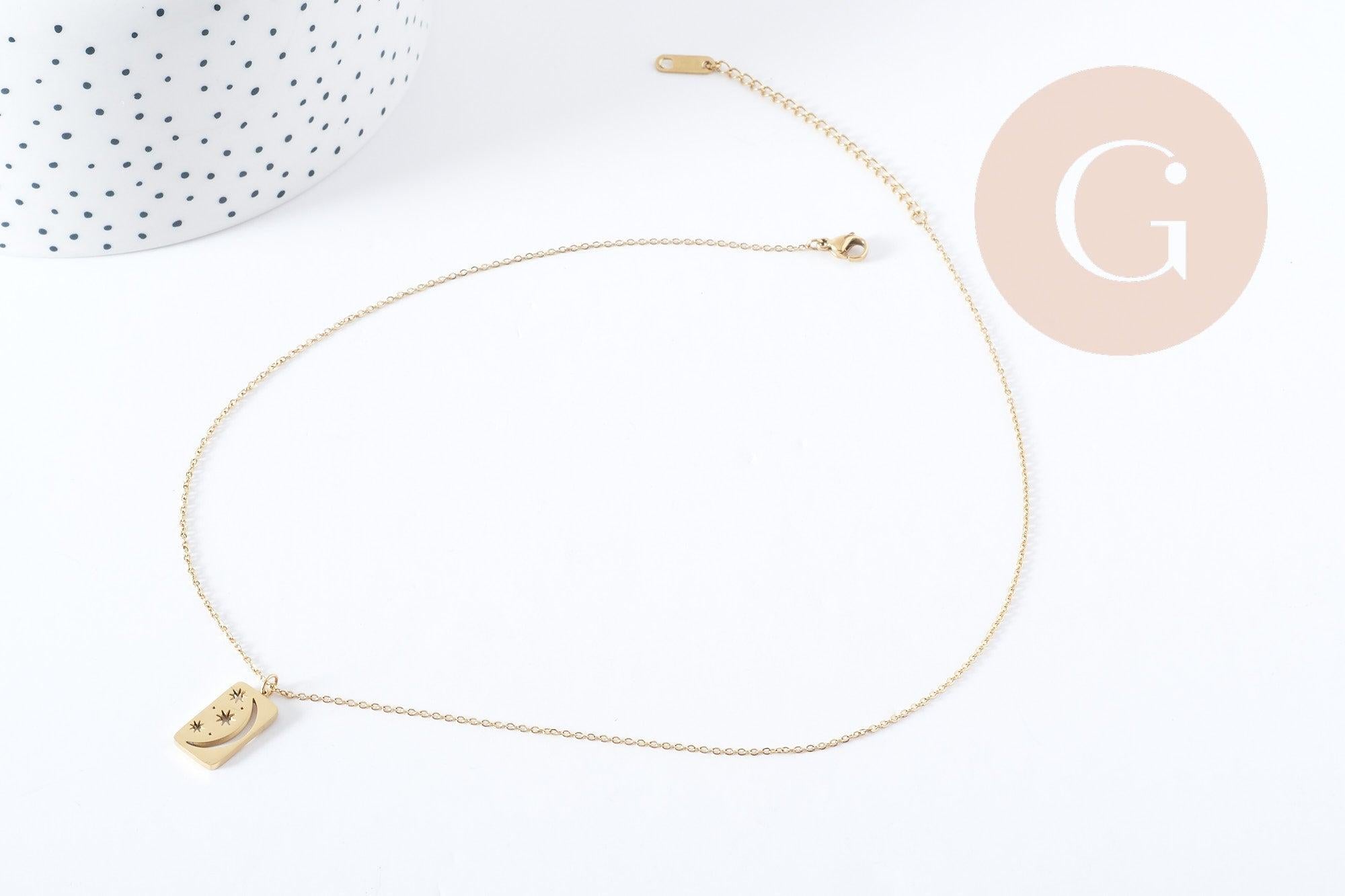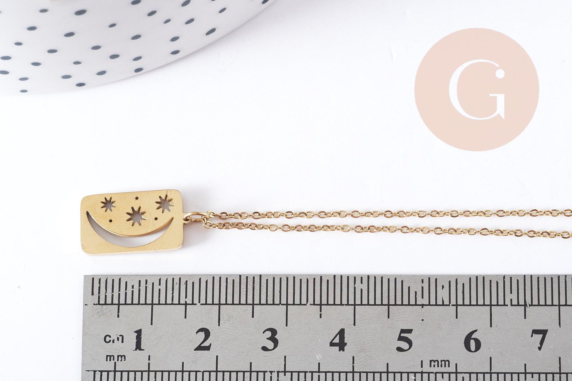 Embrace the magic of the night sky with our rectangle medallion necklace, adorned with moon and star motifs, in gold-tone 304 stainless steel.