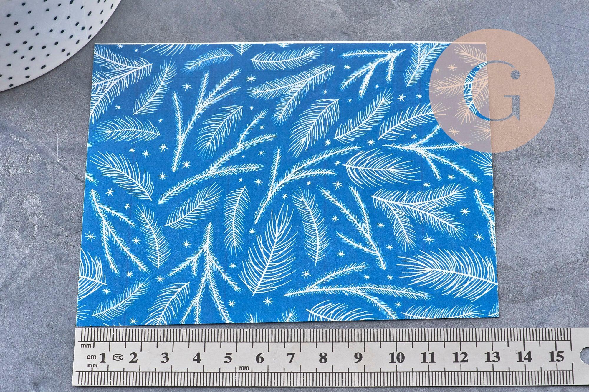 Bring a soft and elegant winter atmosphere to your creations with this polymer clay transfer sheet – Winter design on a blue background . The delicate contrast between the white fir branches and the deep blue background evokes winter landscapes, snow, and the holiday season. A refined design, ideal for poetic, understated, and timeless jewelry.