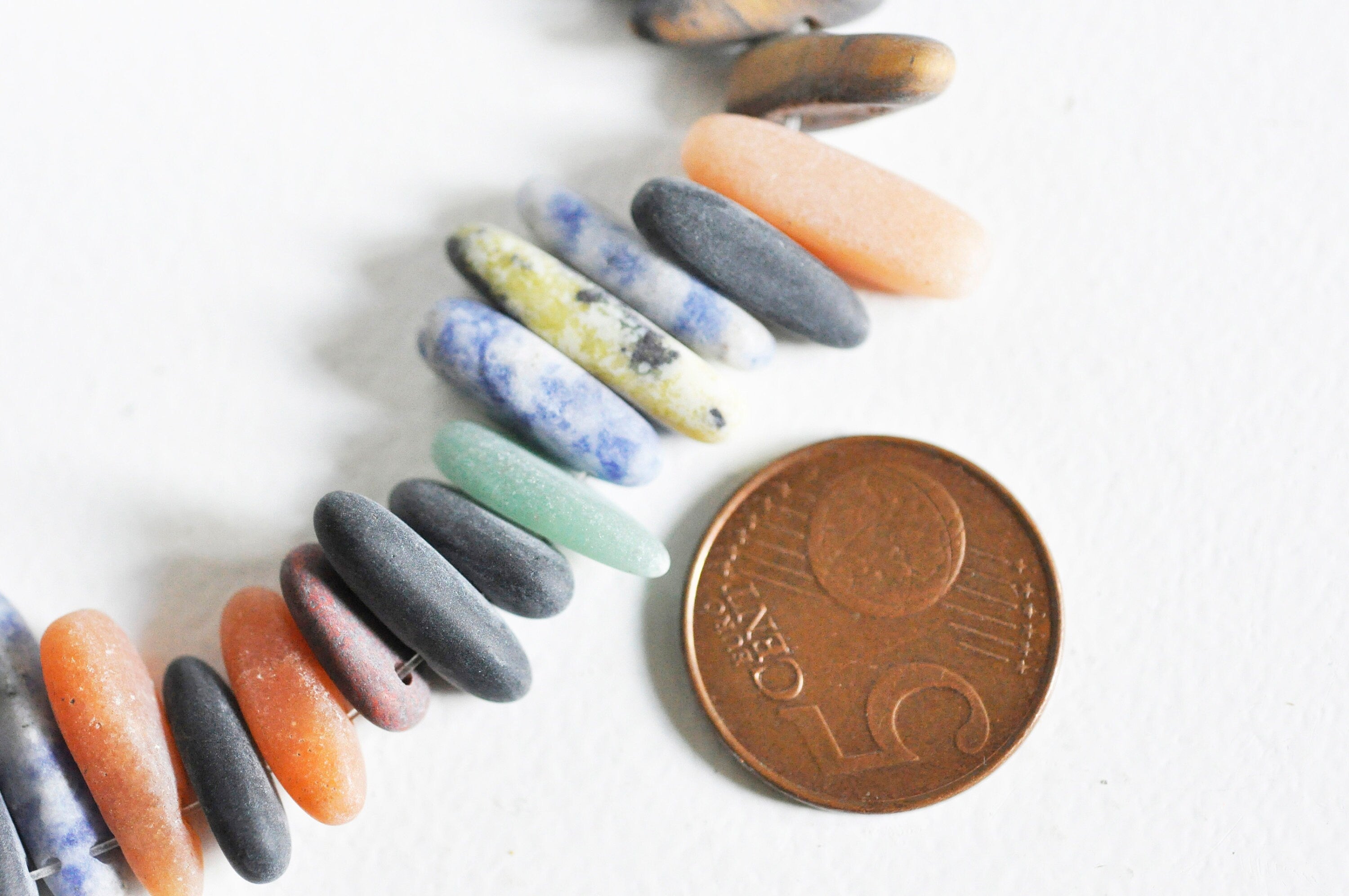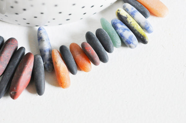 A string of beads in long sandblasted chips made of mixed natural and synthetic stones such as sodalite, aventurine, howlite, jade...