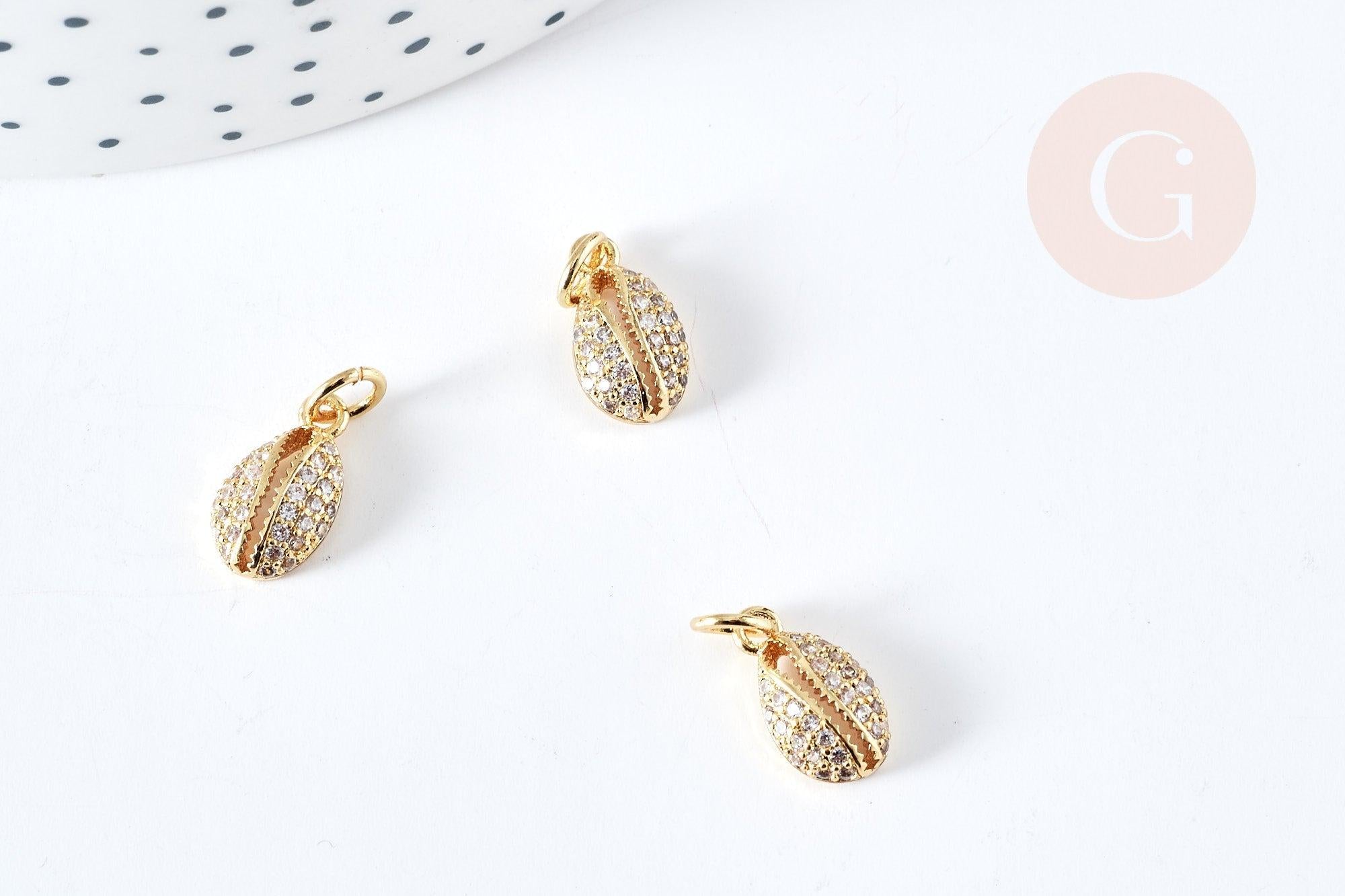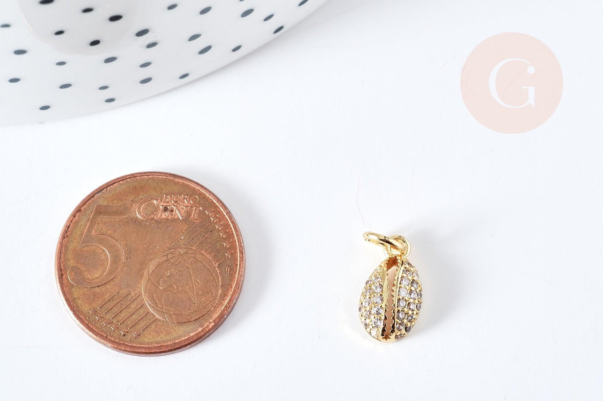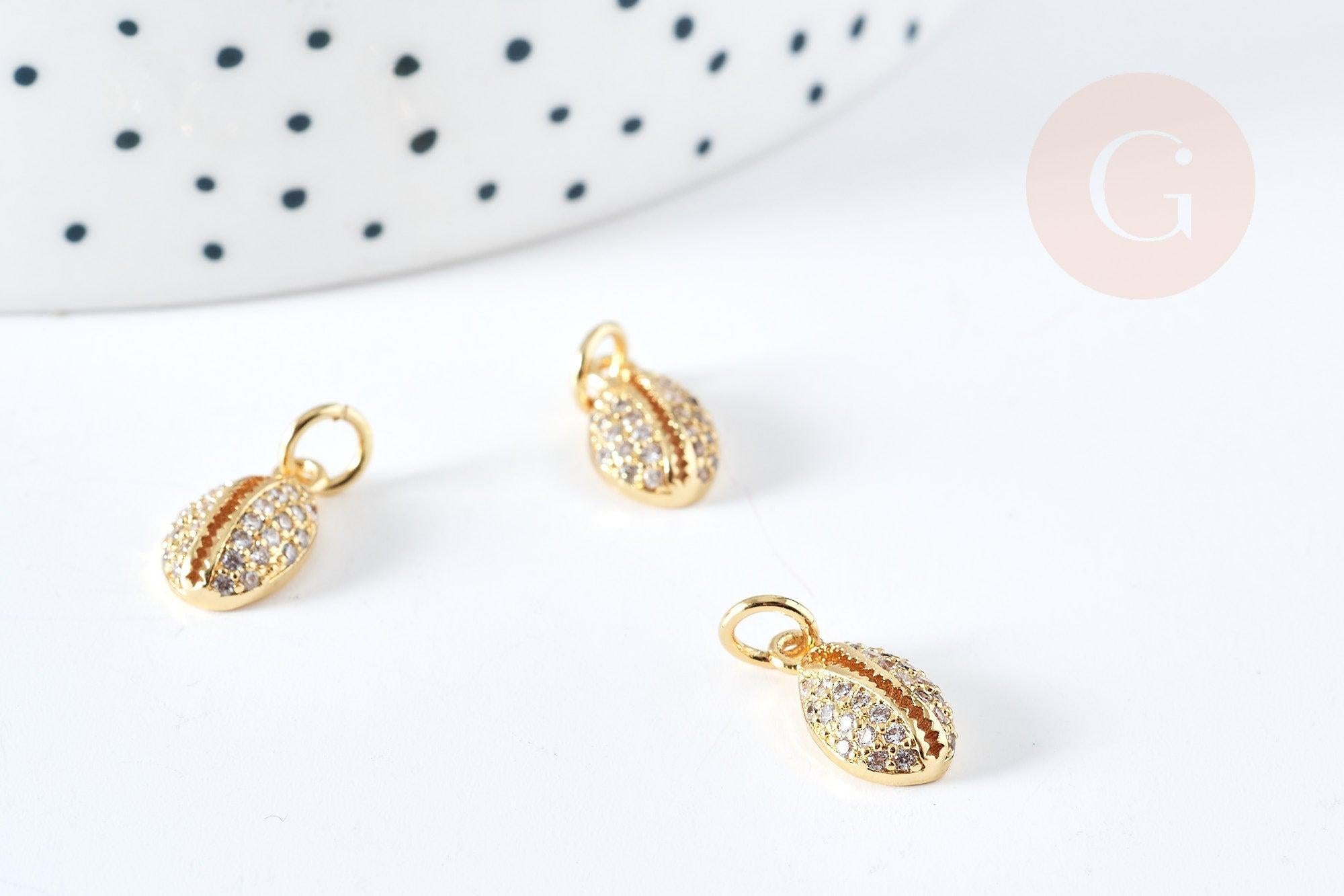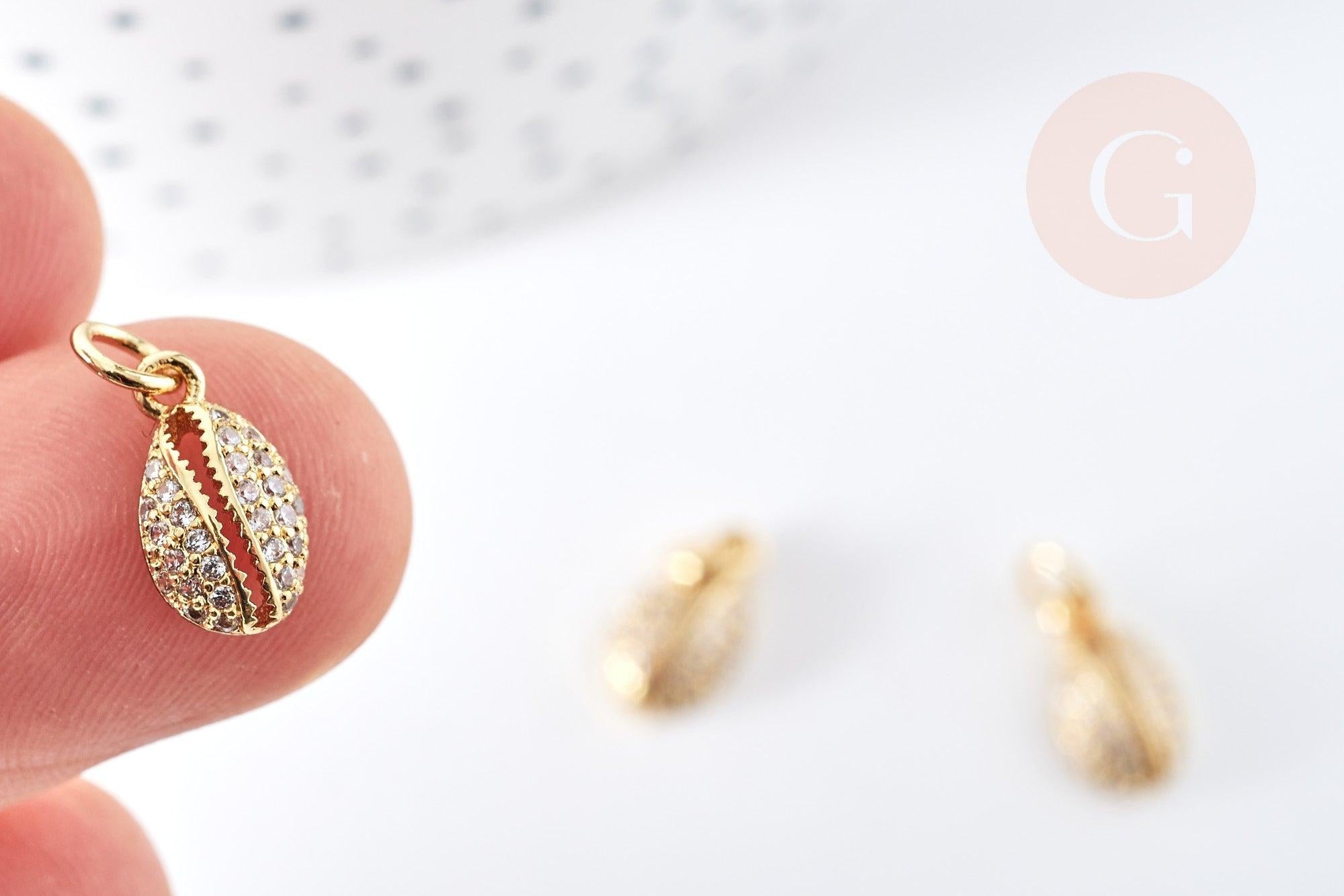 This golden cowrie shell pendant is a real trendy jewel with its setting of mini zircons all over its surface. With it, you are sure to create ultra fashionable accessories and costume jewelry this summer.