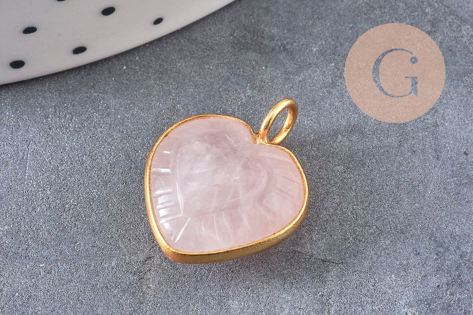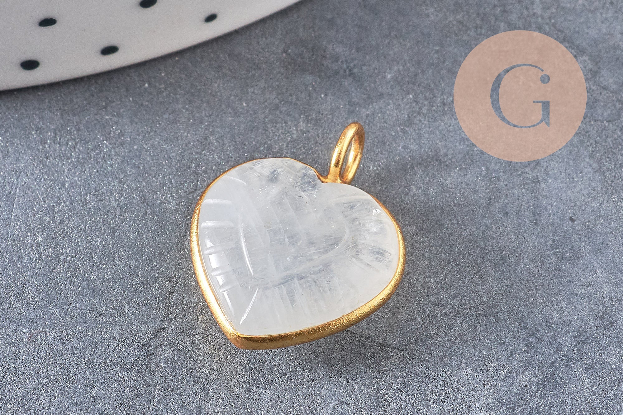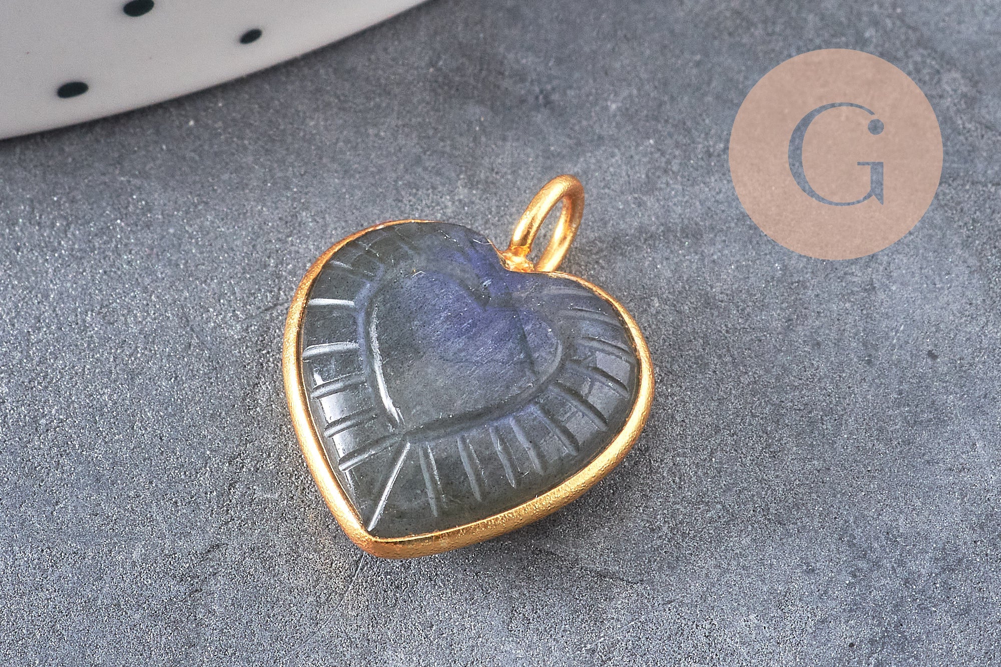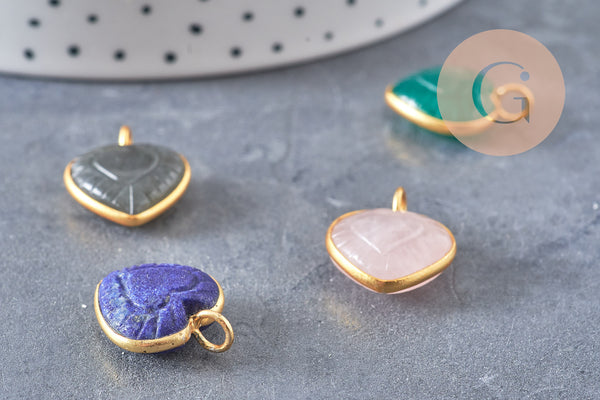 Add a touch of love and refinement to your creations with this heart pendant in natural stone (labradorite, amethyst, moonstone, green onyx, lapis lazuli, rose quartz) , finely hand-carved and set in a 925 sterling silver mount plated with 18K gold .