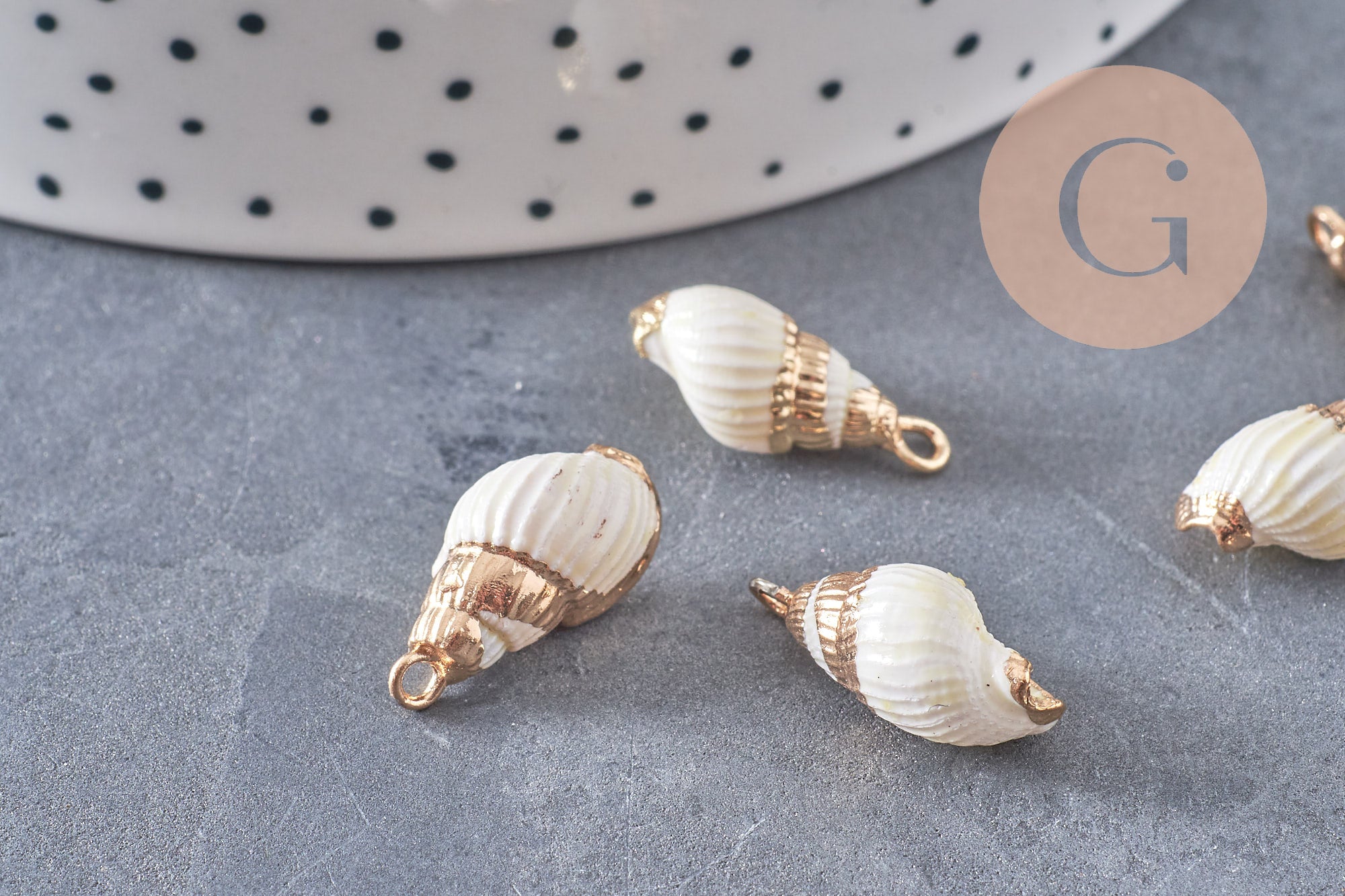 Fall in love with these genuine white spiral shell pendants, mounted on a gold-plated backing. Each shell is unique, adding charm and authenticity to your DIY costume jewelry creations.