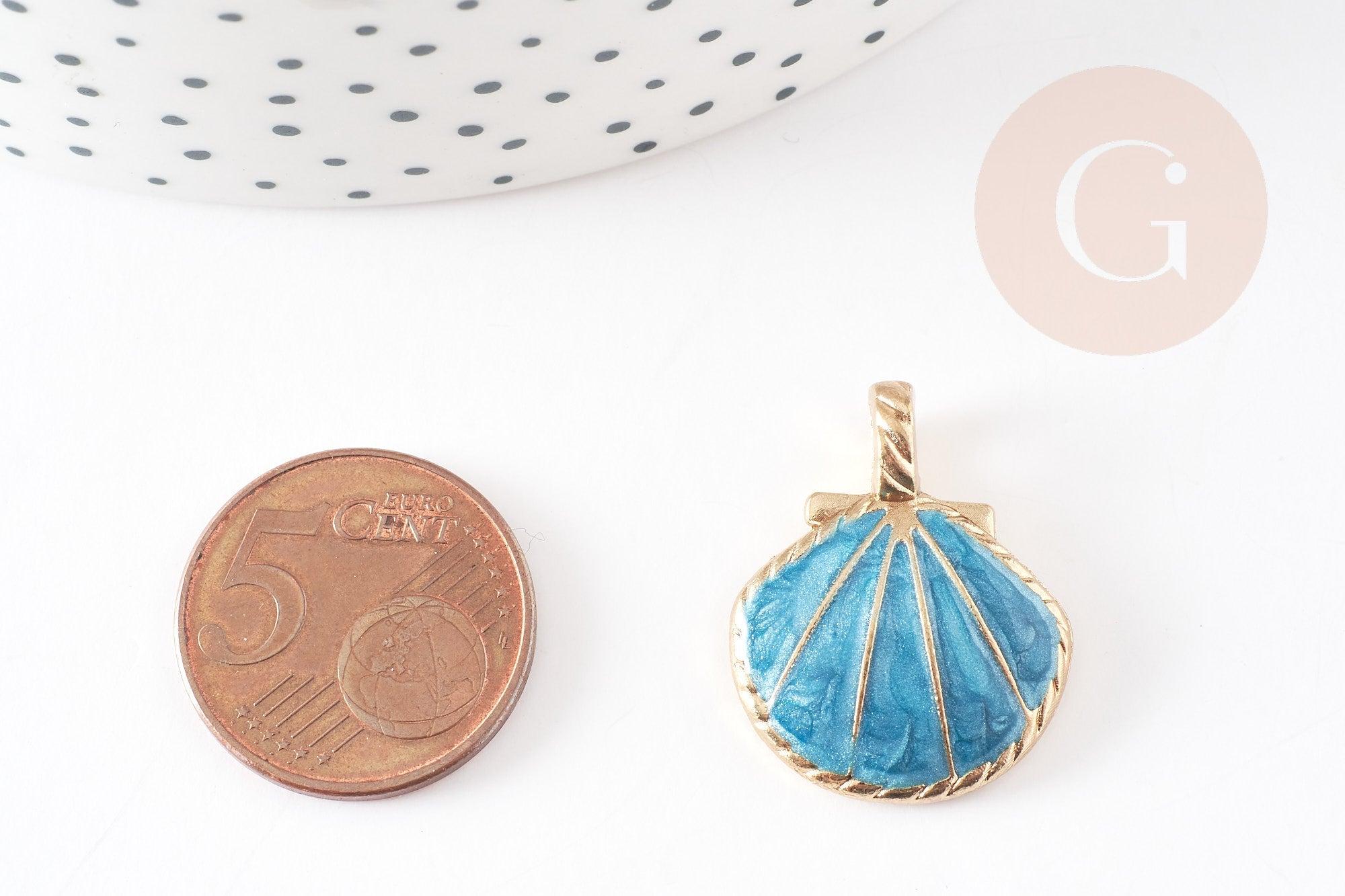 A shell pendant in gold metal covered with transparent sky blue resin.