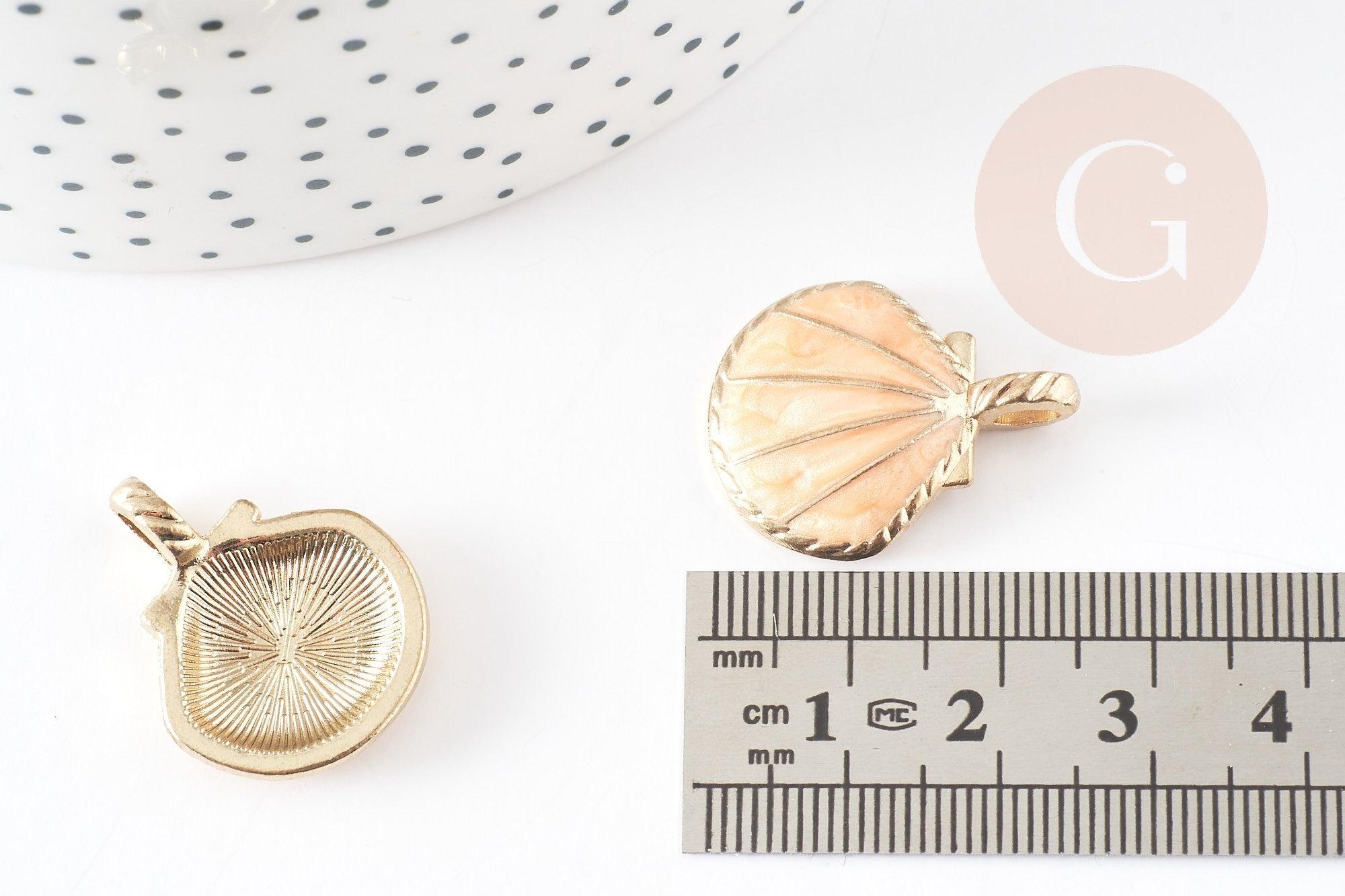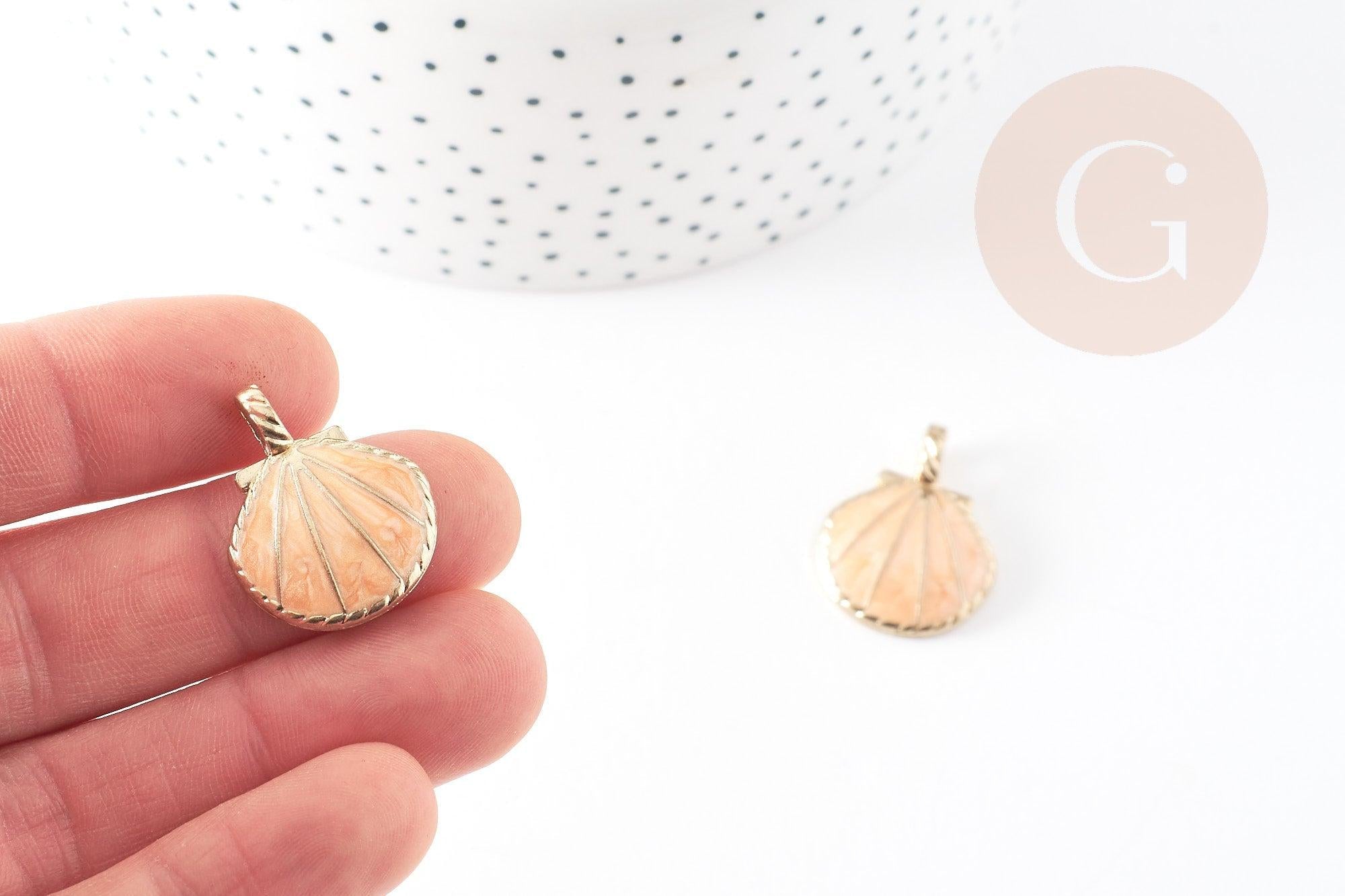A shell pendant in gold metal covered with transparent salmon pink resin.