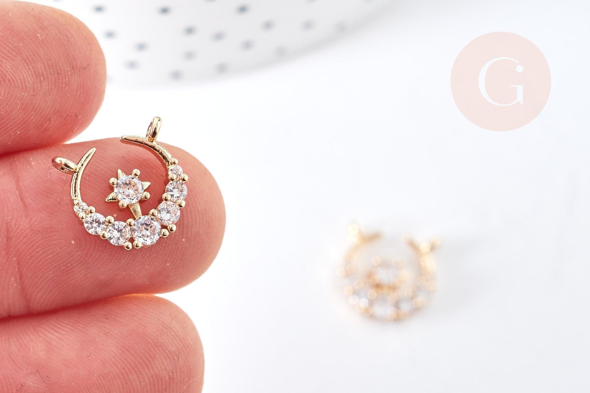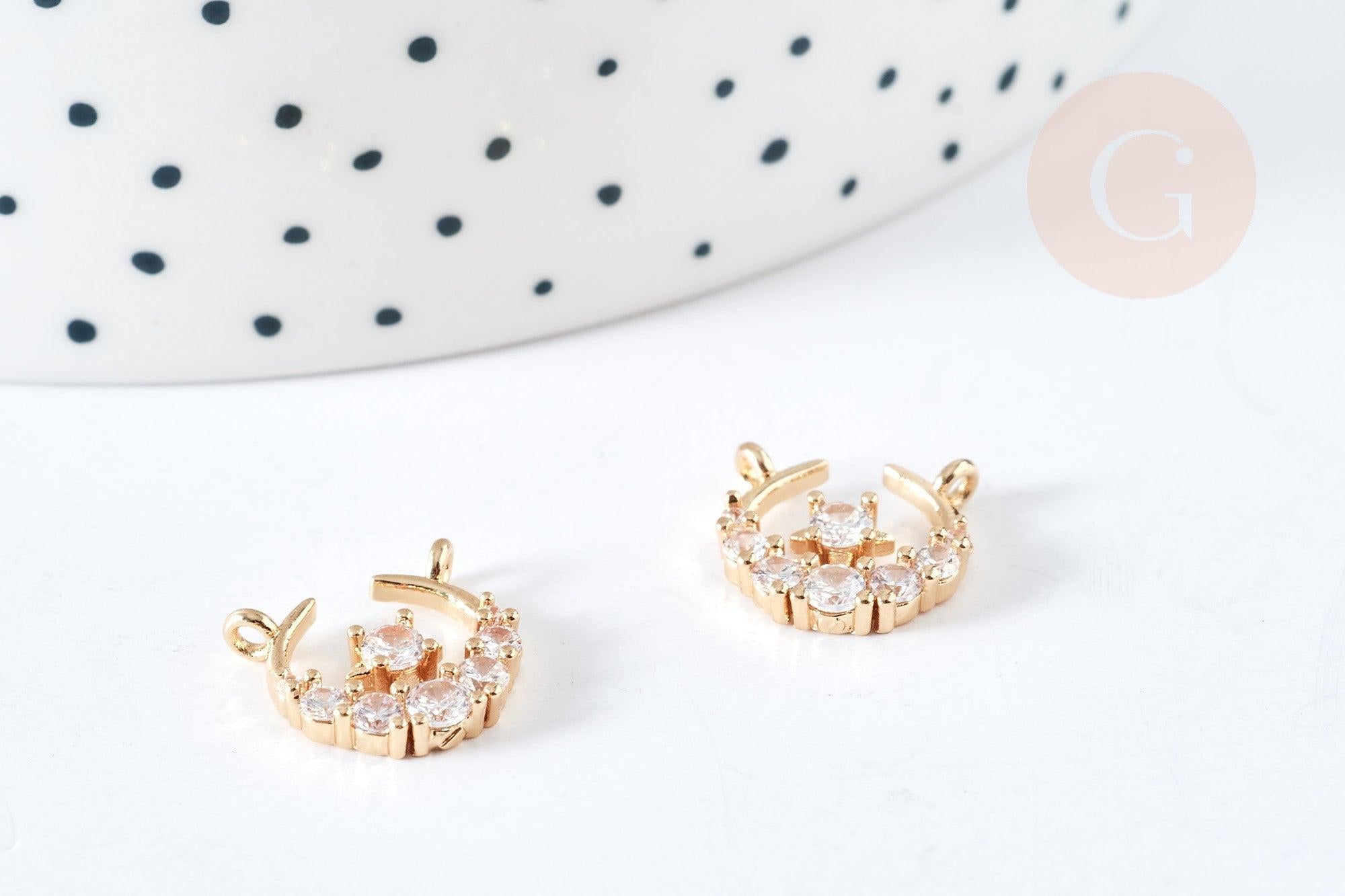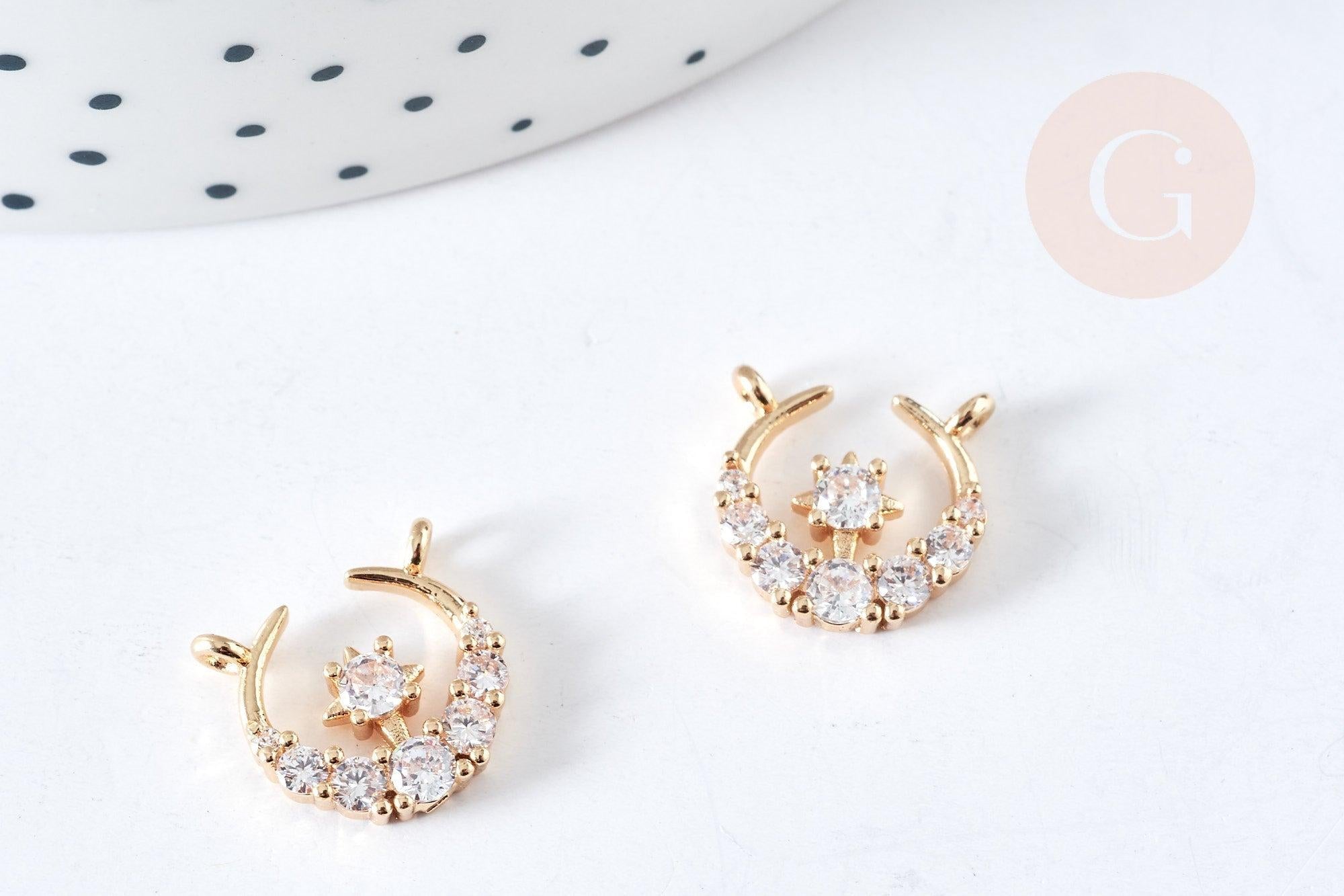 This delightful crescent moon connector pendant is made of gold-tone brass, set with sparkling white zirconia for an elegant and sophisticated look.
