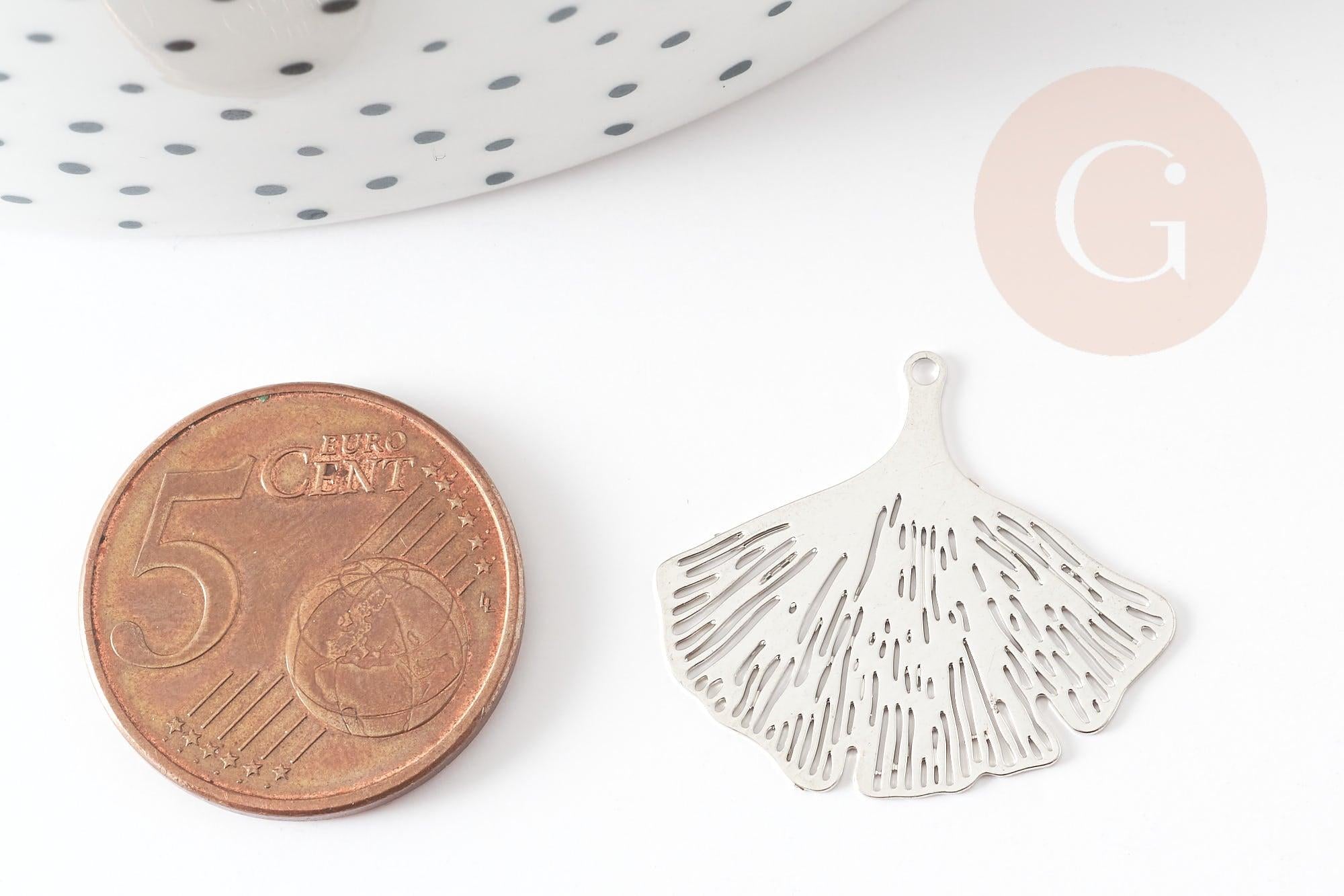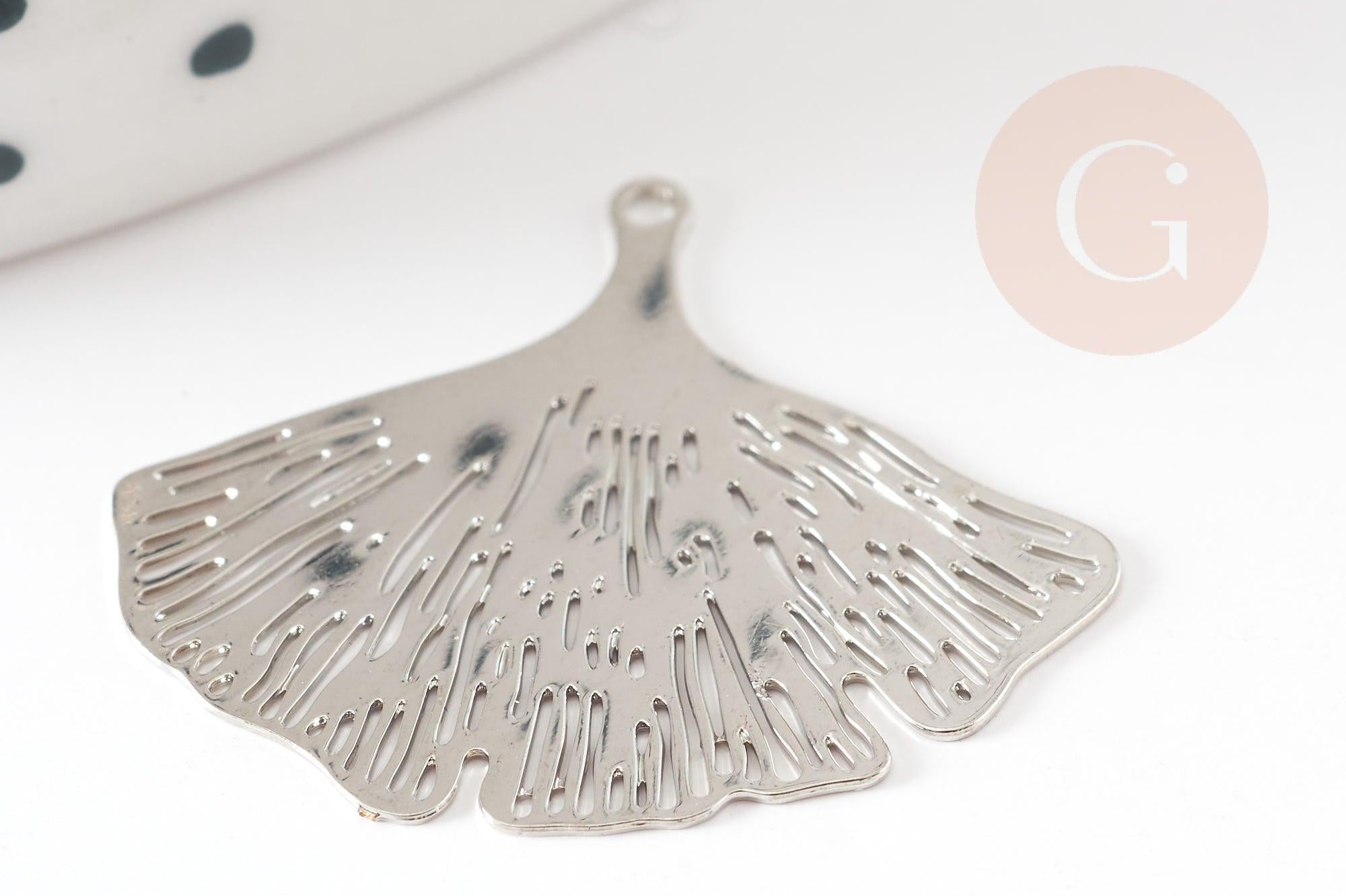 Pendentif estampe filigrane feuille gingko laiton argenté, Pendentif très fin et léger, 25x22mm x2 (G3700)