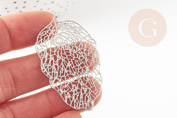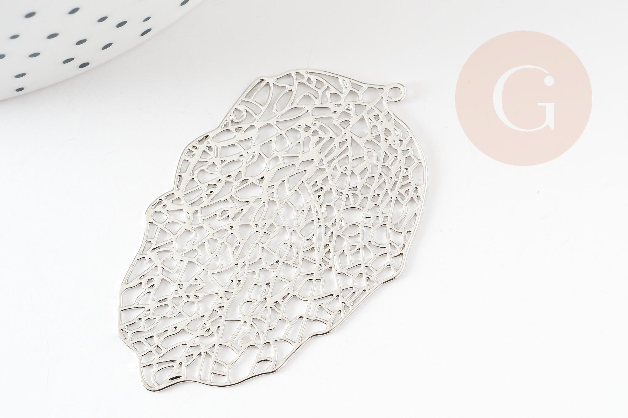 Filigree stamped pendant with geometric lace leaf design, brass and platinum finish, 51.5mm. Very thin and lightweight pendant for jewelry making, x1 (G9270)