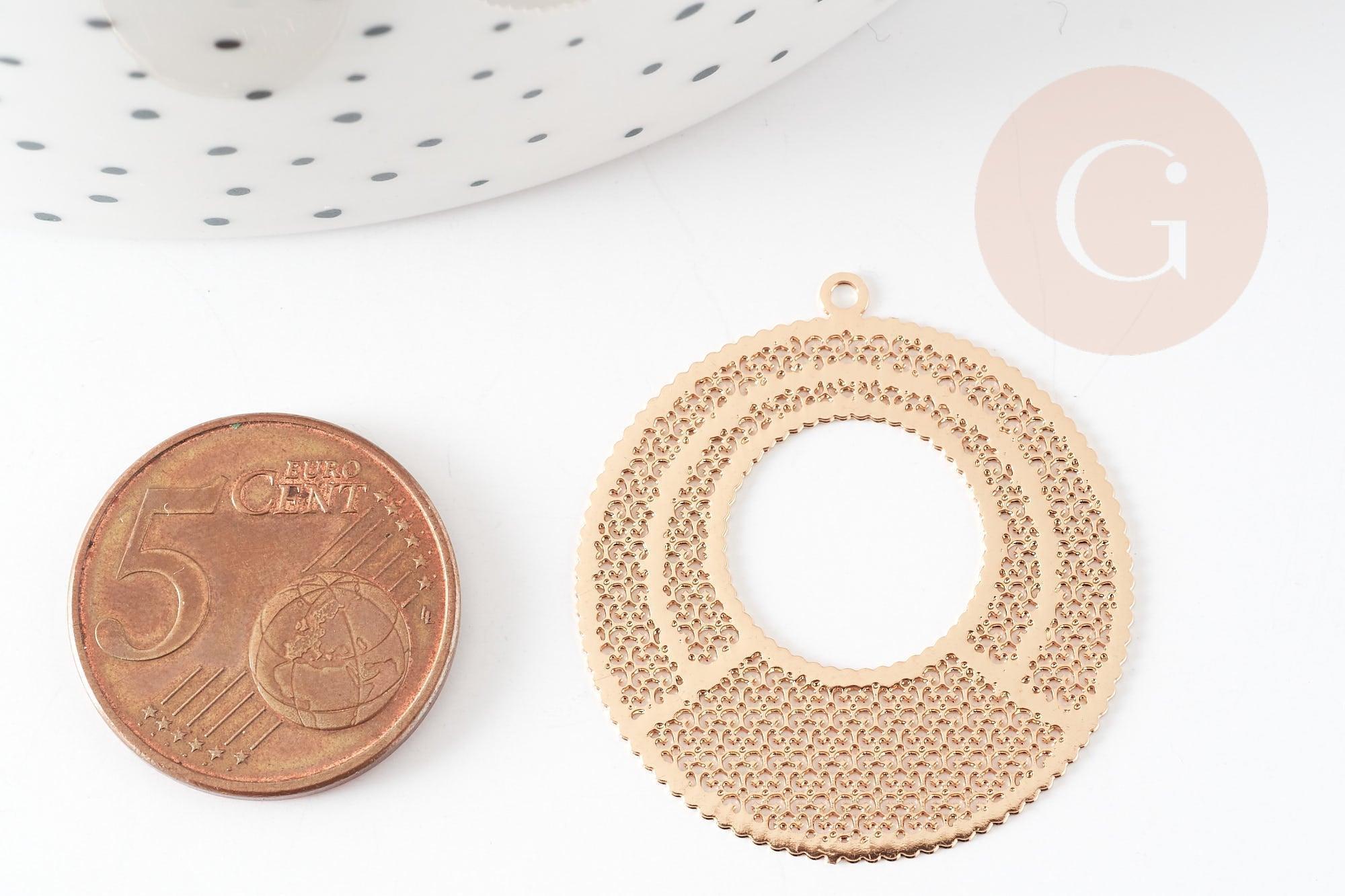 Discover our 33 mm round filigree lace print pendant in gold-plated brass . This pendant combines finesse, lightness and a delicate aesthetic to create unique and refined jewelry. This set includes two round print pendants in gold-plated brass.