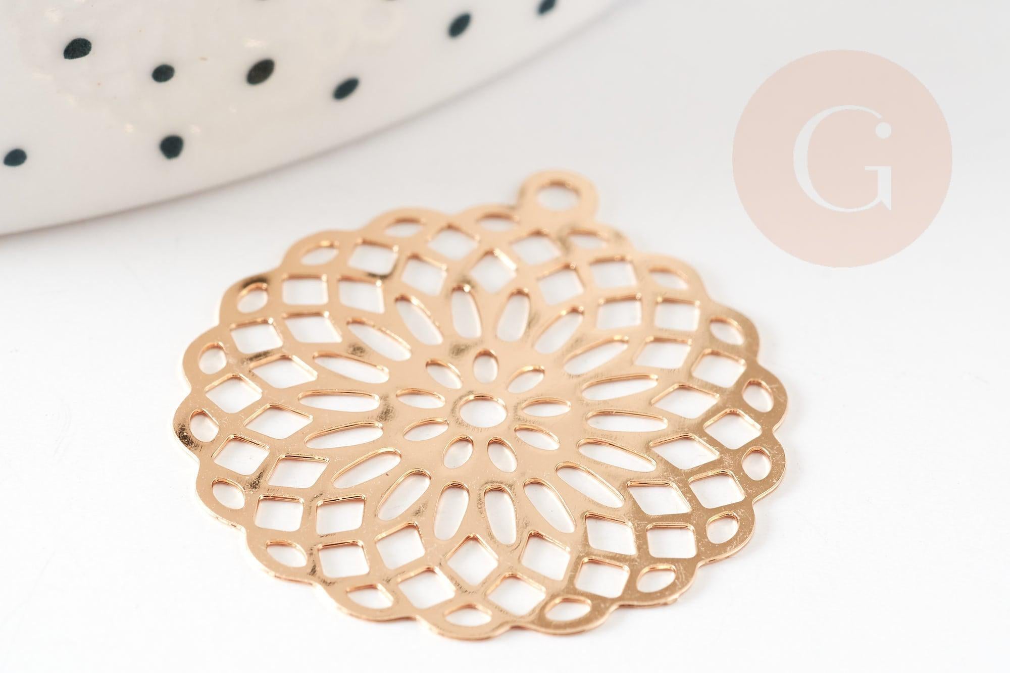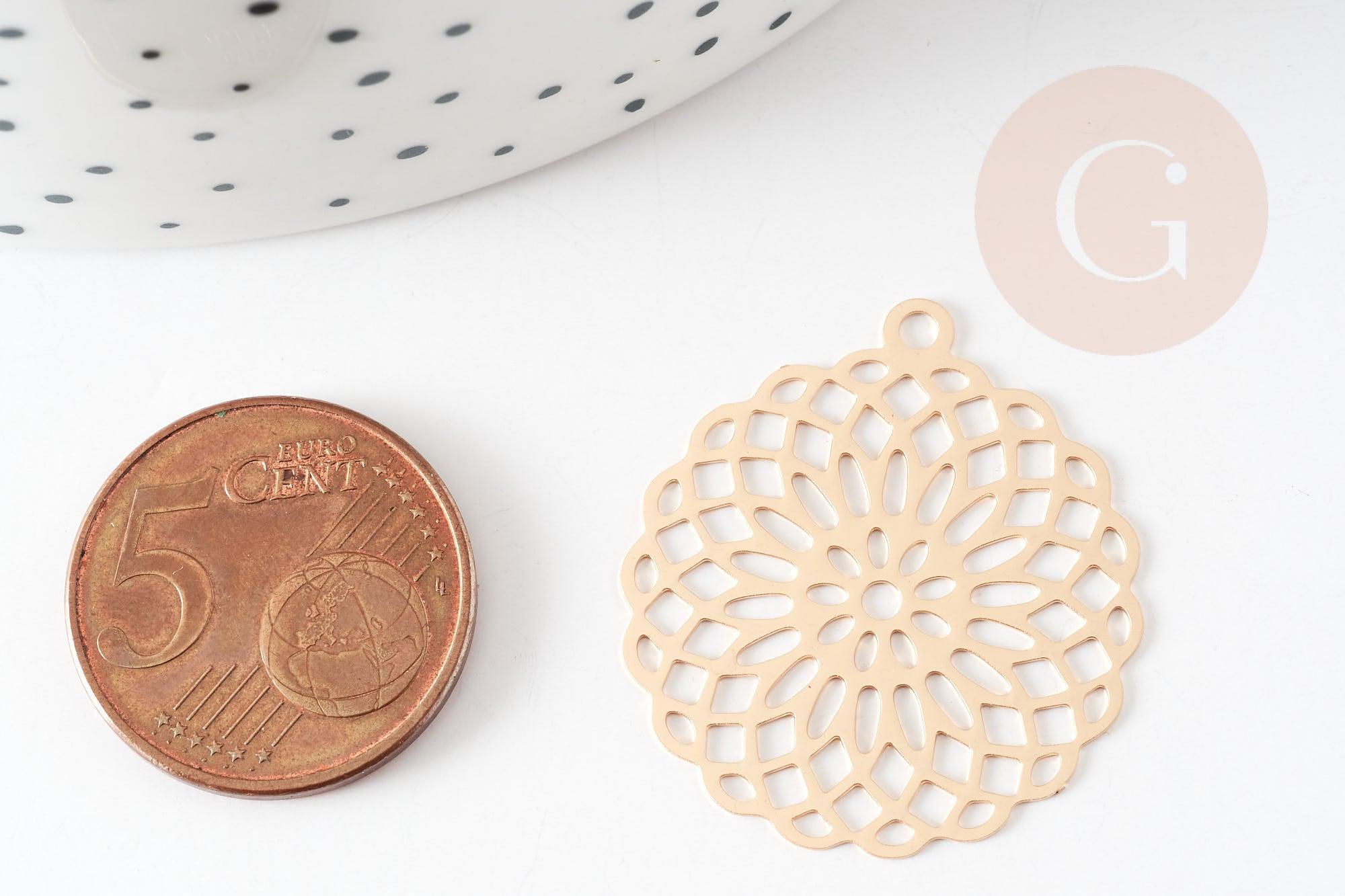 A round filigree flower print pendant in gold-plated brass . A lightweight pendant, ideal for making earrings, necklaces and long necklaces.