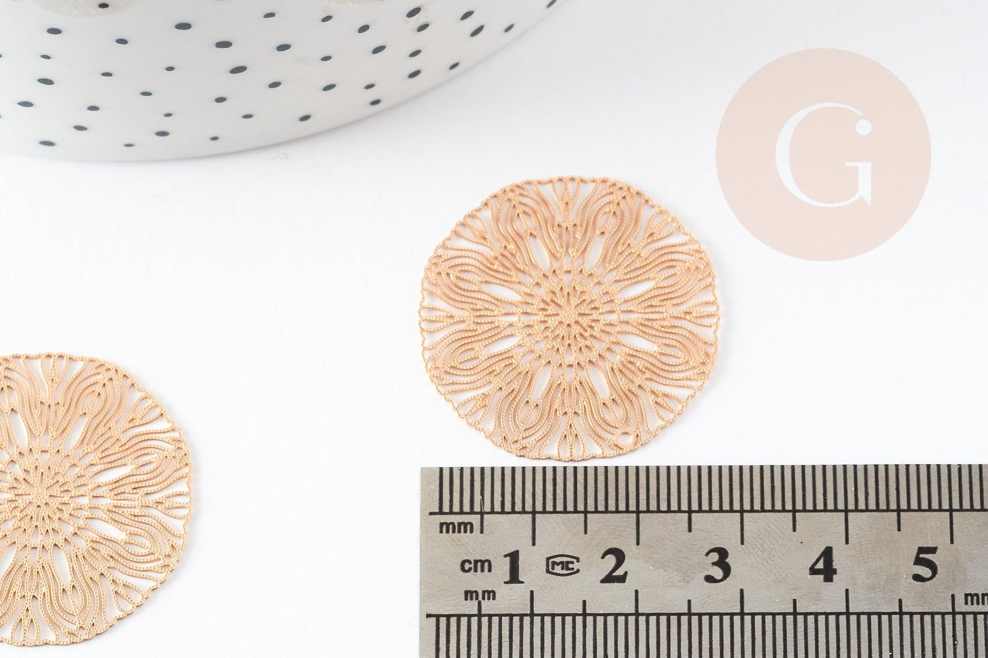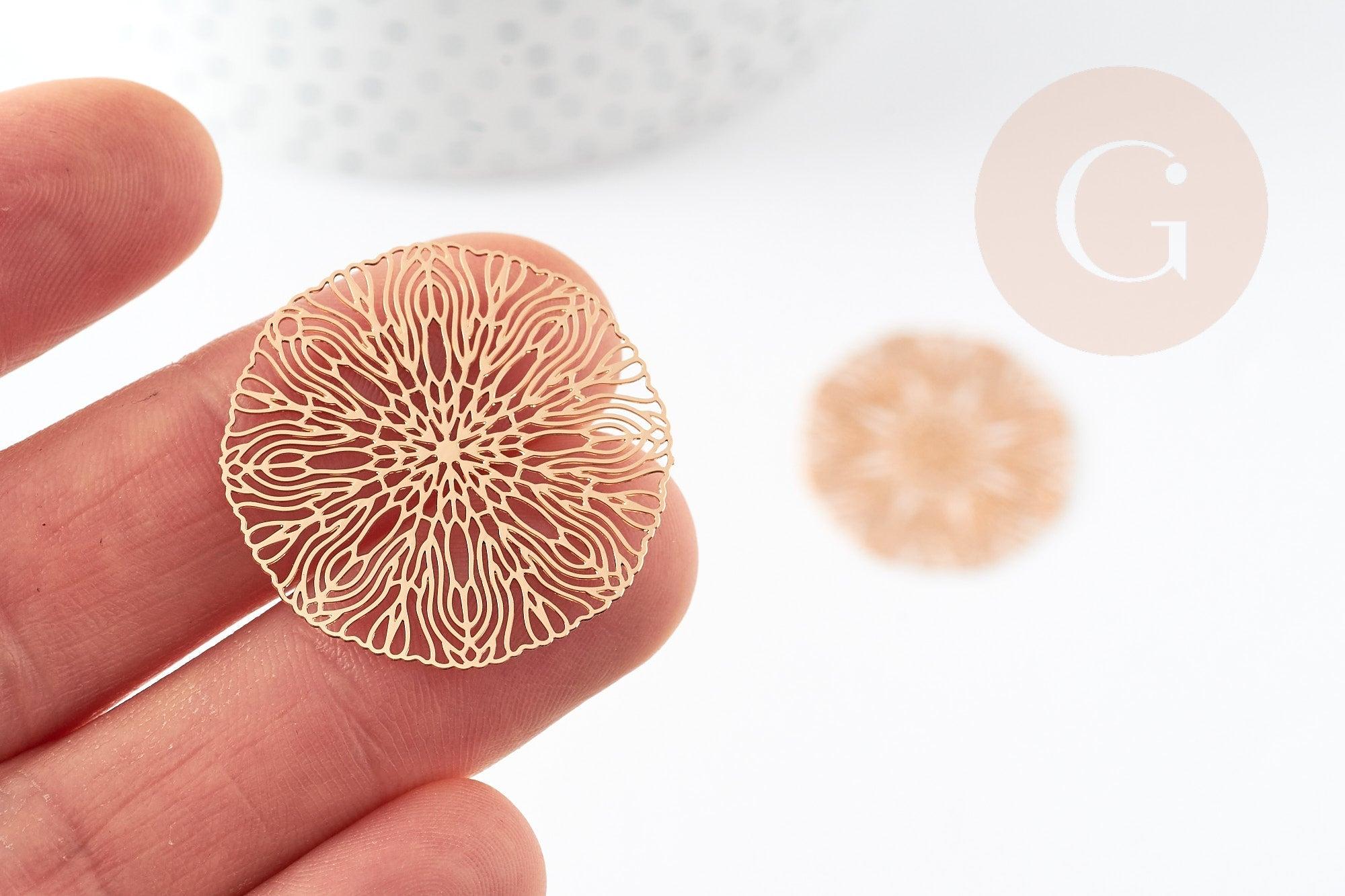 Add a delicate and artistic touch to your jewelry creations with our round filigree print pendant, representing a flower, in golden brass .