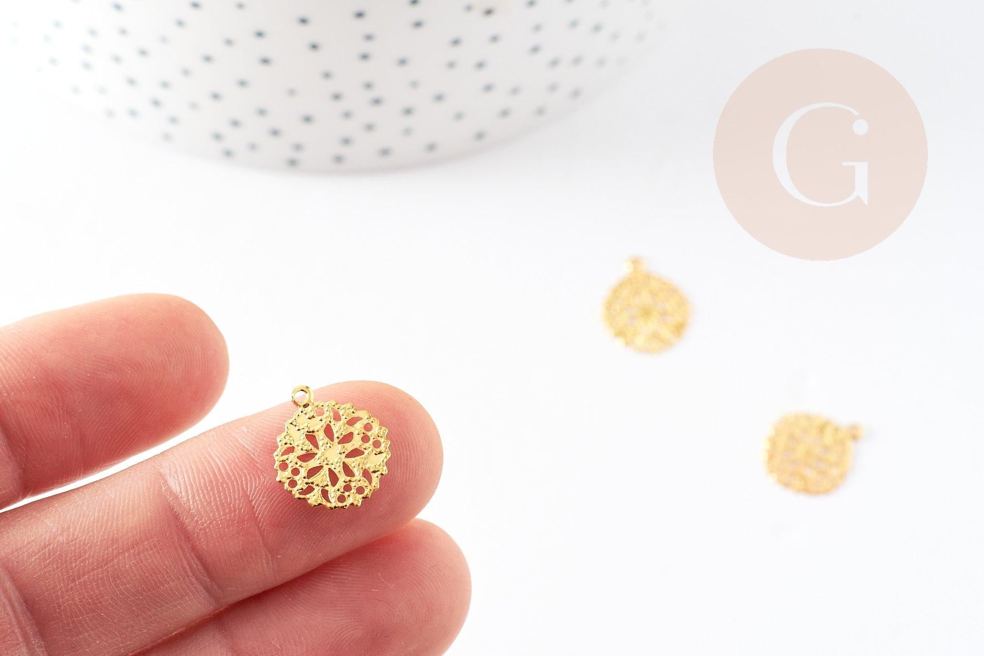 Give your jewelry designs a luxurious shine with this 15mm gold-tone brass filigree flower pendant . Its elegant and timeless lace aesthetic offers a glamorous and sophisticated touch to any outfit. Refined pieces, both interesting and durable, for unique jewelry.