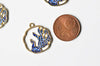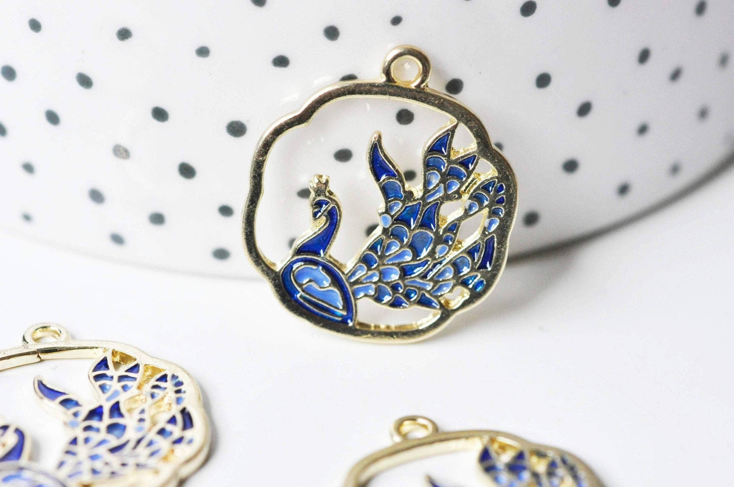 A lovely set of two peacock pendants in gold-plated zamac covered with blue enamel