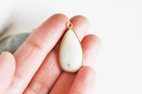 The natural amazonite teardrop pendant instantly adds a soft and elegant mineral touch to your creations. Its teardrop shape, enhanced by a gold-plated brass setting, makes it an essential component for designing bohemian, feminine, or spiritual jewelry. Amazonite, known for its soothing blue-green hues, pairs beautifully with gold and natural stones.
