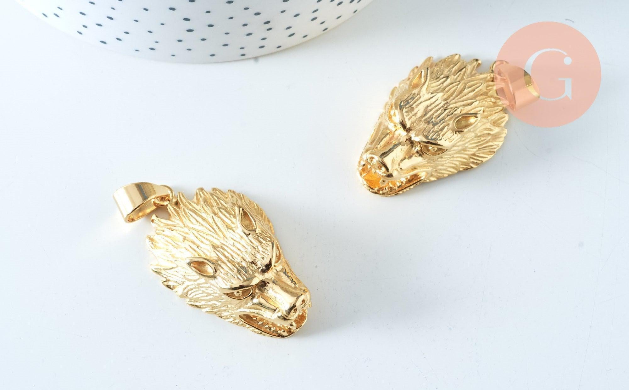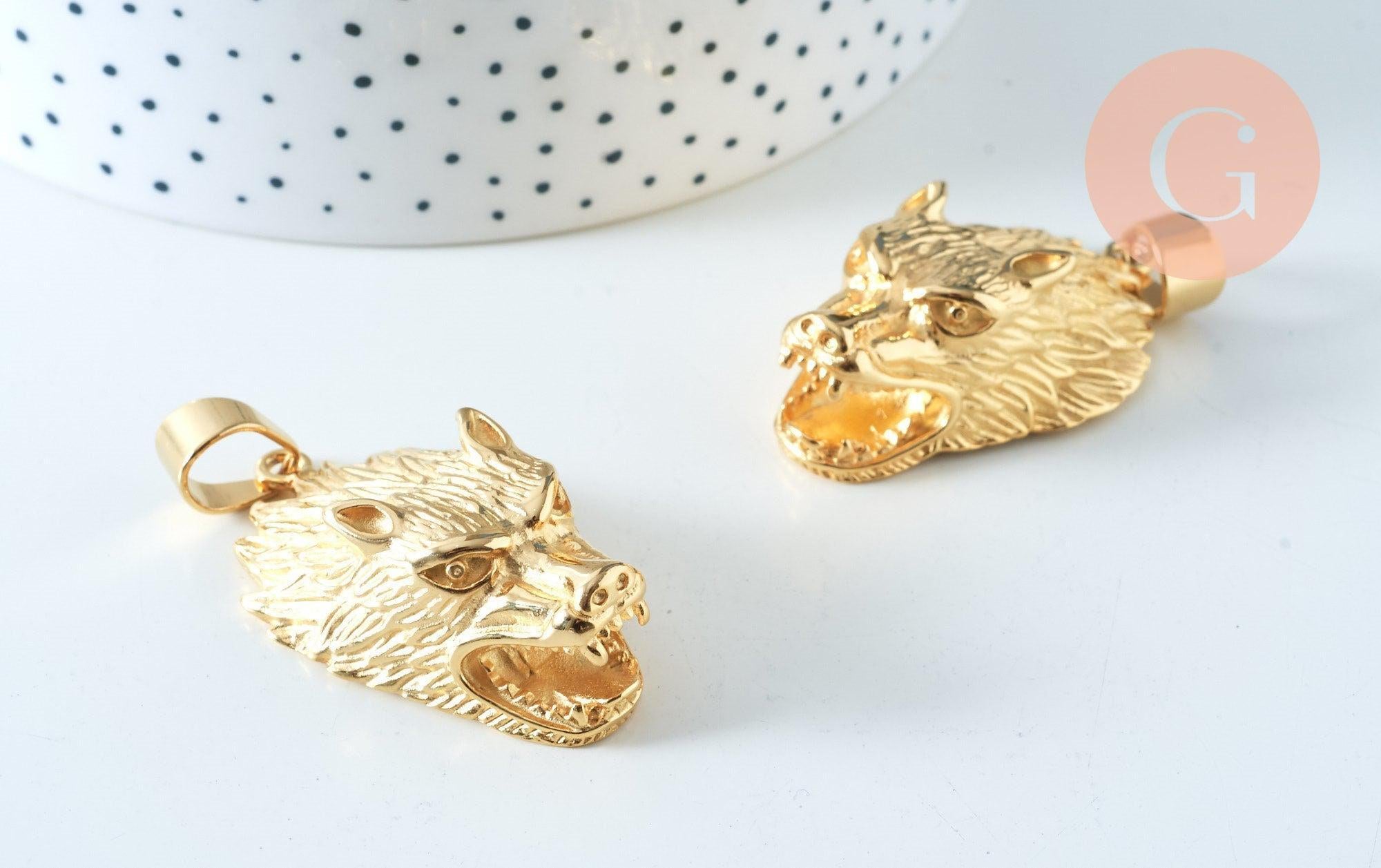 Pendentif loup acier 304 inoxydable doré 47.5mm, x1 (G6013)
