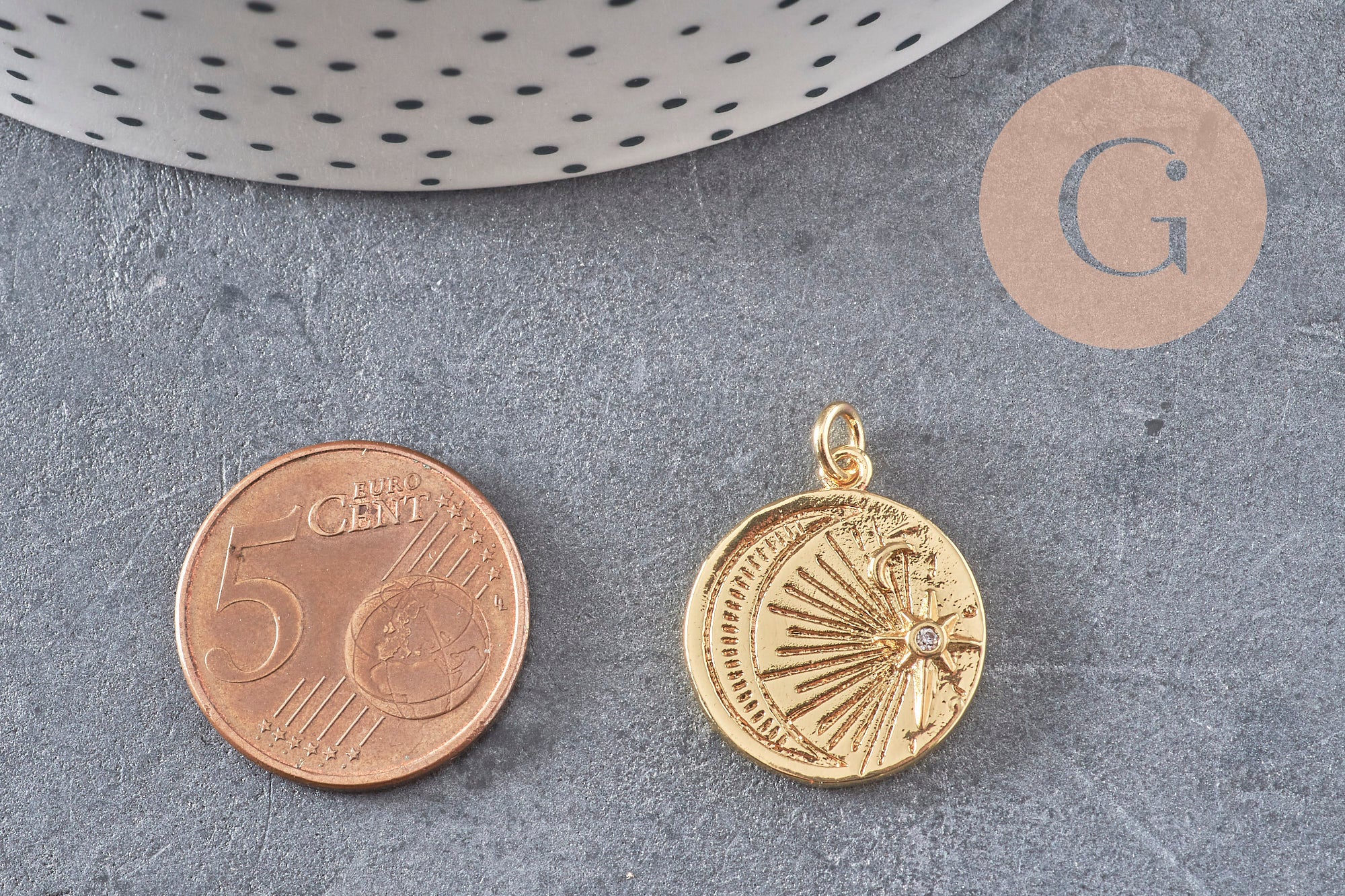 A pretty round textured medal in 16K gold-plated brass decorated with a star encrusted with a white zircon, representing a moon and stars.