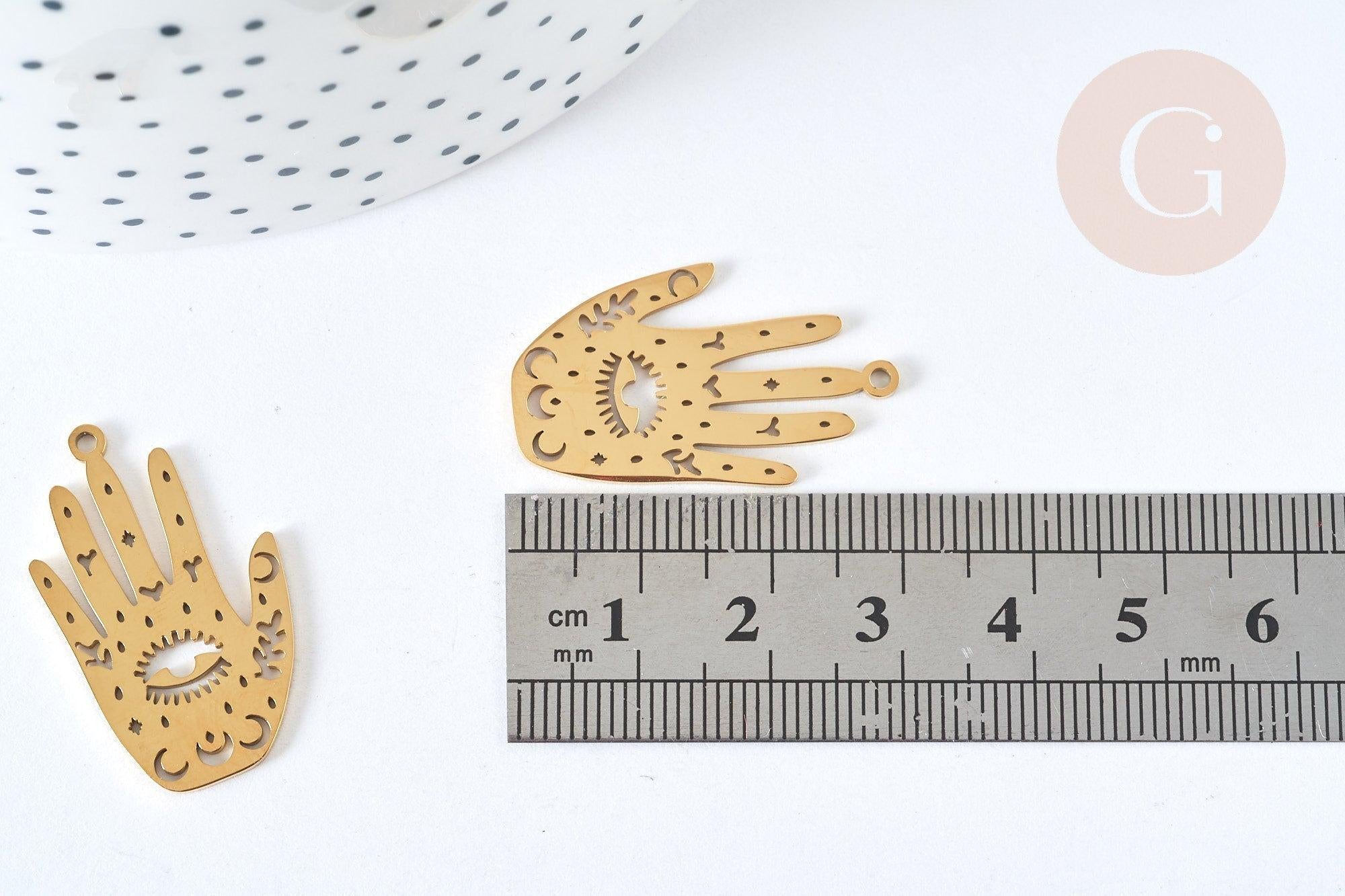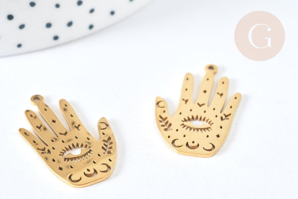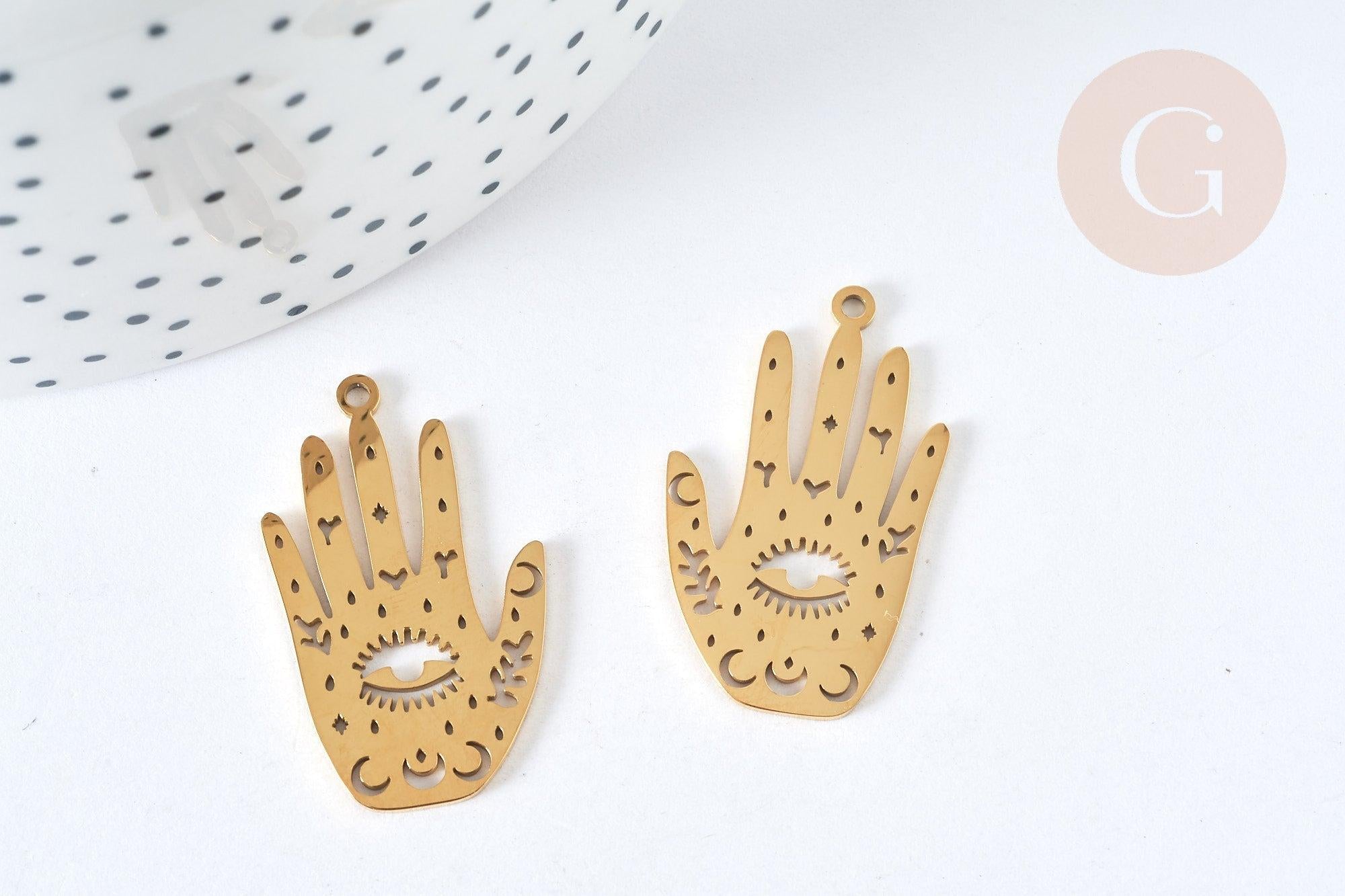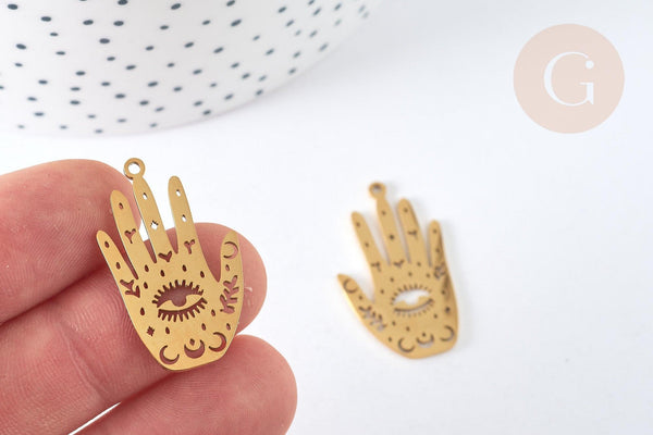 This pendant in 201 gold stainless steel has the shape of a mystical hand composed of a moon, with a central eye. This will allow you to create incredible DIY costume jewelry on the theme of mystical jewelry, oracles.