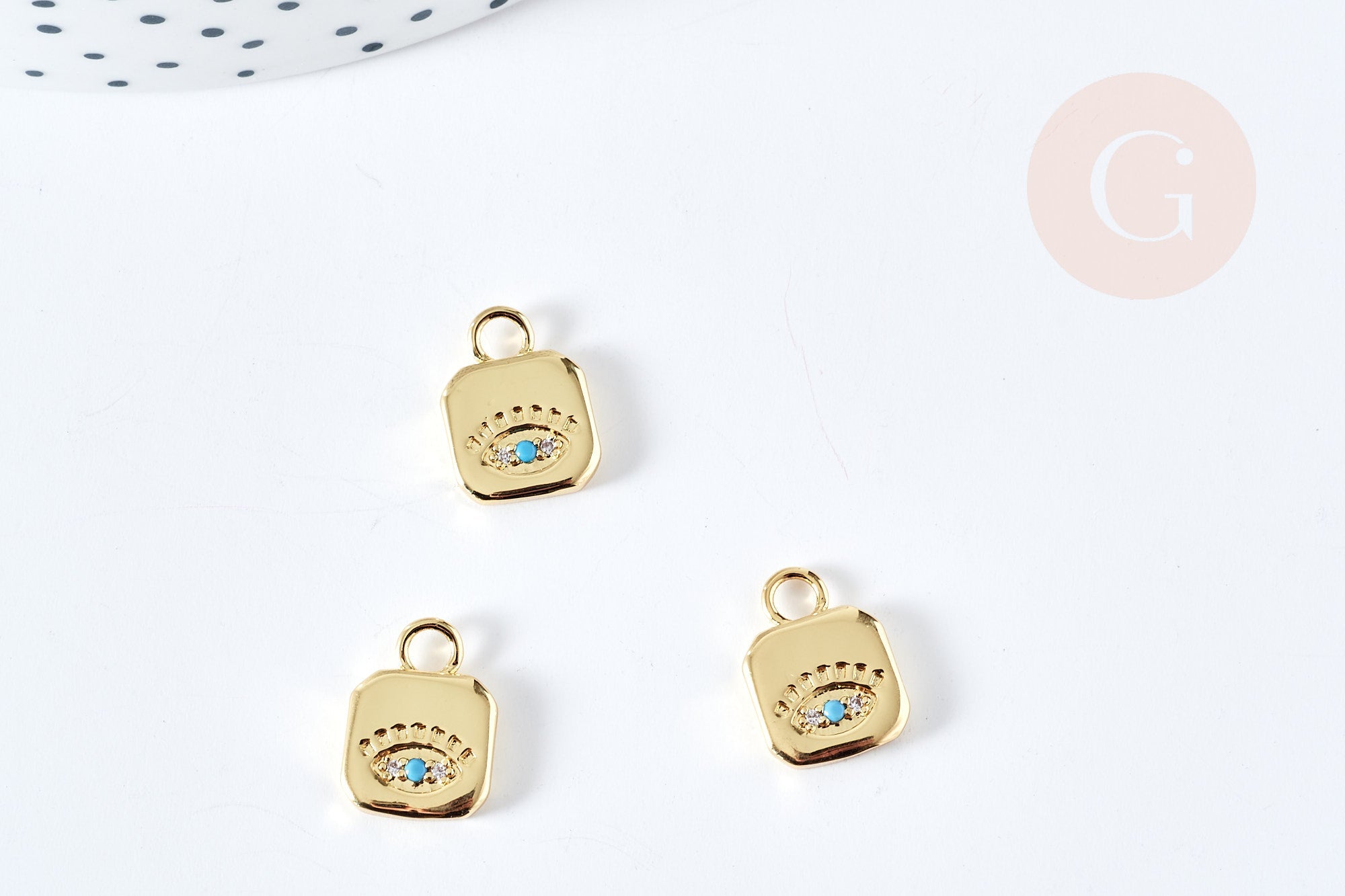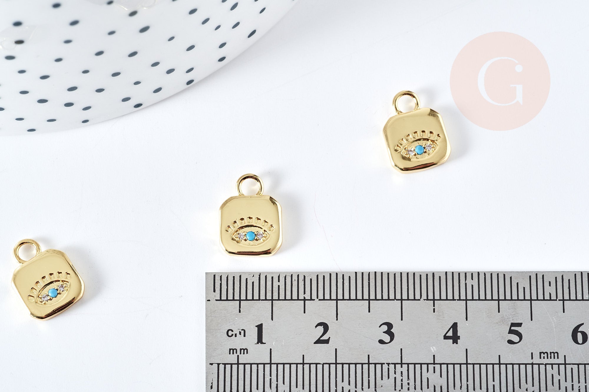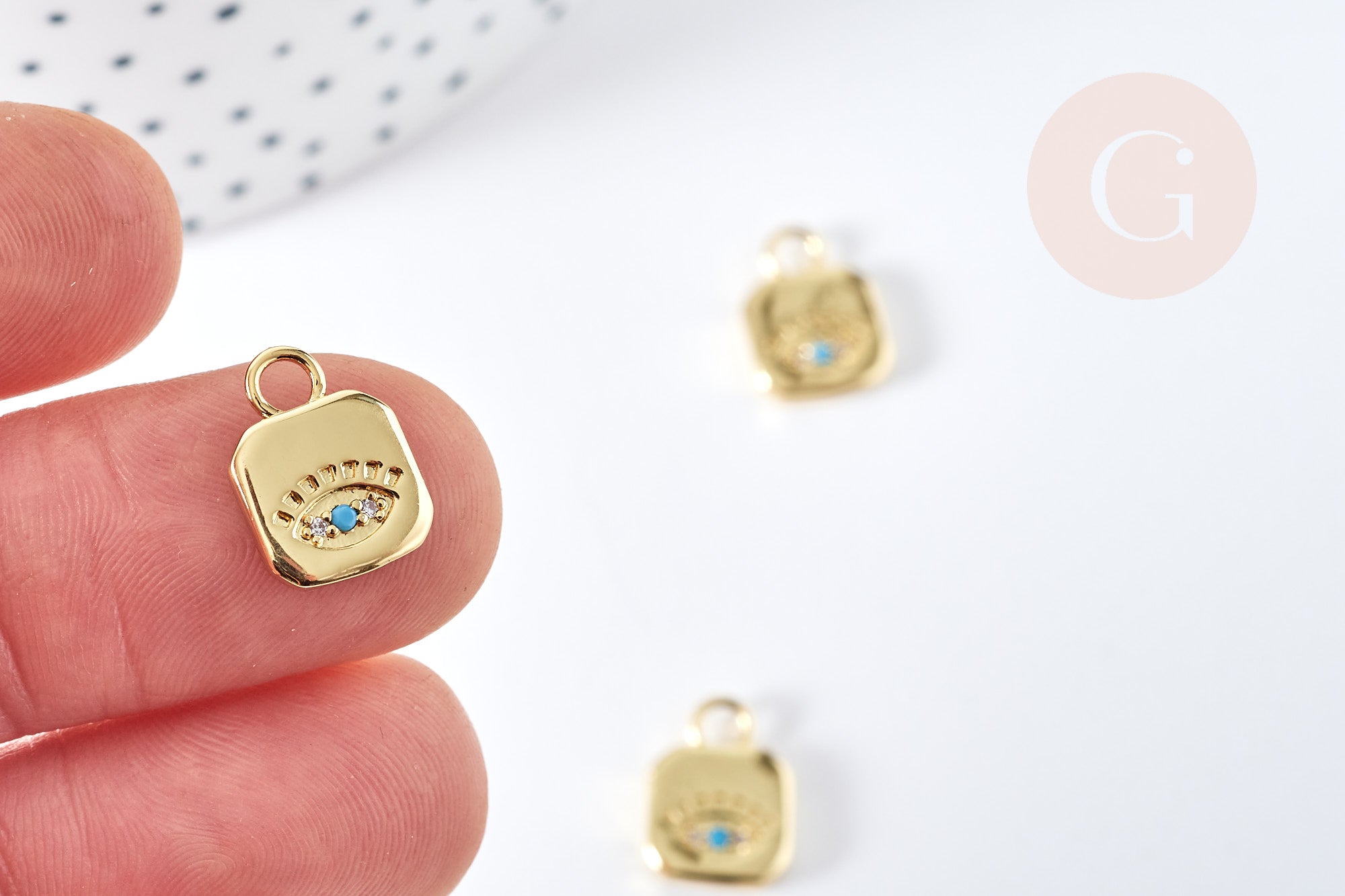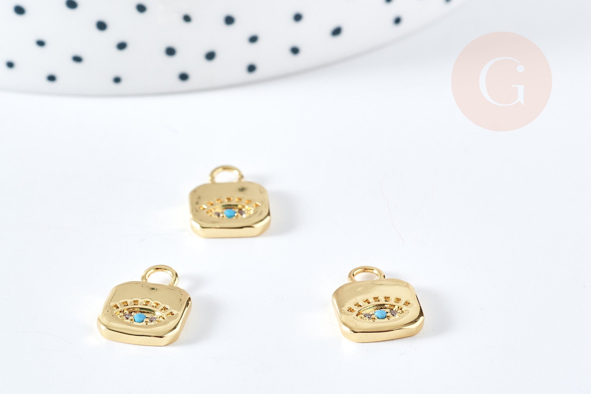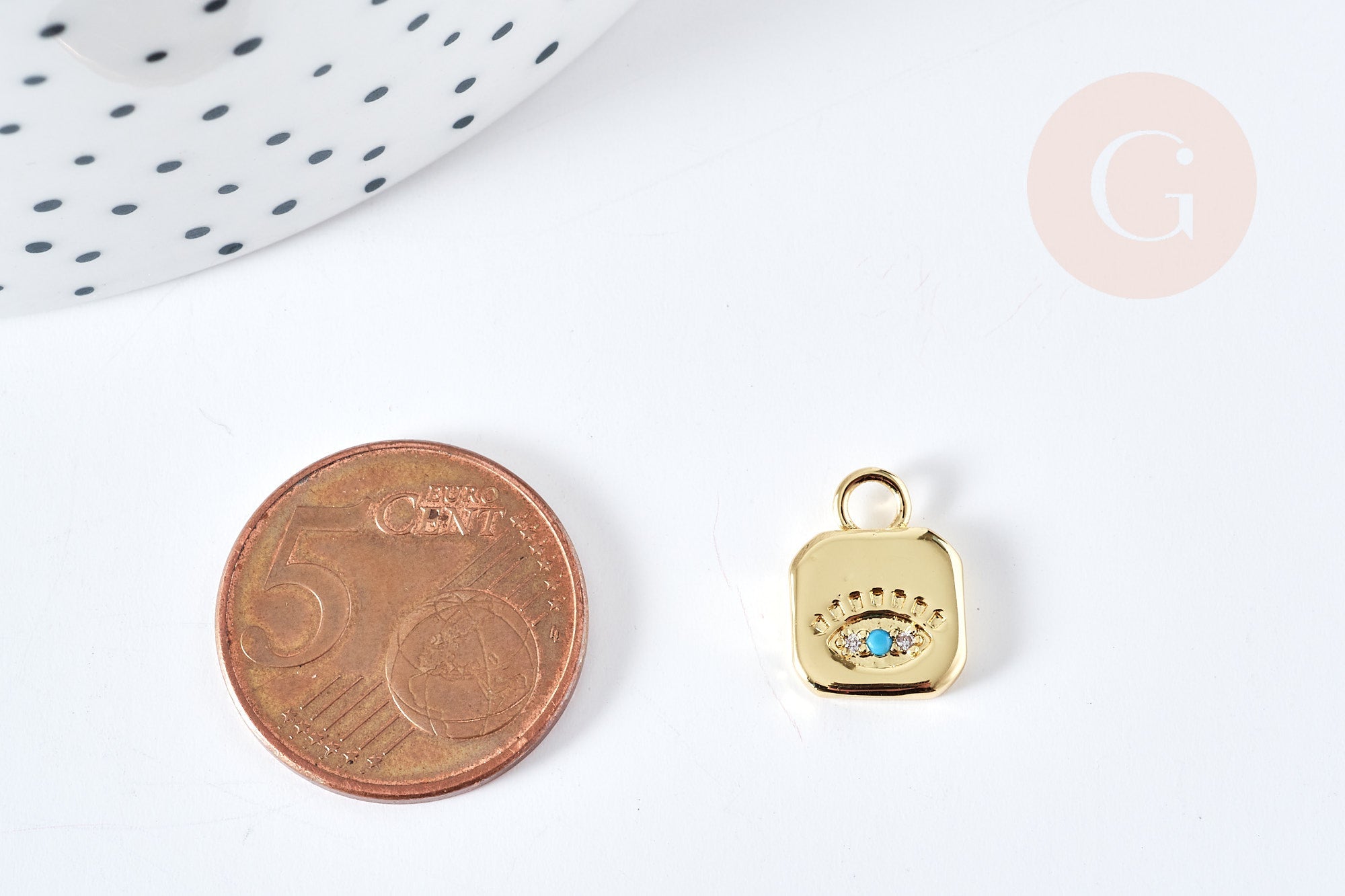 Square medal pendant protective eye gold-plated brass zircon 13mm, gold pendant with crystals jewelry creation, x1 G8588