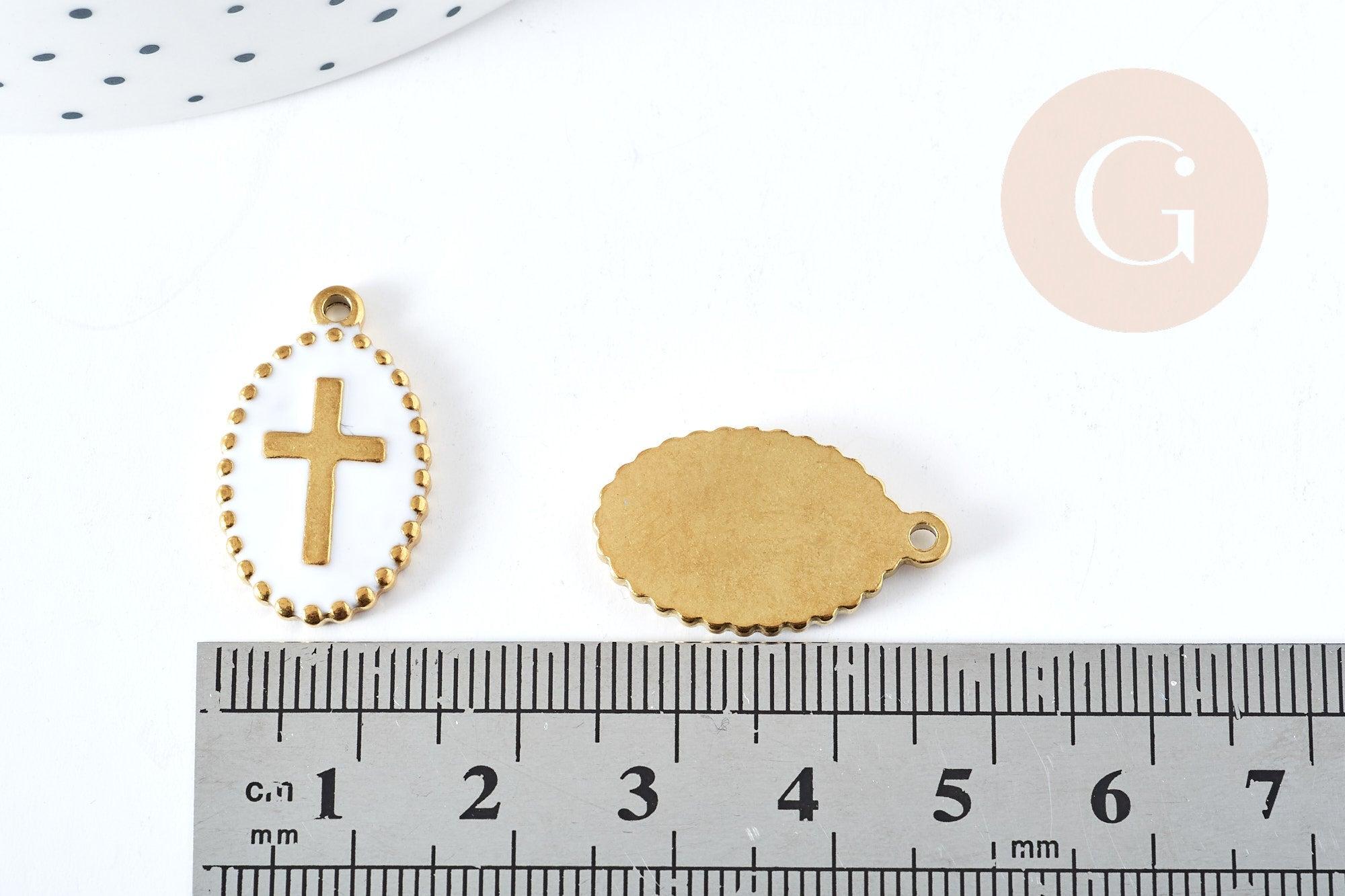 Pendentif médaille ovale croix émaillée acier 304 doré 18K inoxydable 23mm, x1 (G8717)