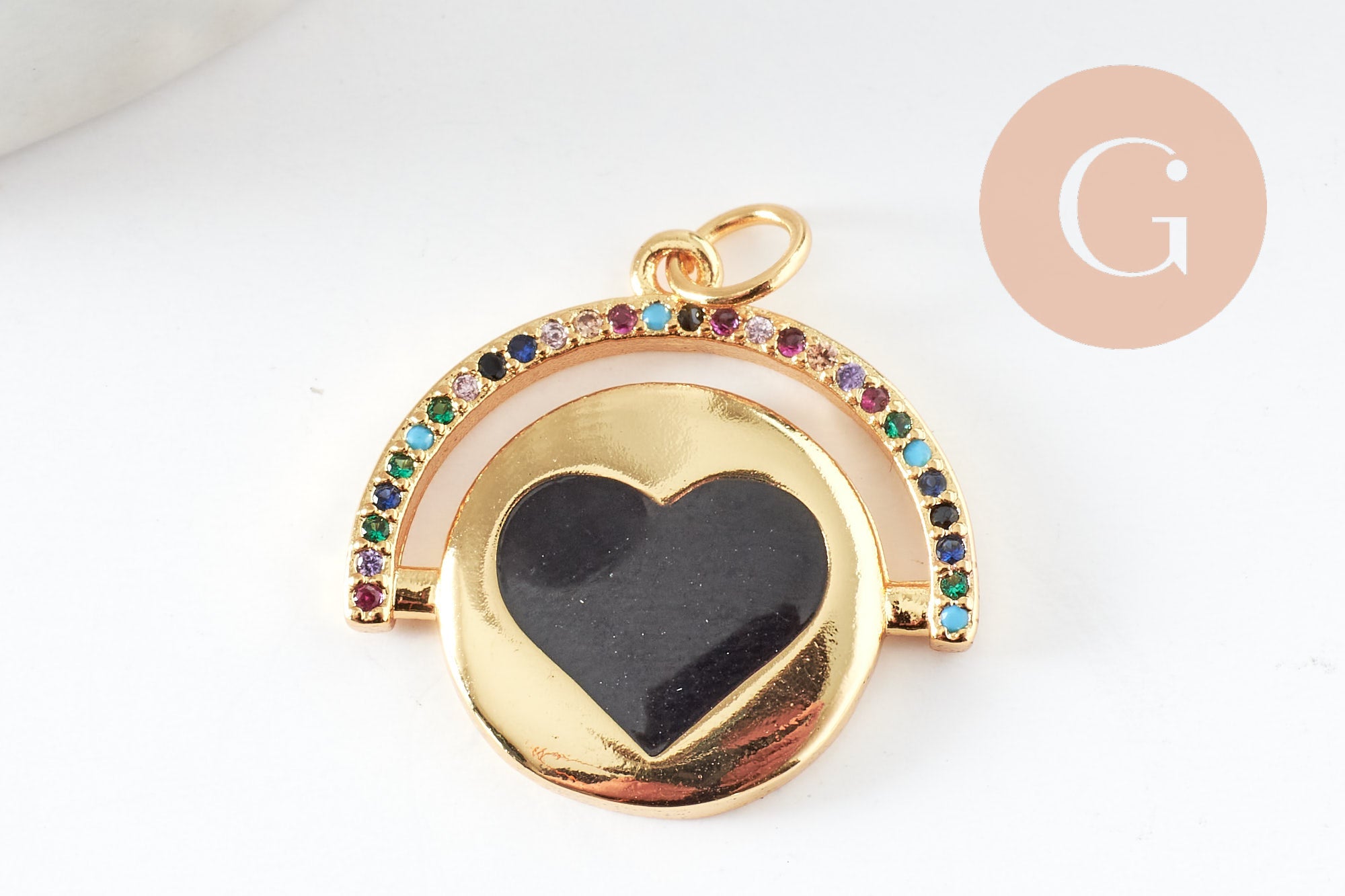 A pretty golden medal representing a heart enamelled with colored resin, decorated with a half circle in colored zircons.