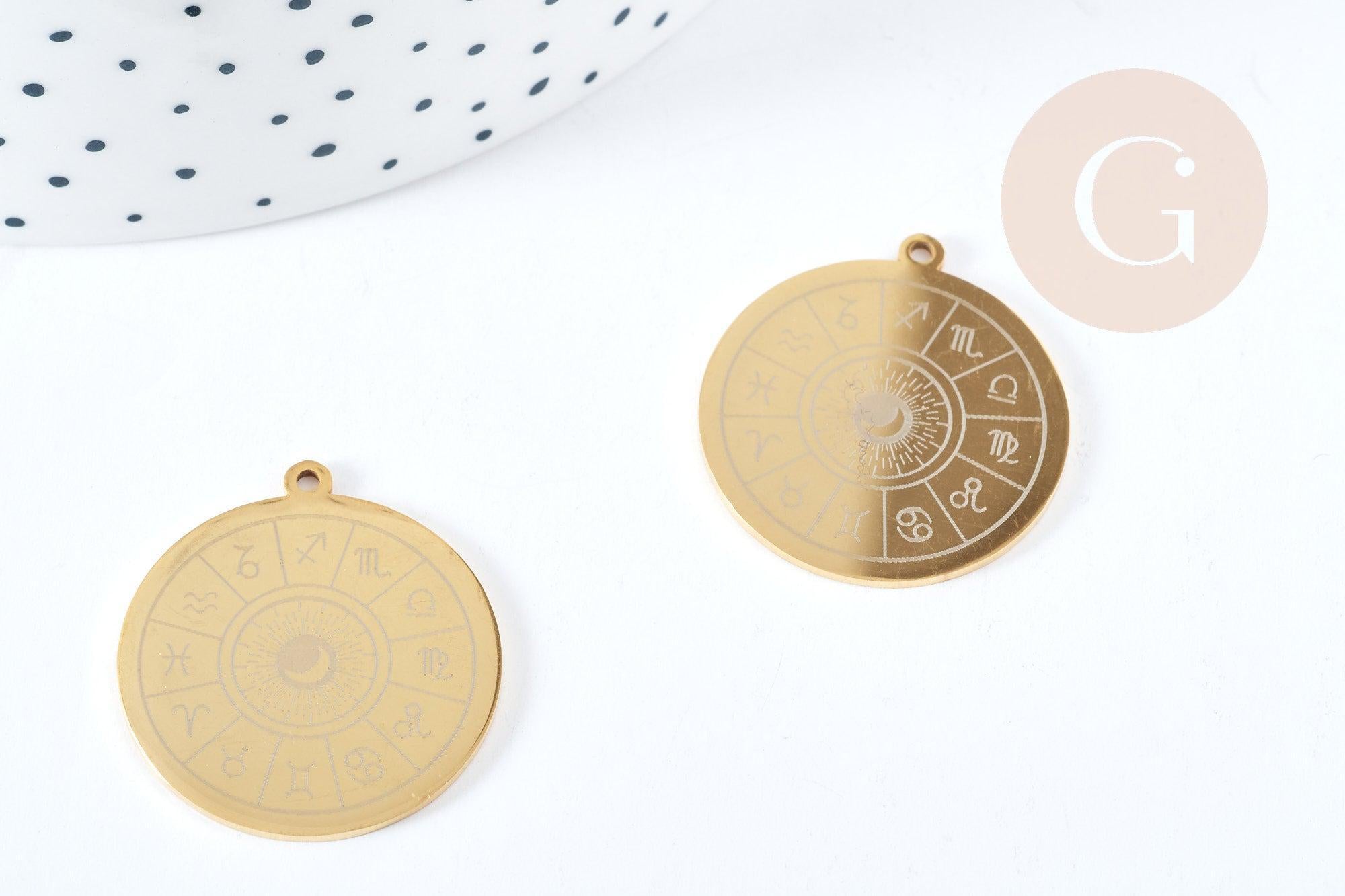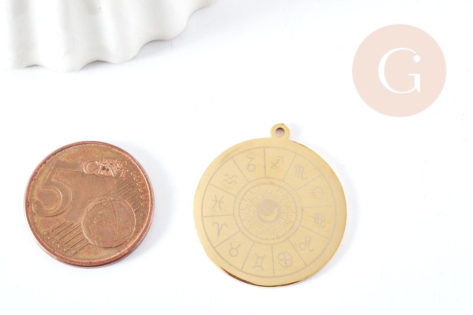 Pendentif médaille ronde astrologie acier 201 inoxydable doré 27.5mm, x1 (G6123)