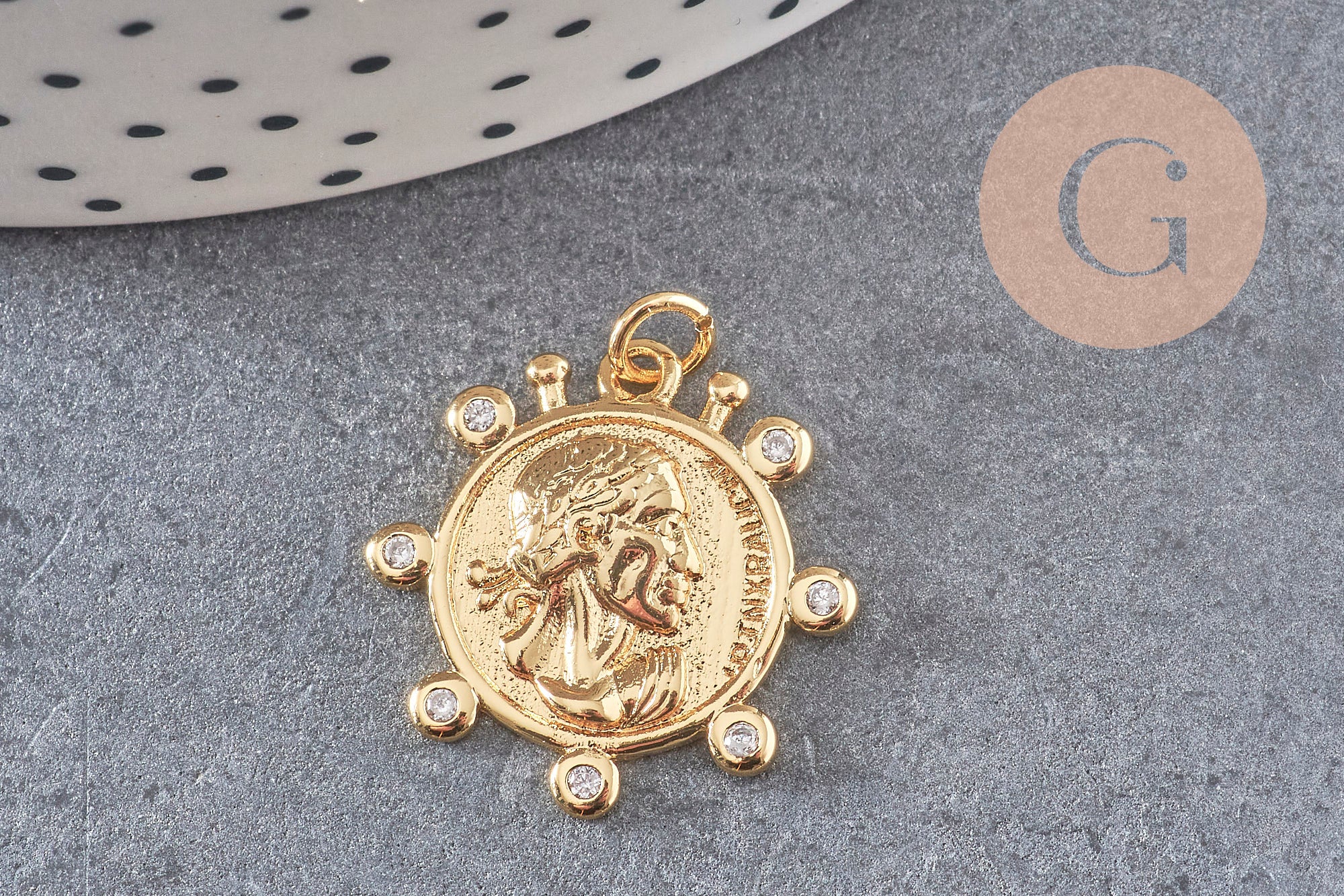 Round zircon coin medal pendant, golden pendant, medallion, gold metal, jewelry creation, gold medal, 21mmG3476
