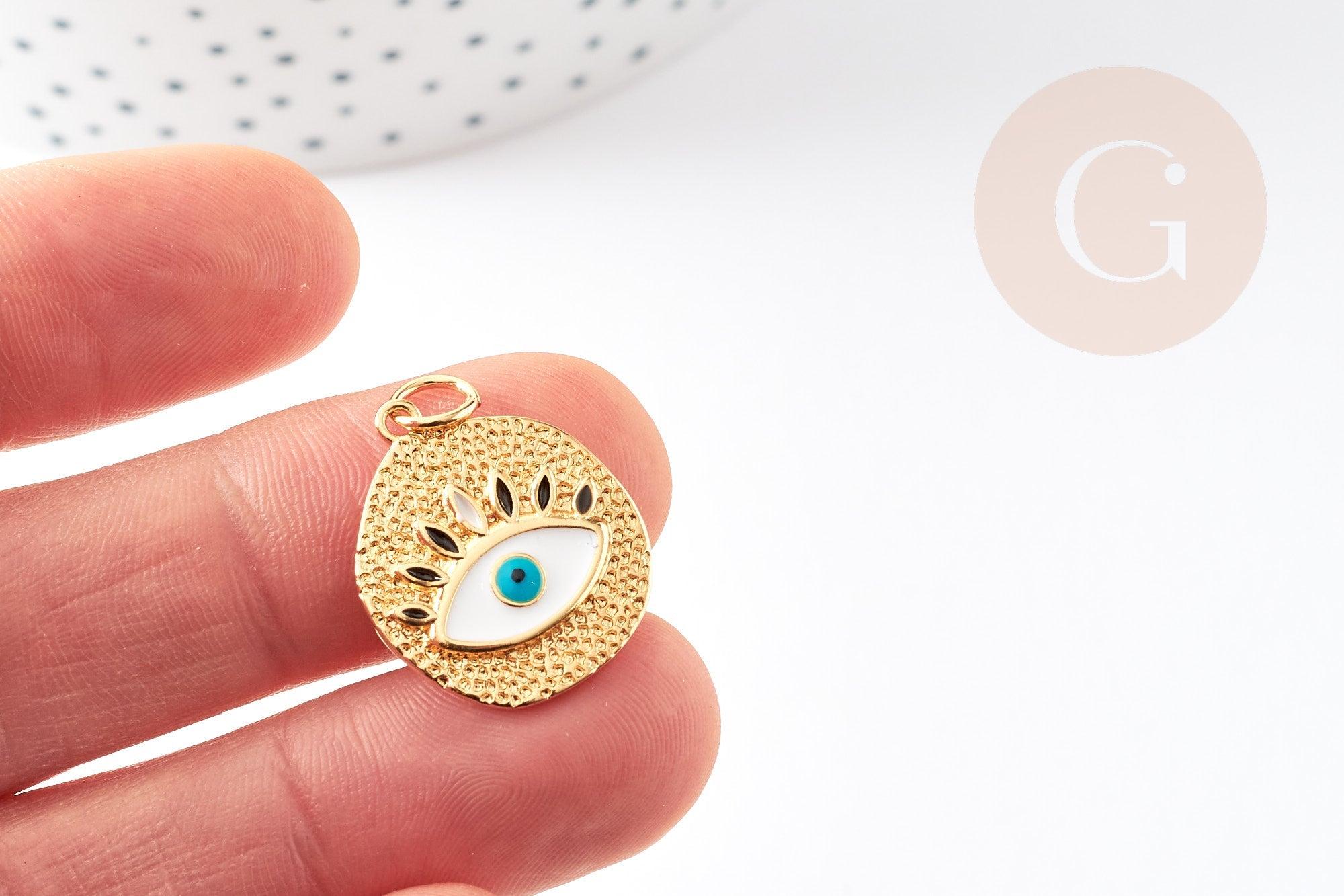 Pendentif médaille ronde oeil émail blanc laiton doré 18K et cristal zircon,pendentif laiton amour 22.5mm, x1 G3553