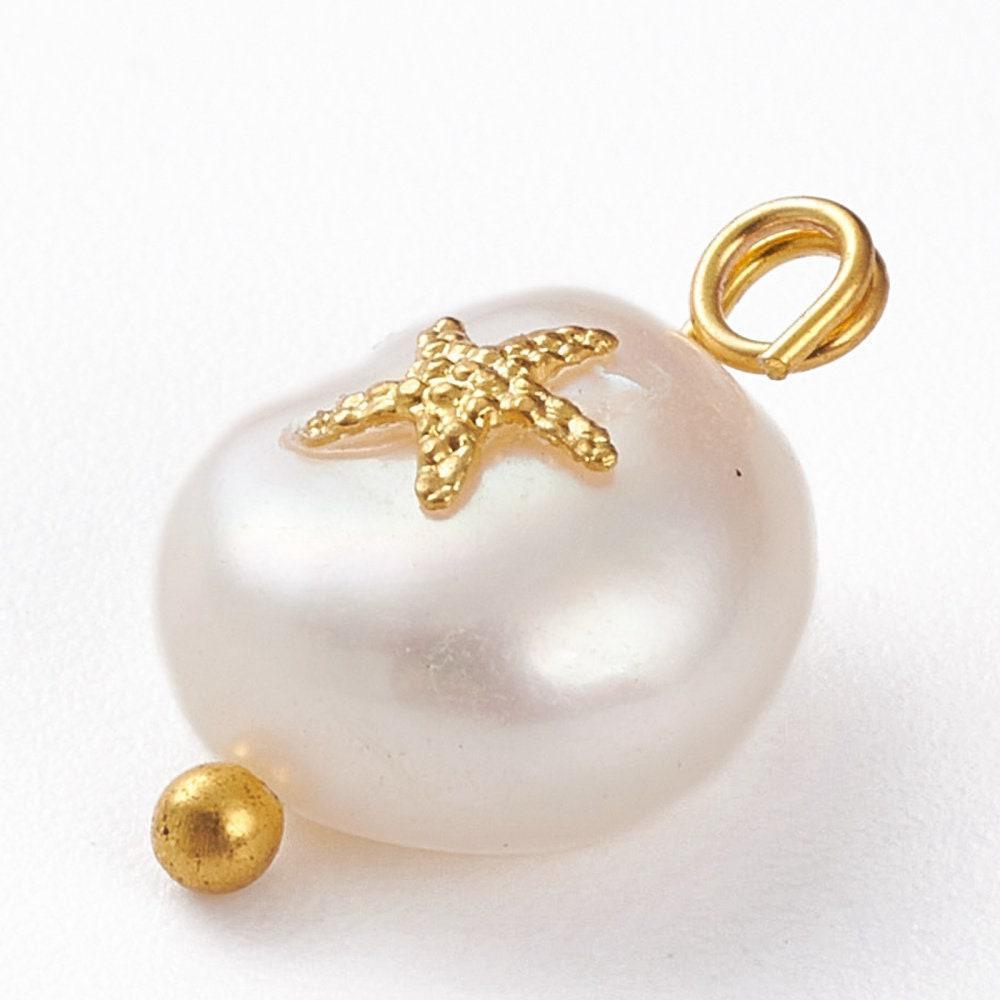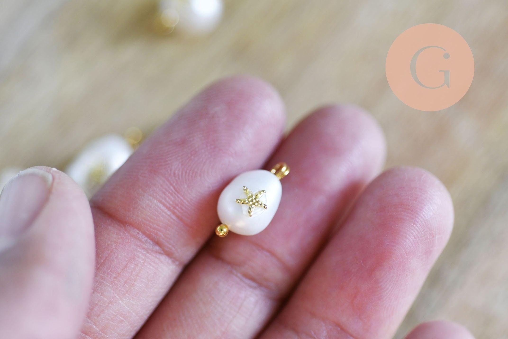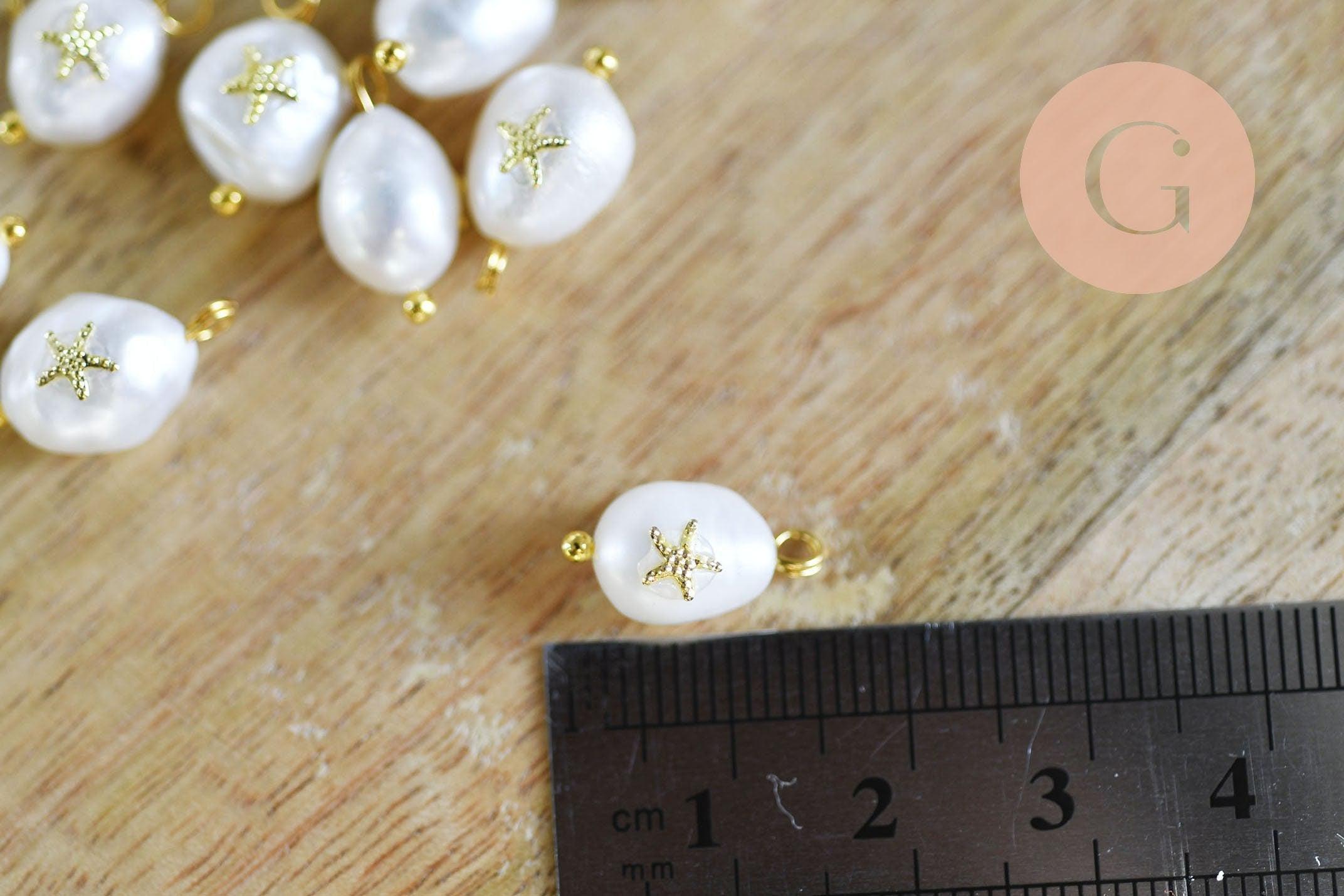A natural Keshi pearl pendant decorated with a gold-plated zamac starfish finding, mounted on a gold-plated brass base. Its irregular shape makes it particularly suitable for creating original and trendy DIY jewelry!