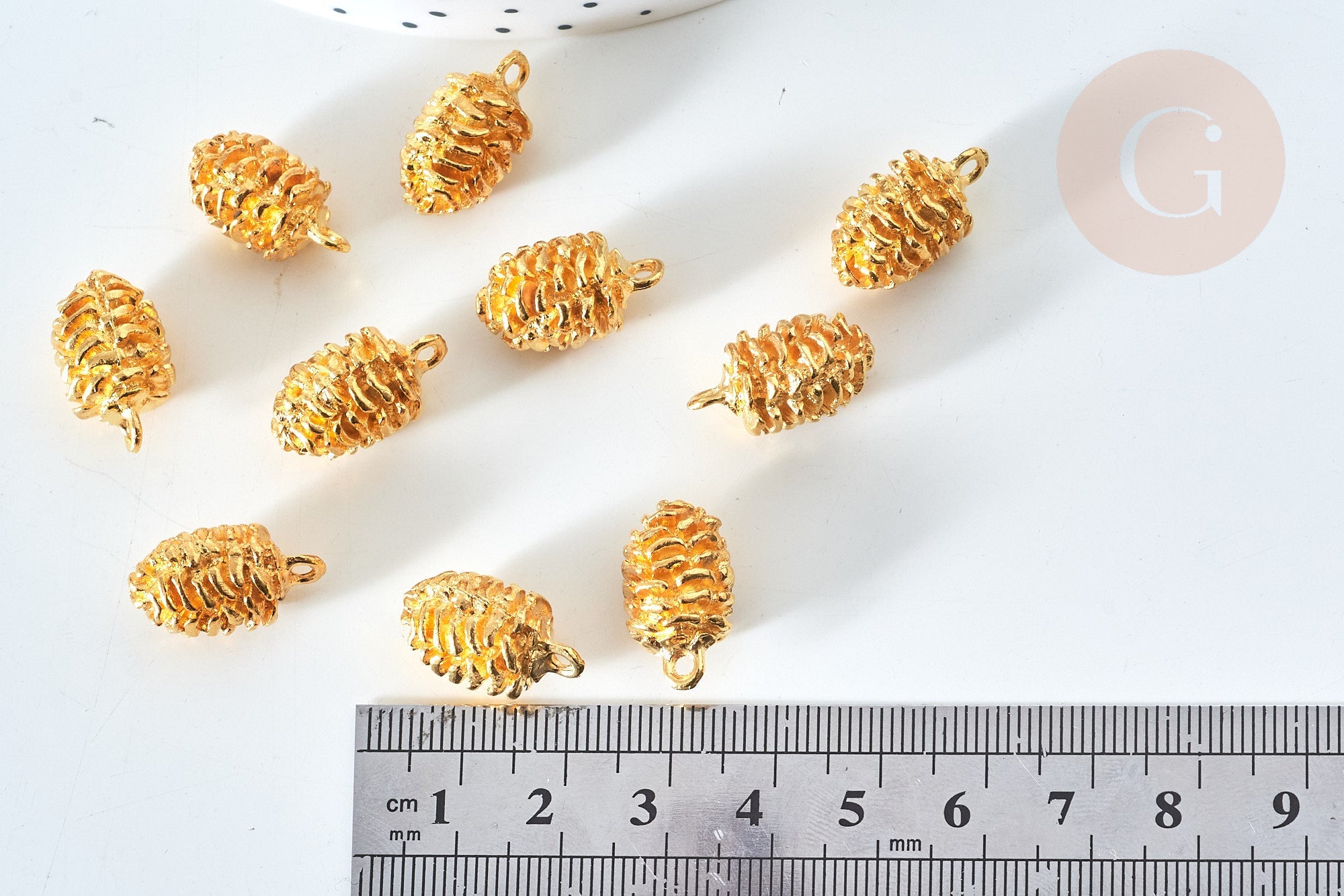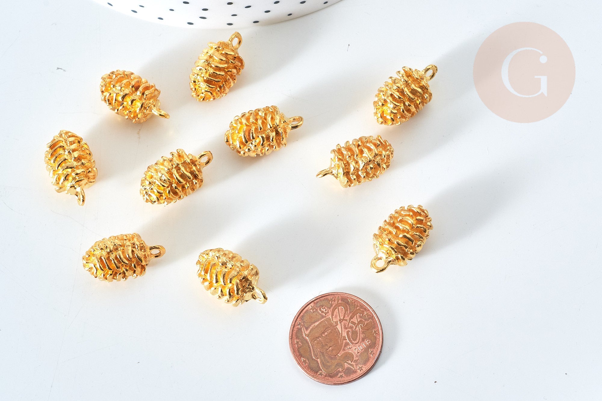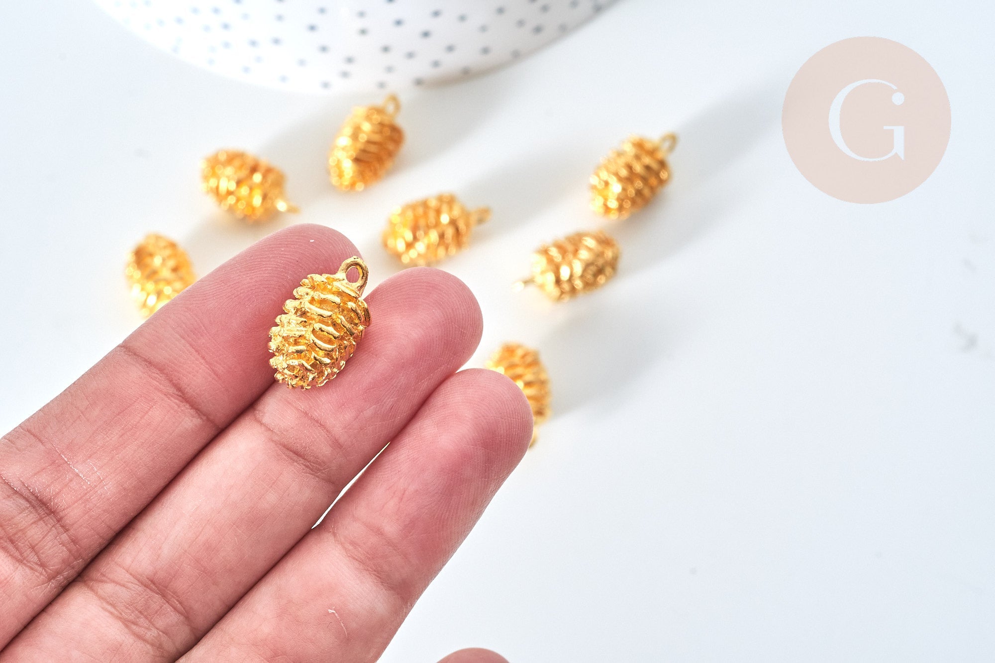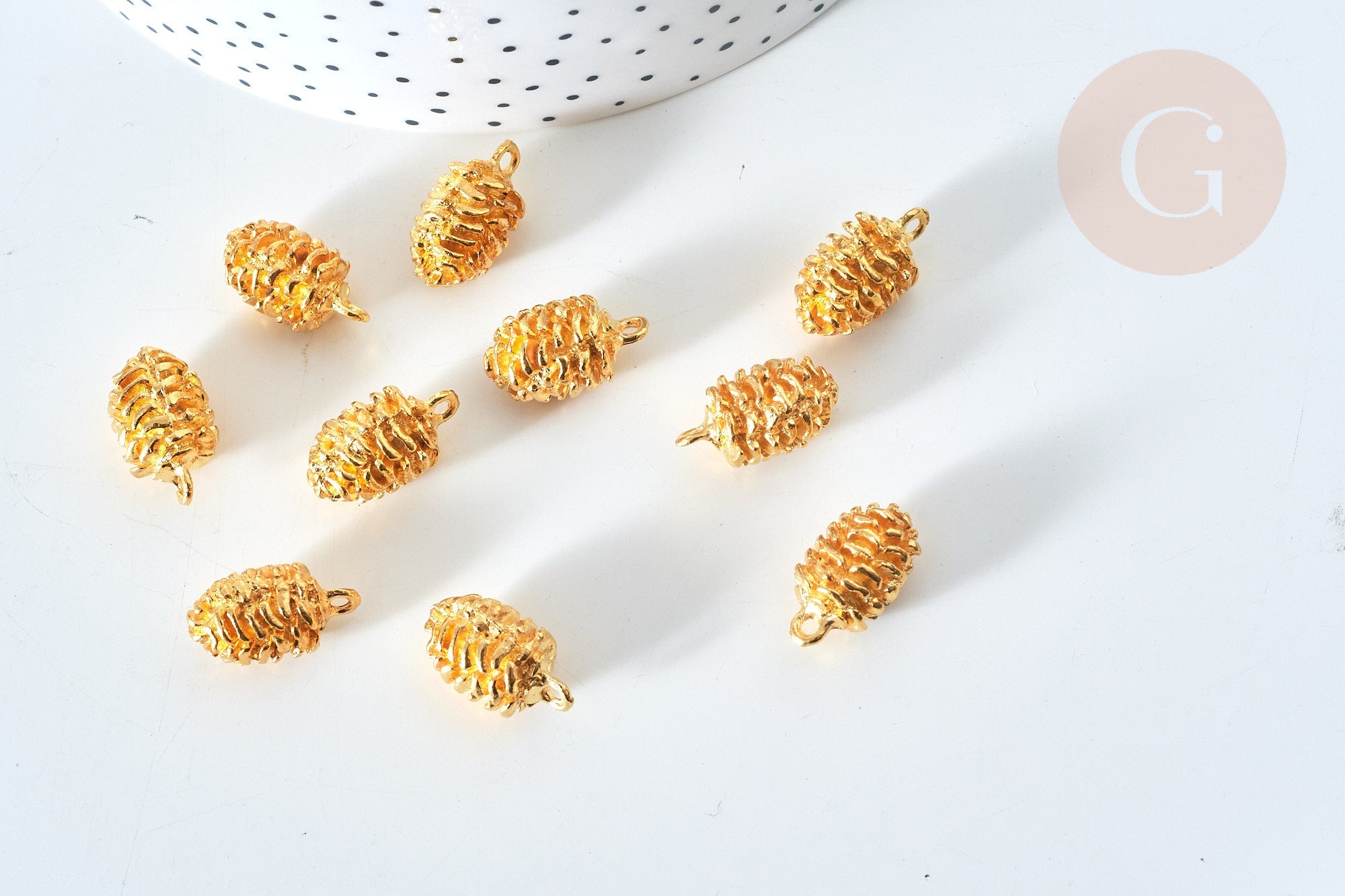 To make magnificent necklaces , earrings and bracelets , adopt these small pine cones in golden zamac.
