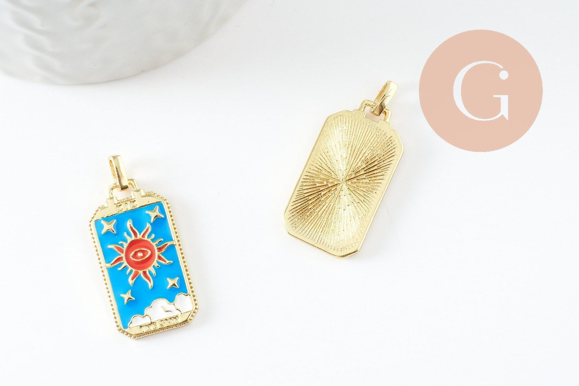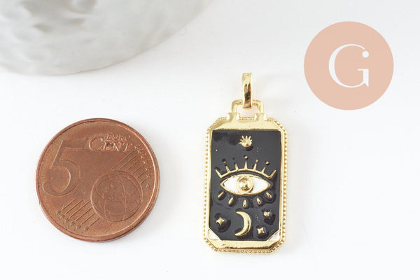 Discover our 26mm 18K gold-plated brass mystical rectangle pendant , adorned with powerful and protective symbols such as the protective eye, the hand of Fatima, the sun, the moon and stars .
