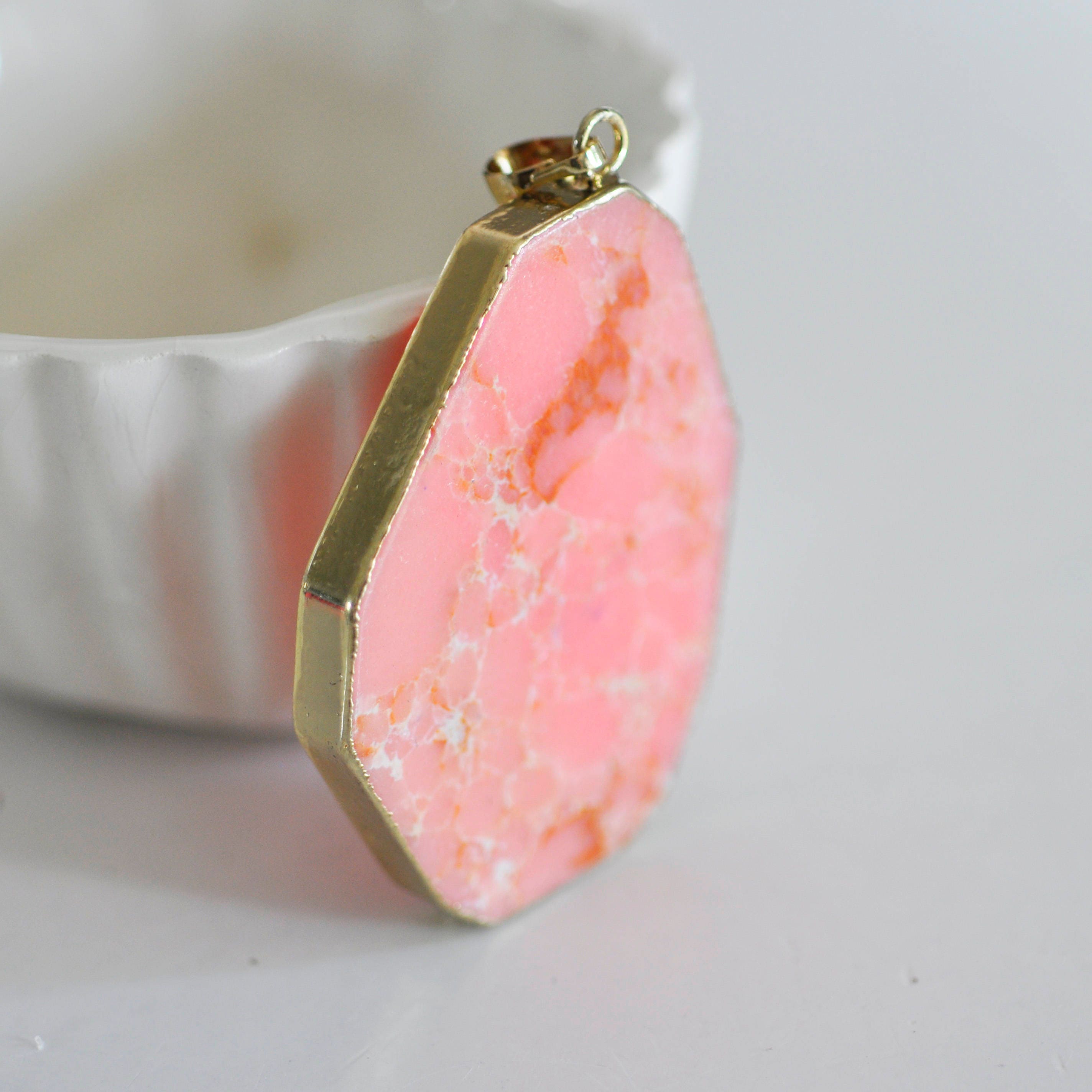 Pink regalite pendant, creative supplies, raw stone, jewelry creation, golden pendant, natural stone, natural regalite Fall for this magnificent pendant in tinted coral pink regalite with its golden support. You can create magnificent necklaces using this very trendy pendant. Width:...