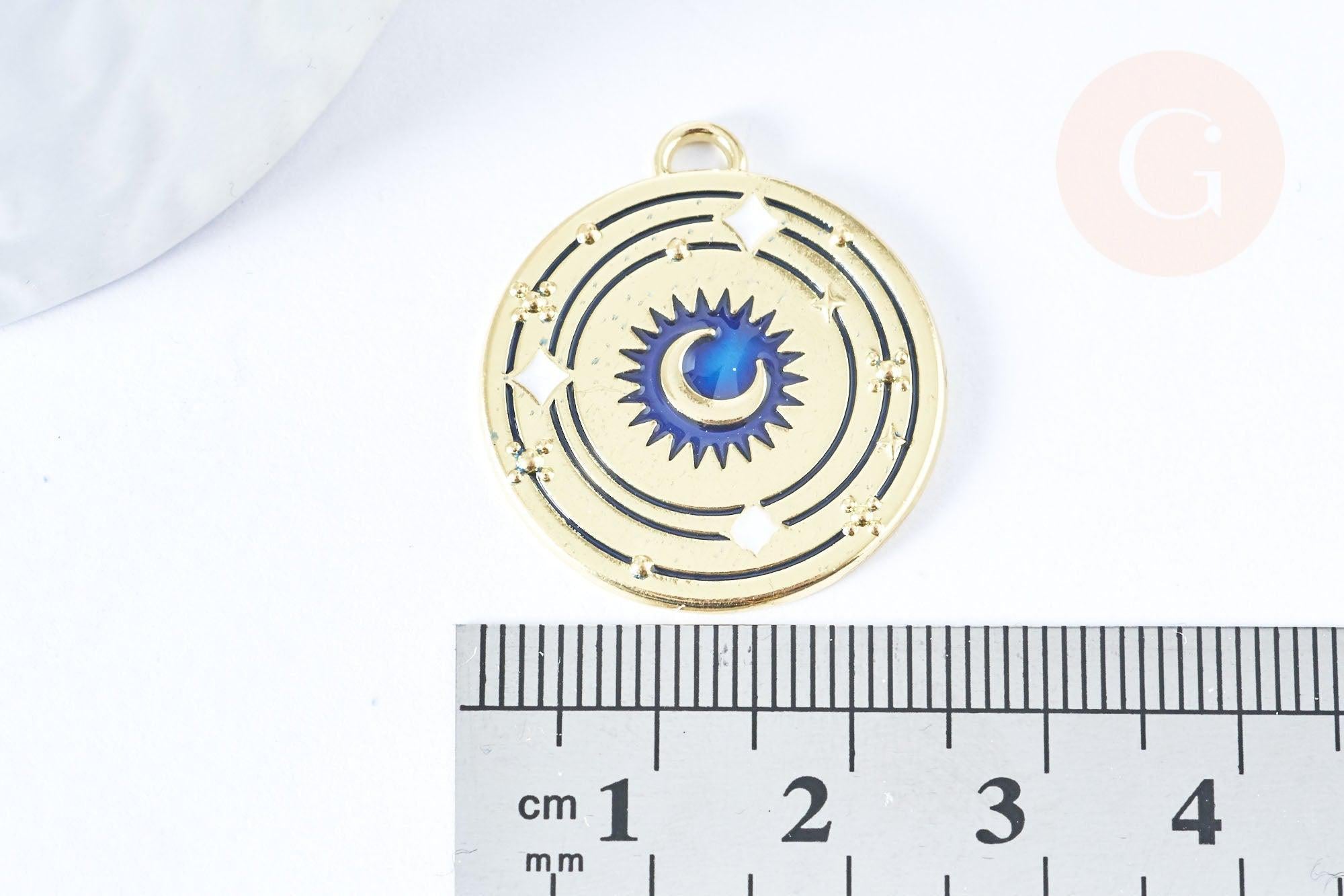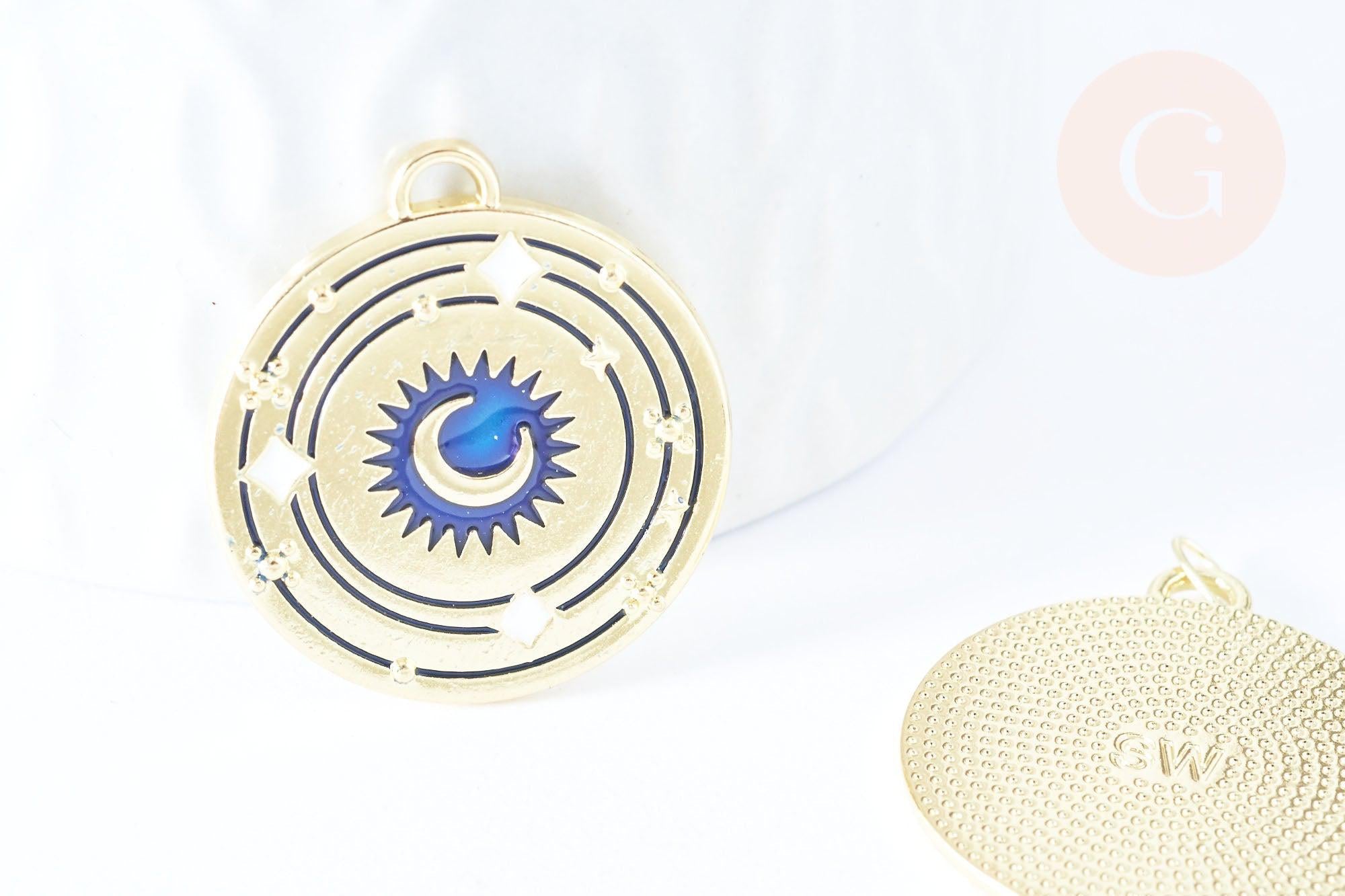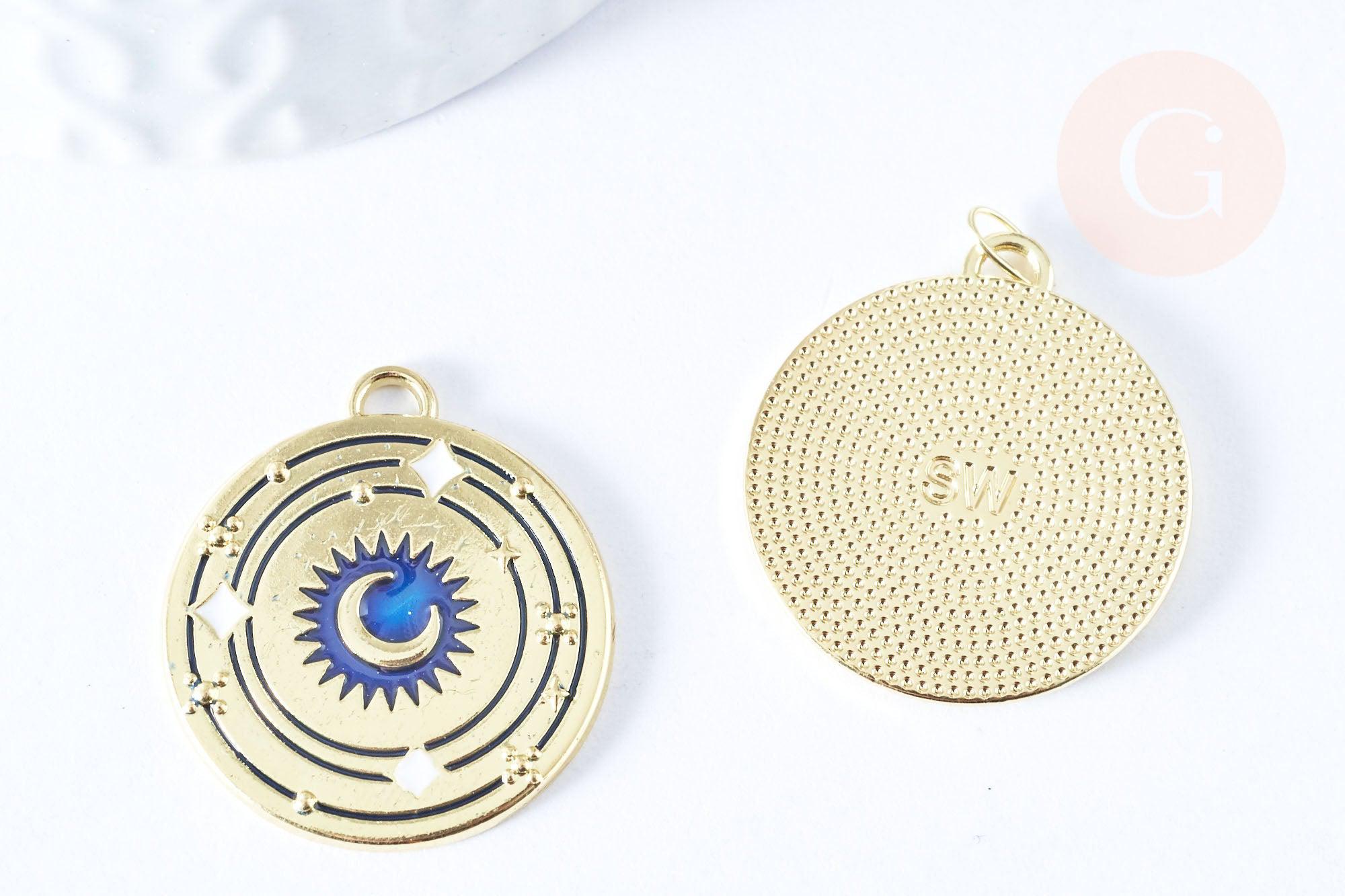 To make magnificent necklaces and earrings, this adorable round lucky medal in 18K gold-plated zamac with blue enamel, decorated with a moon in the center, on a blue enameled background
