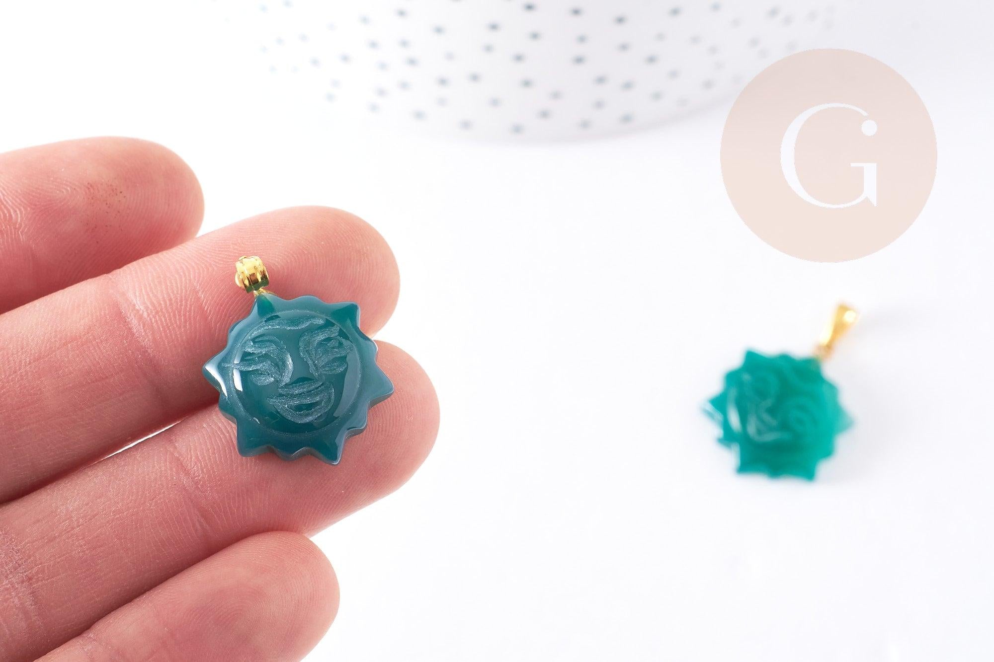 Green agate sun pendant with golden support, natural green agate stone pendant, natural stone jewelry creation, 23mm, each