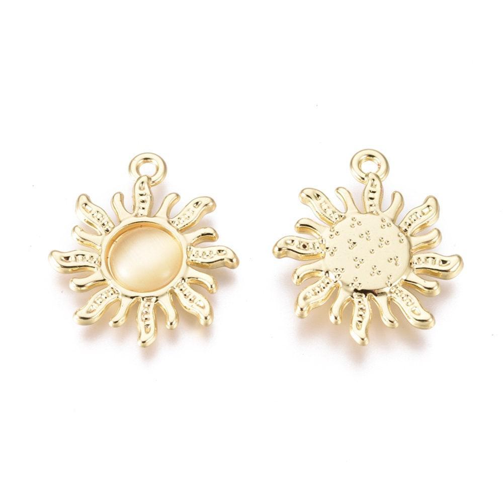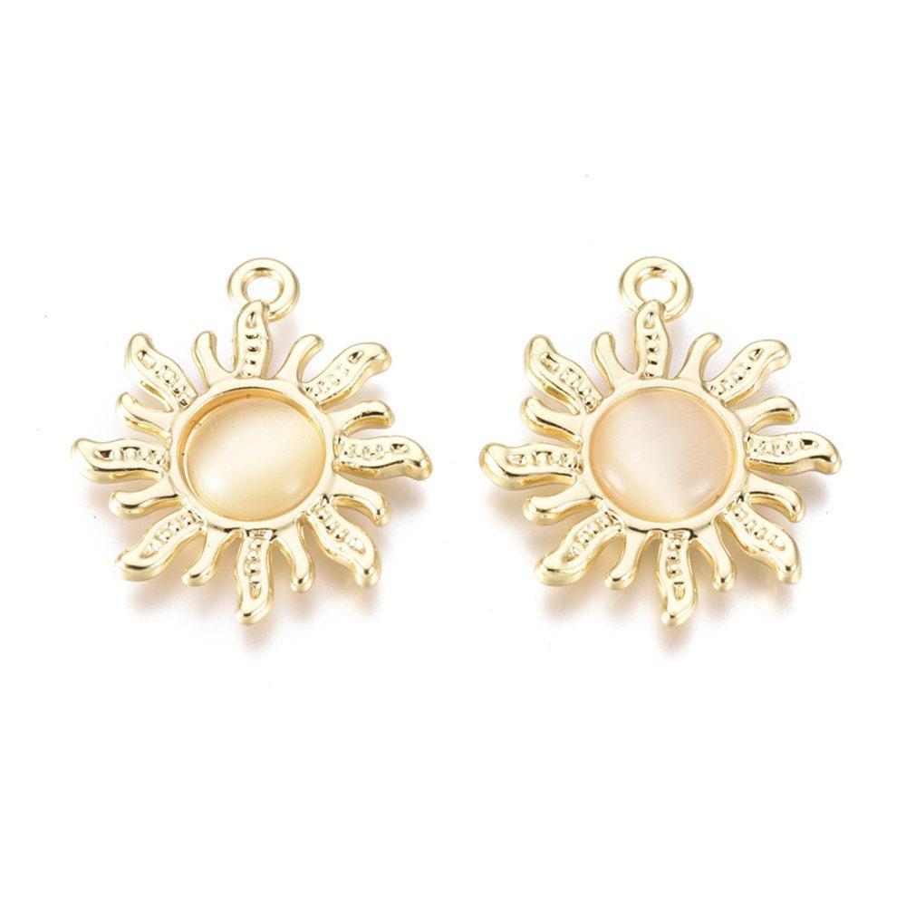 Add a luminous and symbolic touch to your creations with these magnificent sun pendants in gold-plated zamac , adorned with a cat's eye glass cabochon with golden reflections.