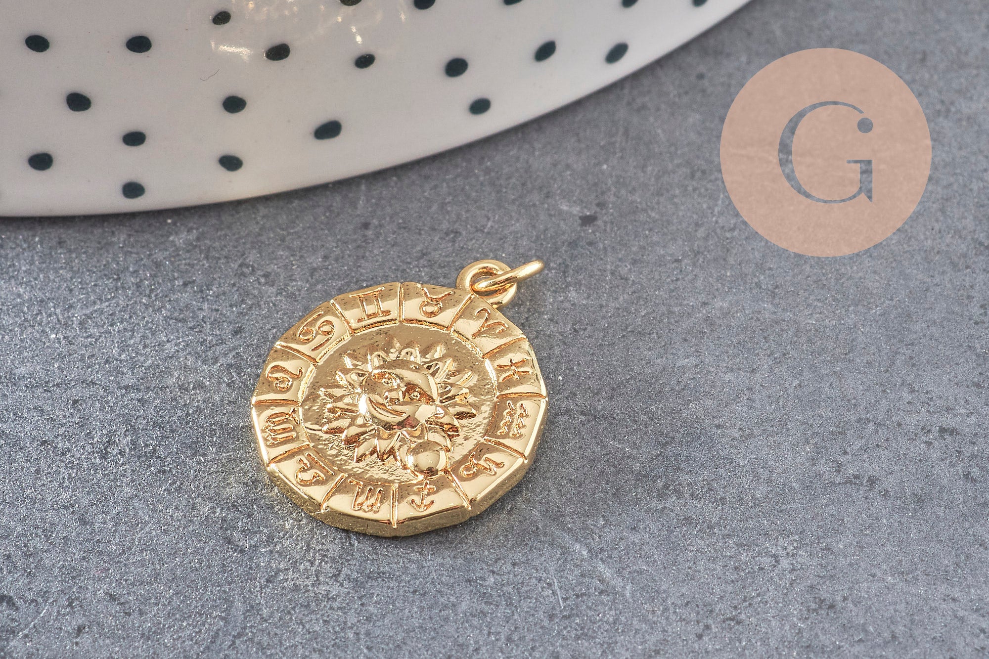18K golden zodiac sun pendant, golden horoscope pendant, lucky charm, golden brass, Sun pendant, 21mm, unit