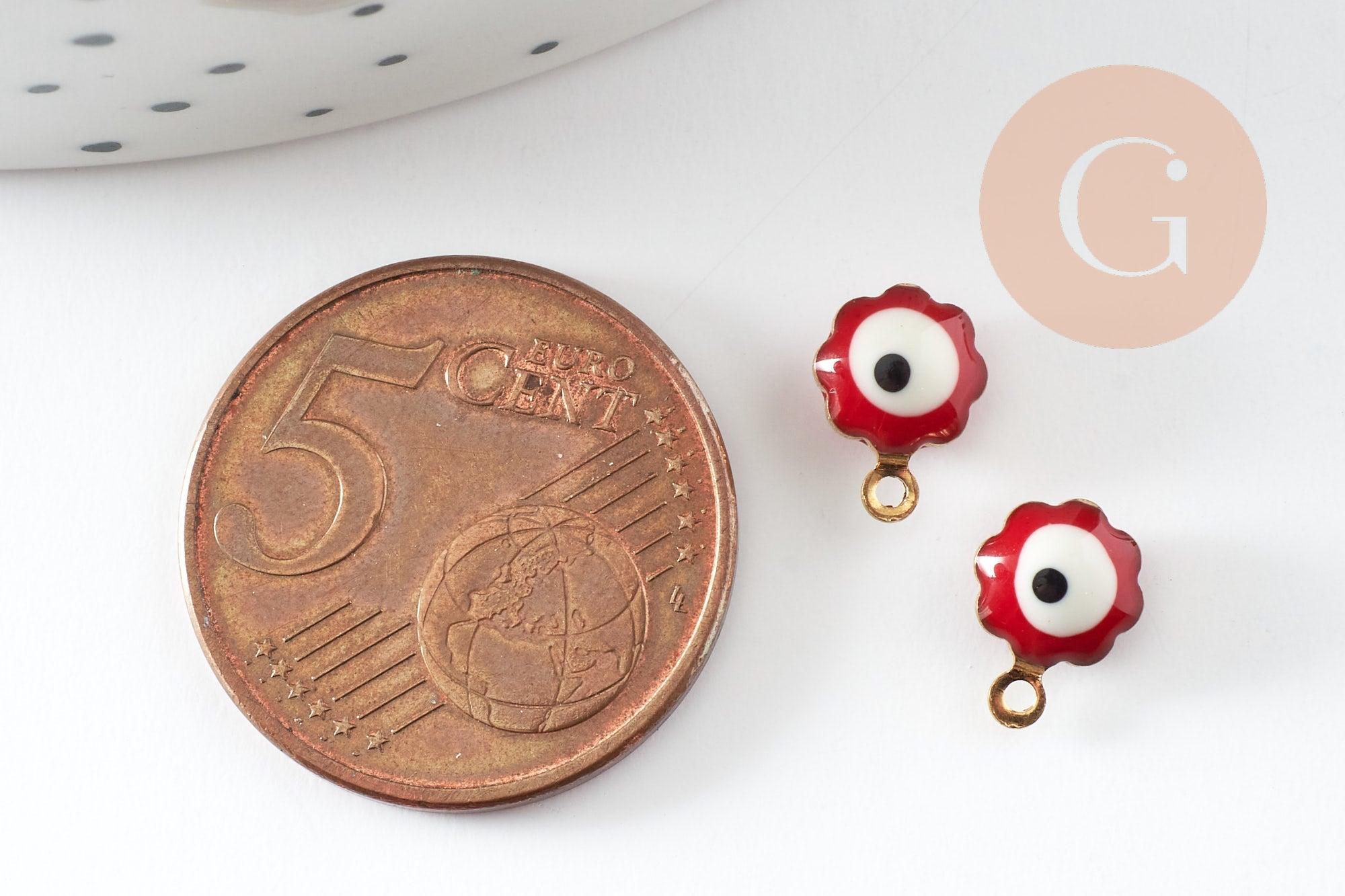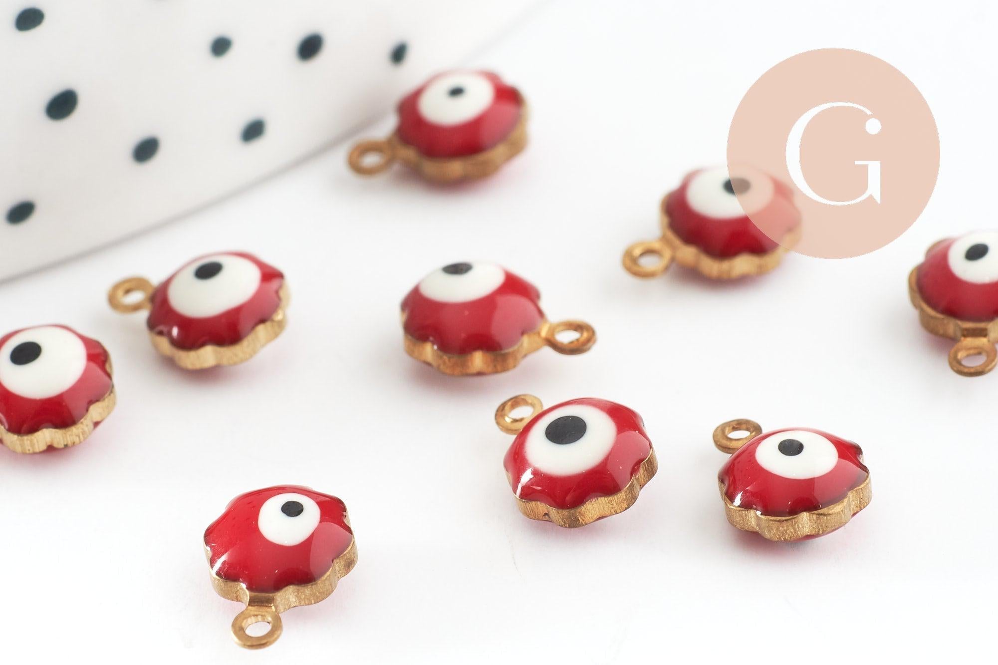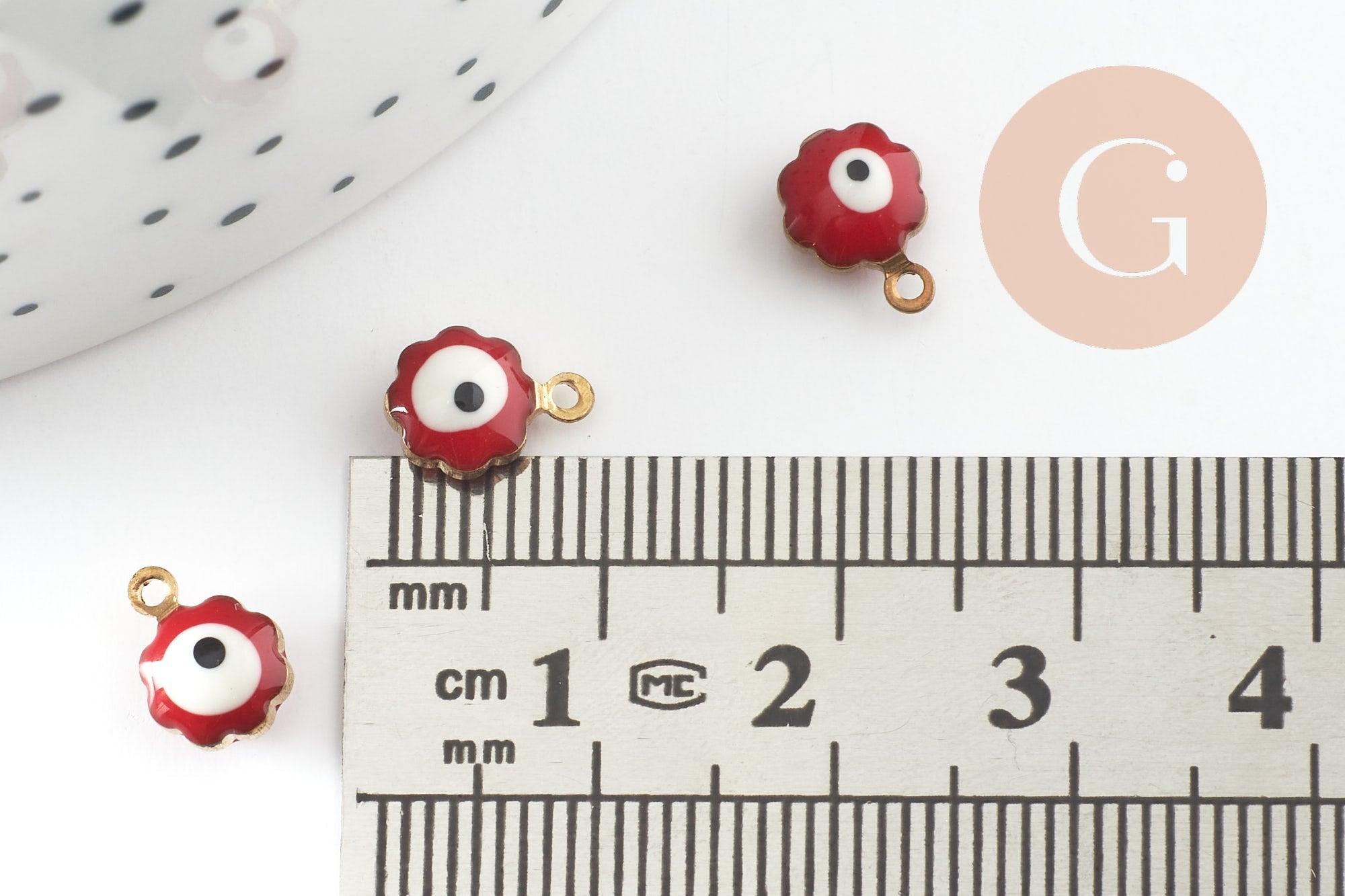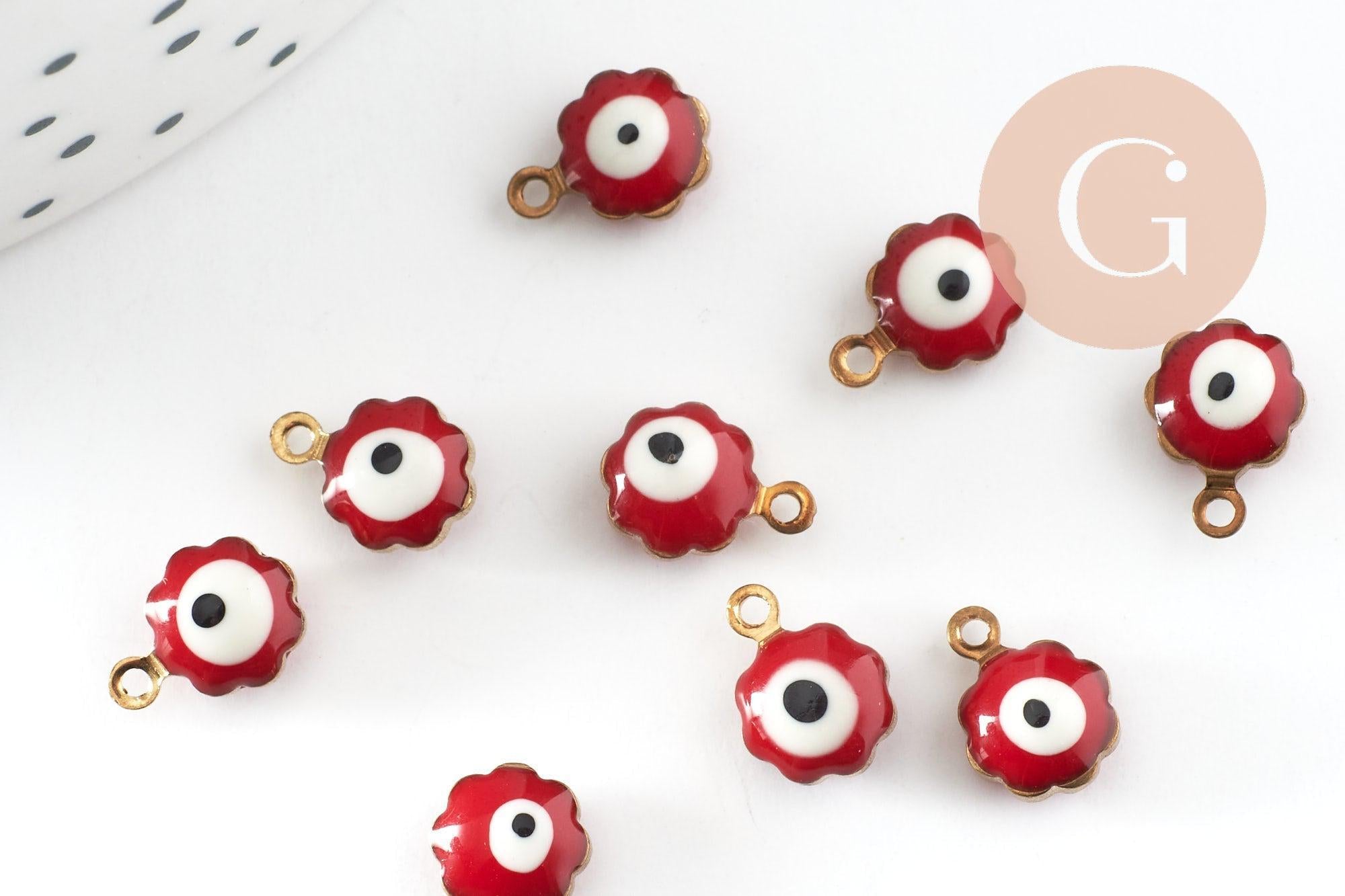 Golden pendants Red enamel flower, evil eye, creative supplies, golden brass, lucky pendant, jewelry creation, 9mm, set of 10