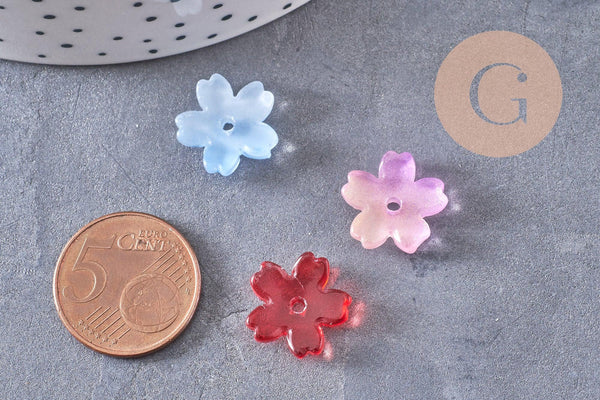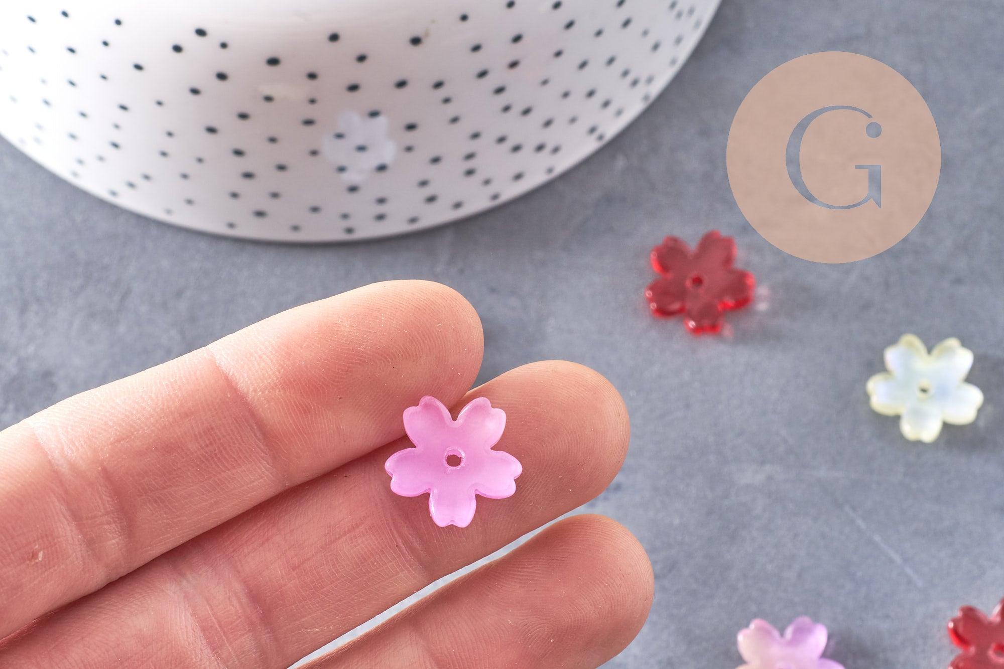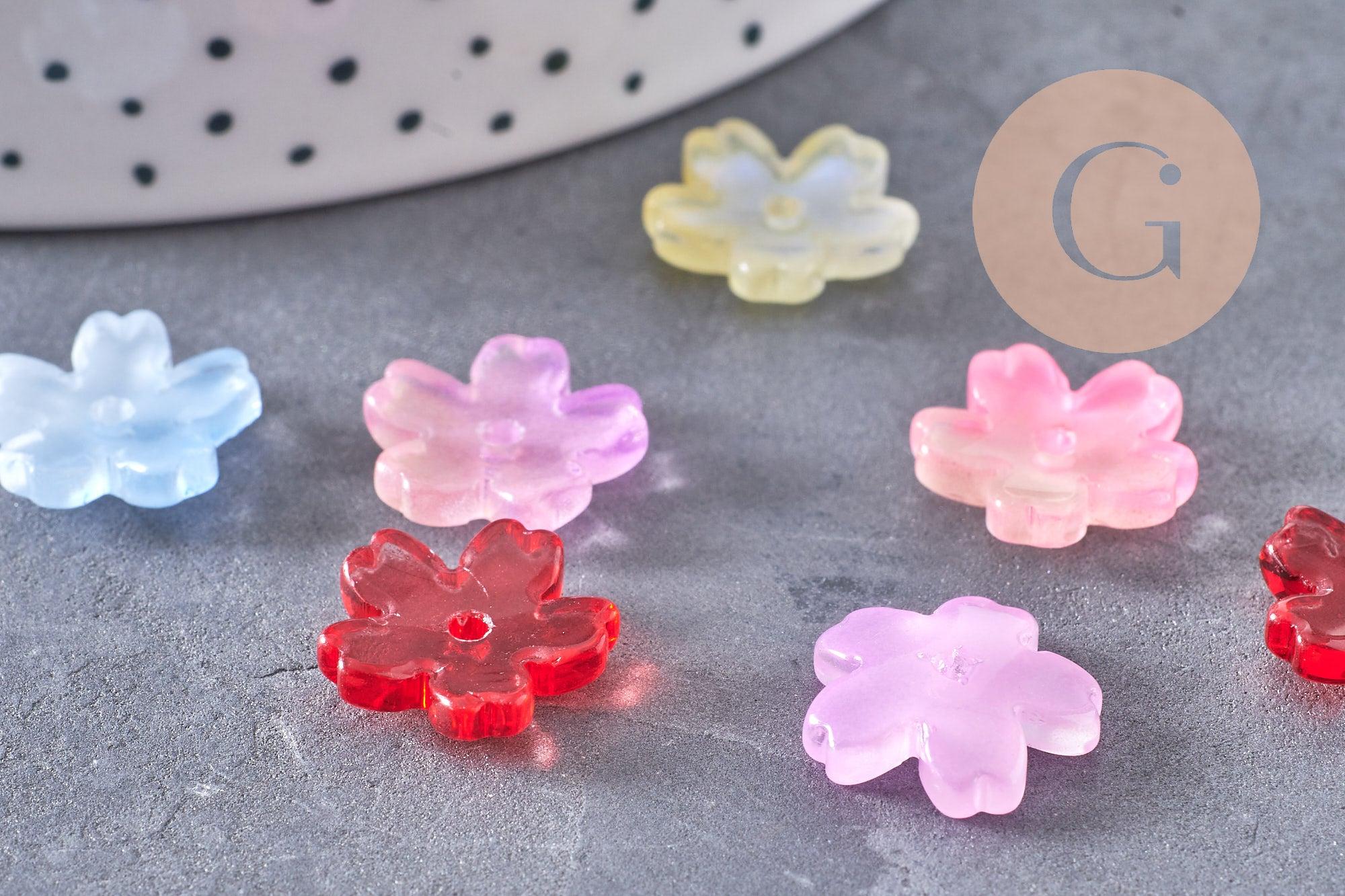 Multicolored yellow glass flower bead covered with a fine powder of gold glitter for a sparkling and light effect. Its transparency and shimmering colors make it a must-have for your DIY jewelry creations.