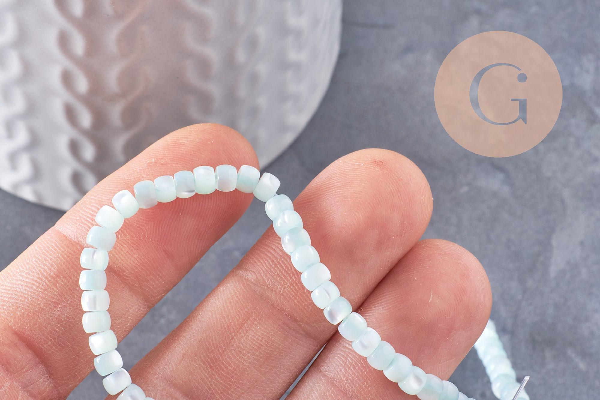 1 complete strand of 70 pastel turquoise blue mother-of-pearl heishi rondelle beads A lovely product for making jewelry in the very fashionable shell and refined trend. Length: 3x4mm Hole: 0.5mm Other pearls made of mother-of-pearl, shell and fine stones are...