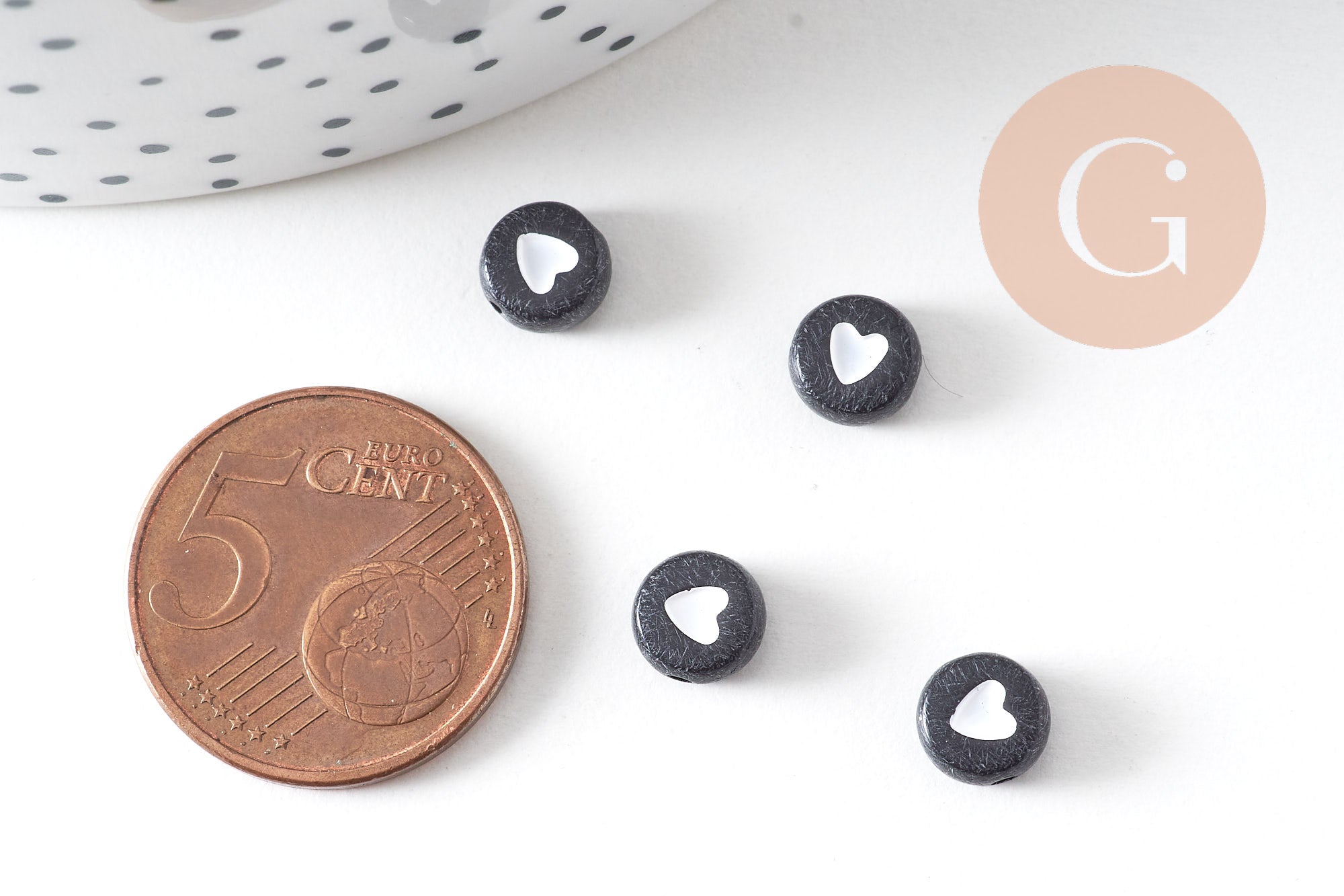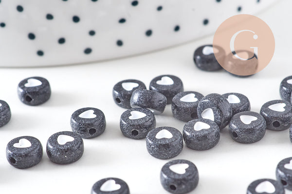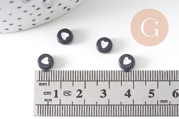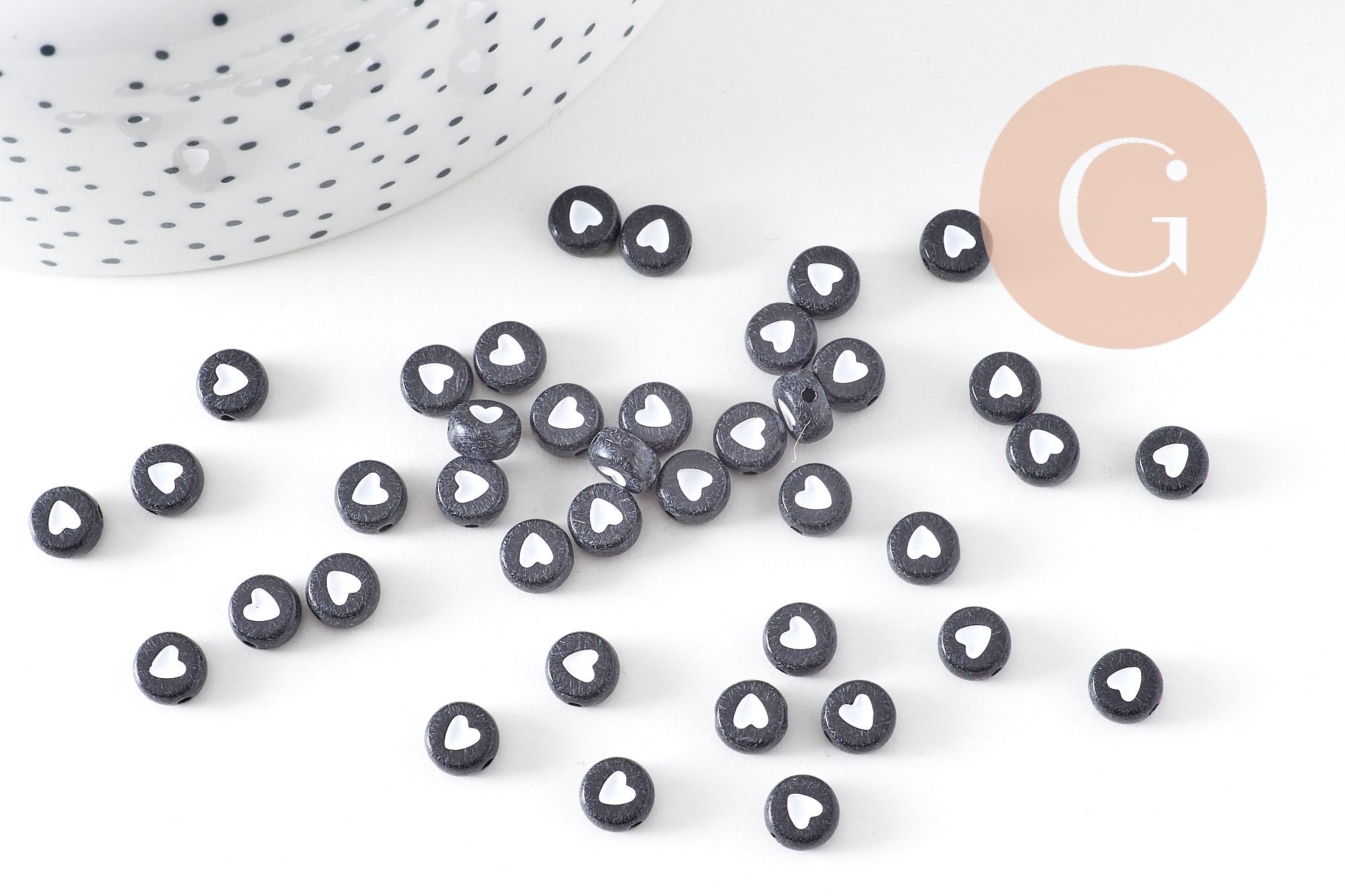 Perle ronde coeur blanc plastique noir,perle plastique,perle ronde lettre,x 10 grammes, (G2189)
