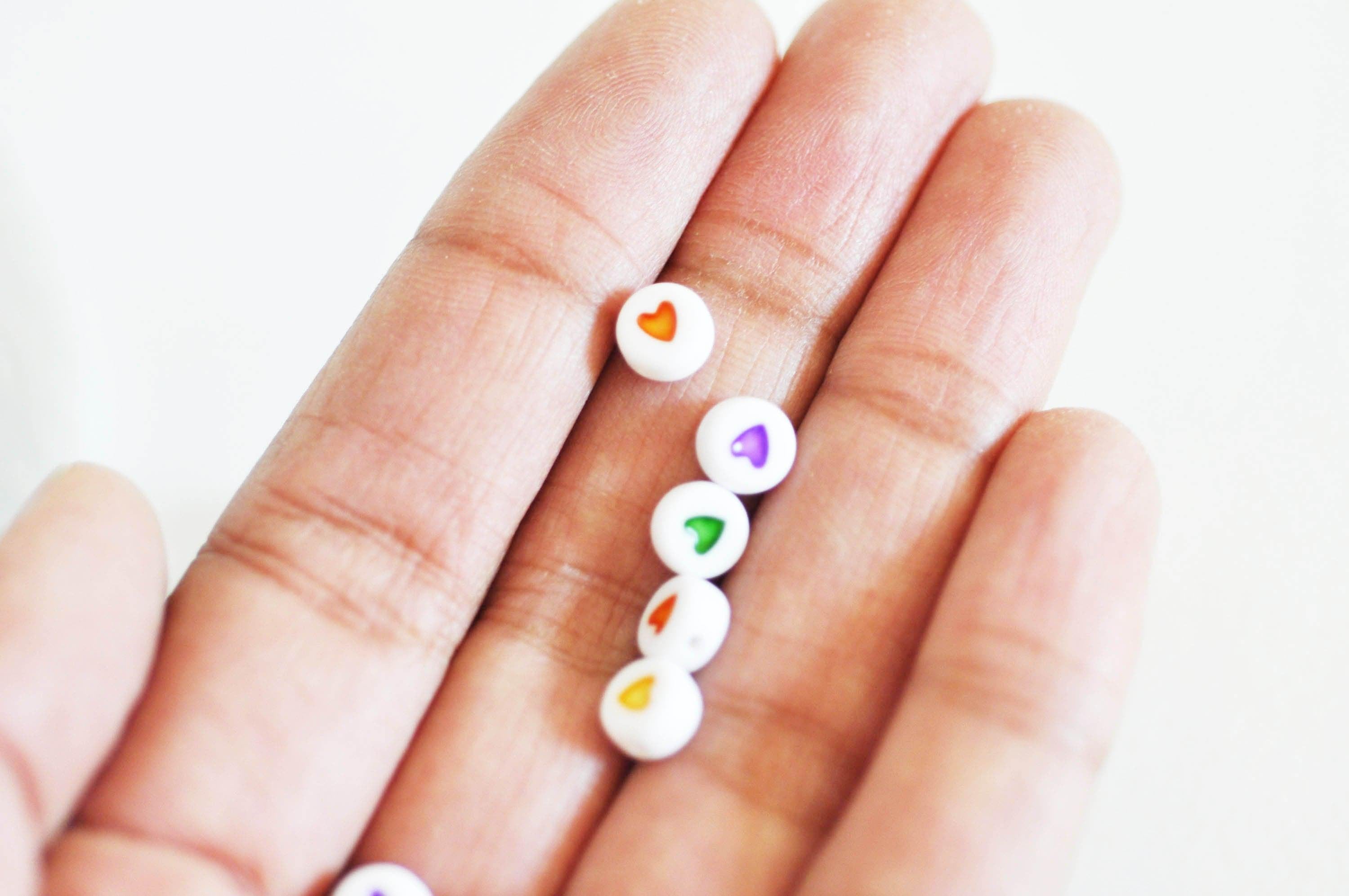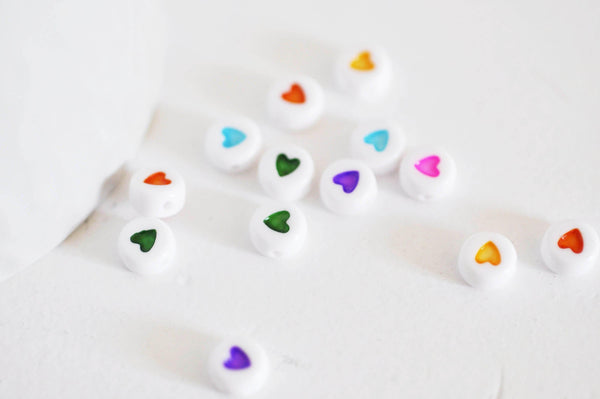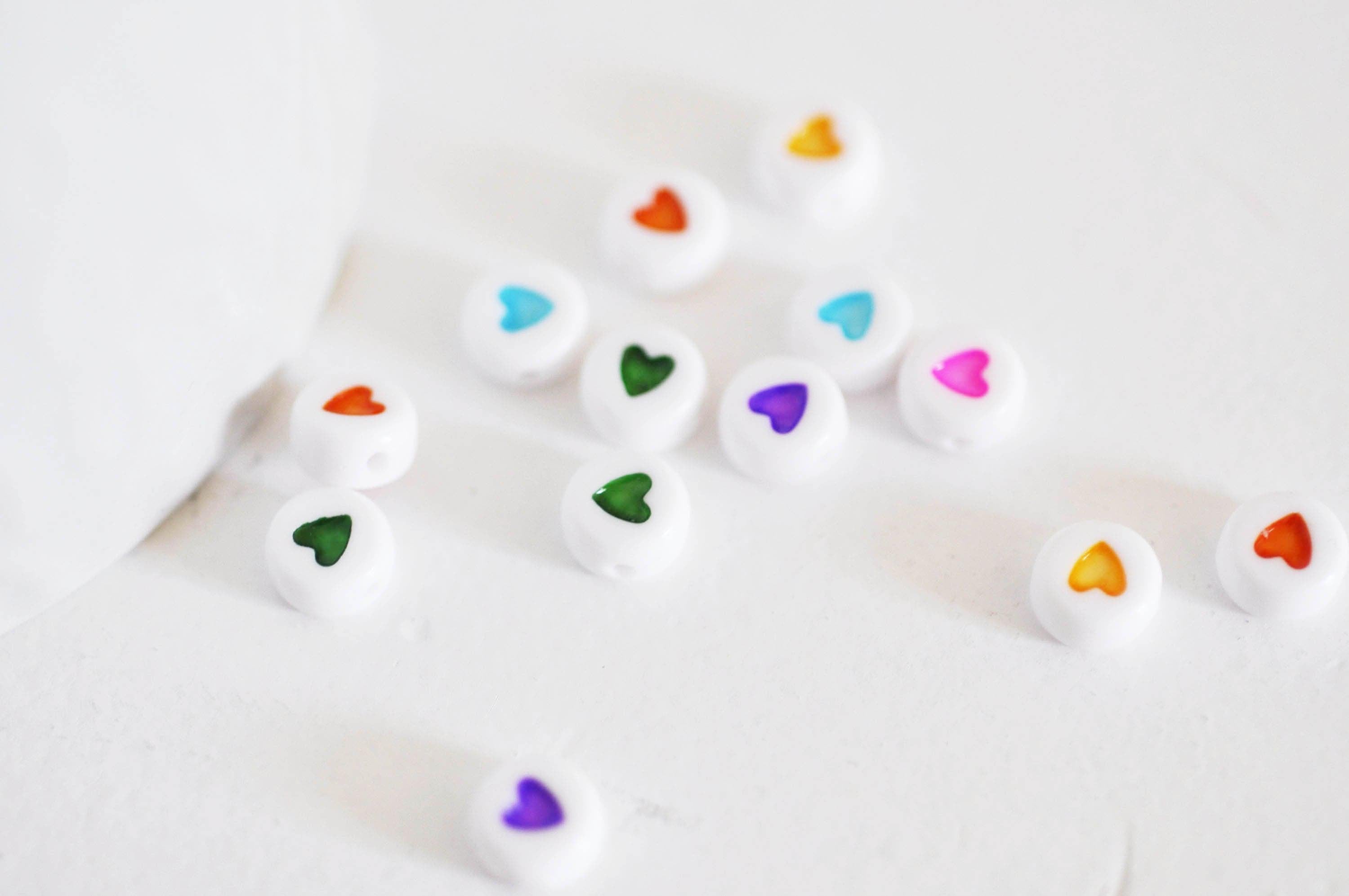 Lots of 10 grams of round white beads with a colored heart in the center, plastic beads Ideal for making necklaces or bracelets with messages