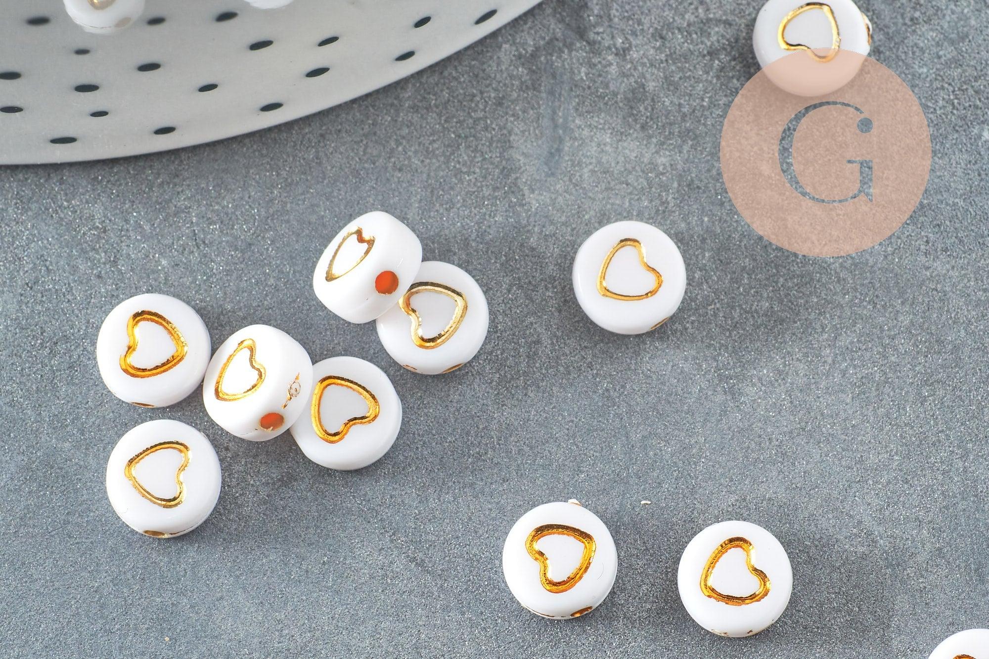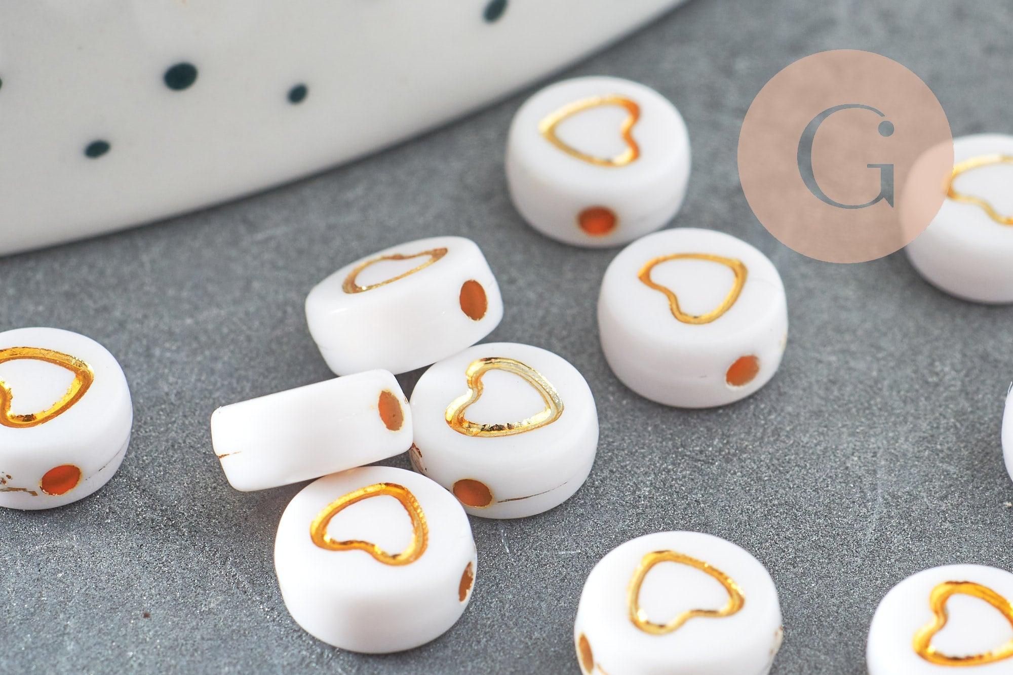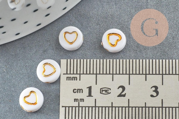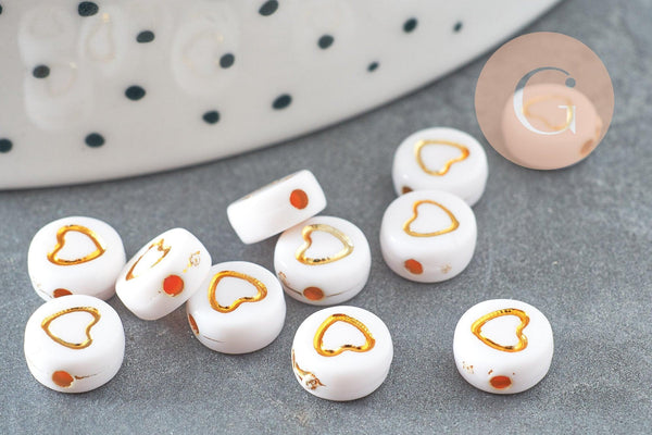 round white plastic gold heart bead, plastic bead, round letter bead, jewelry creation, heart bead, lot of 10 grams approximately 60-70 beads.