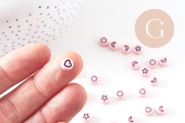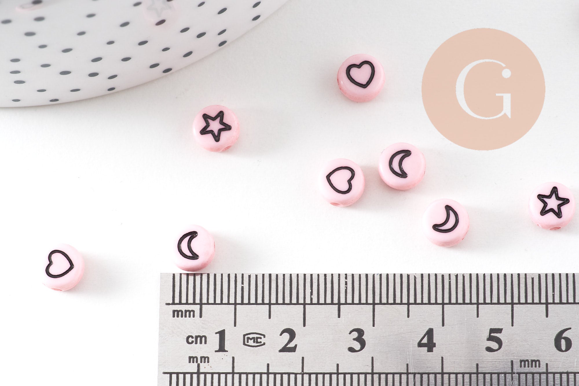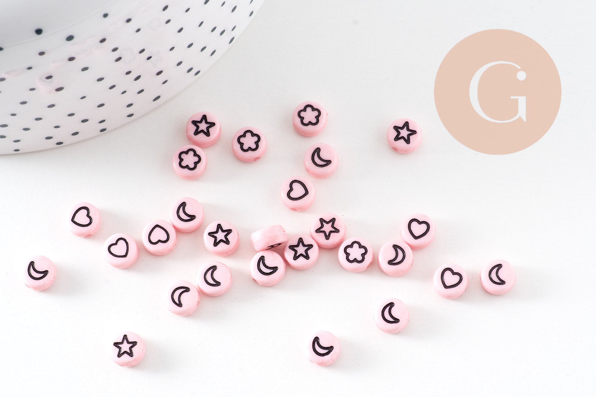 Lots of 10 or 50 grams of round pink beads with a black cloud, heart, moon or star motif in the center, plastic beads Ideal for making necklaces or bracelets with messages