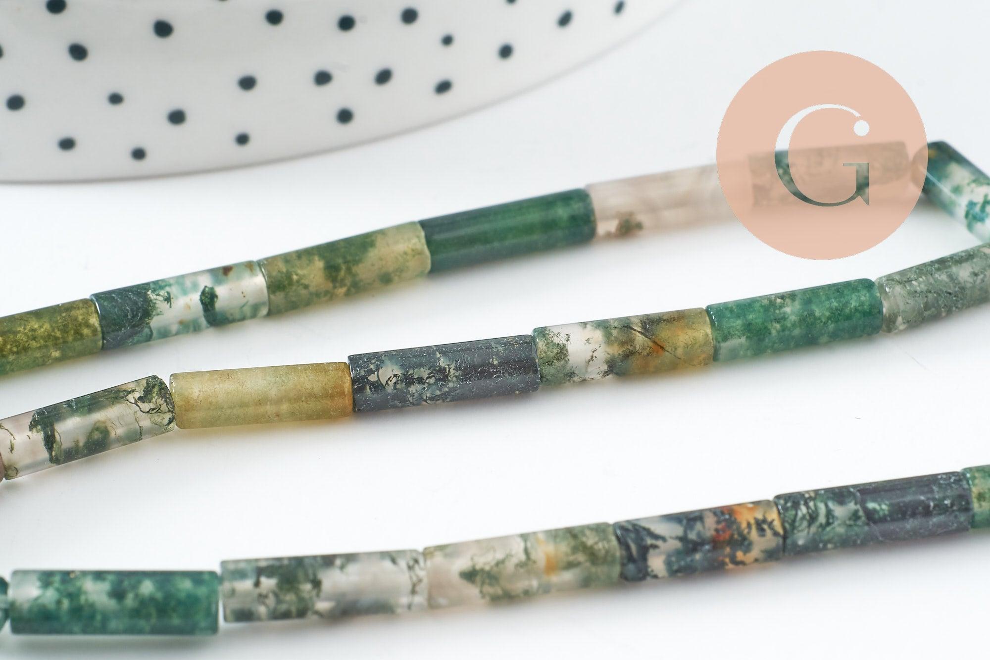 Discover this magnificent thread of natural moss agate beads , cut into tubes of 13 to 14 mm .