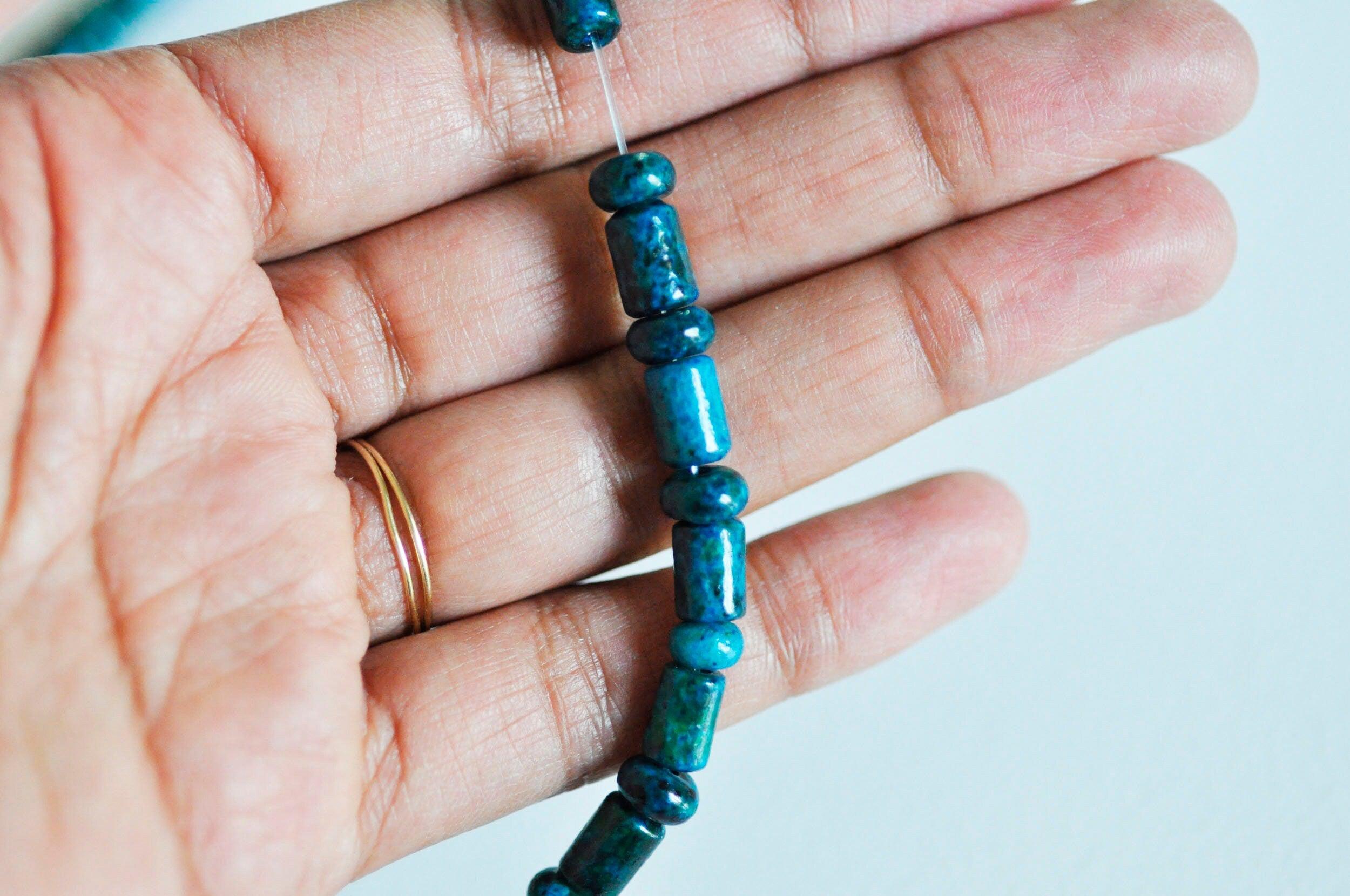 Natural green turquoise tube bead, stone jewelry, stone beads, natural turquoise, jewelry creation, 6x3-9mm, thread of 50 beads A thread of 50 beads in dyed natural turquoise, imitating chrysocolla, in the shape of a tube and round. They are magnificent...