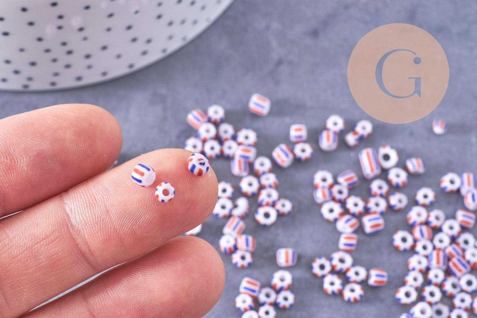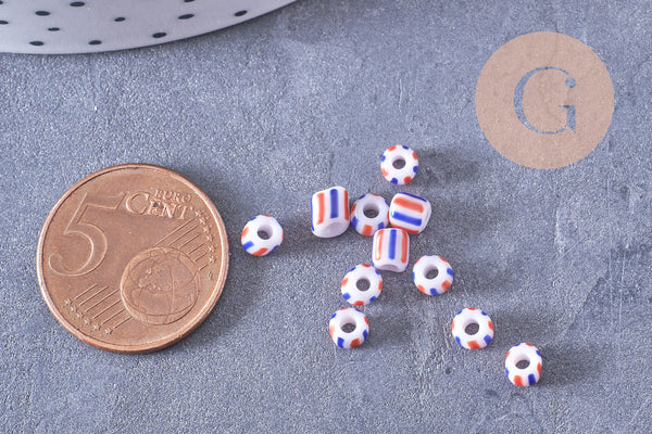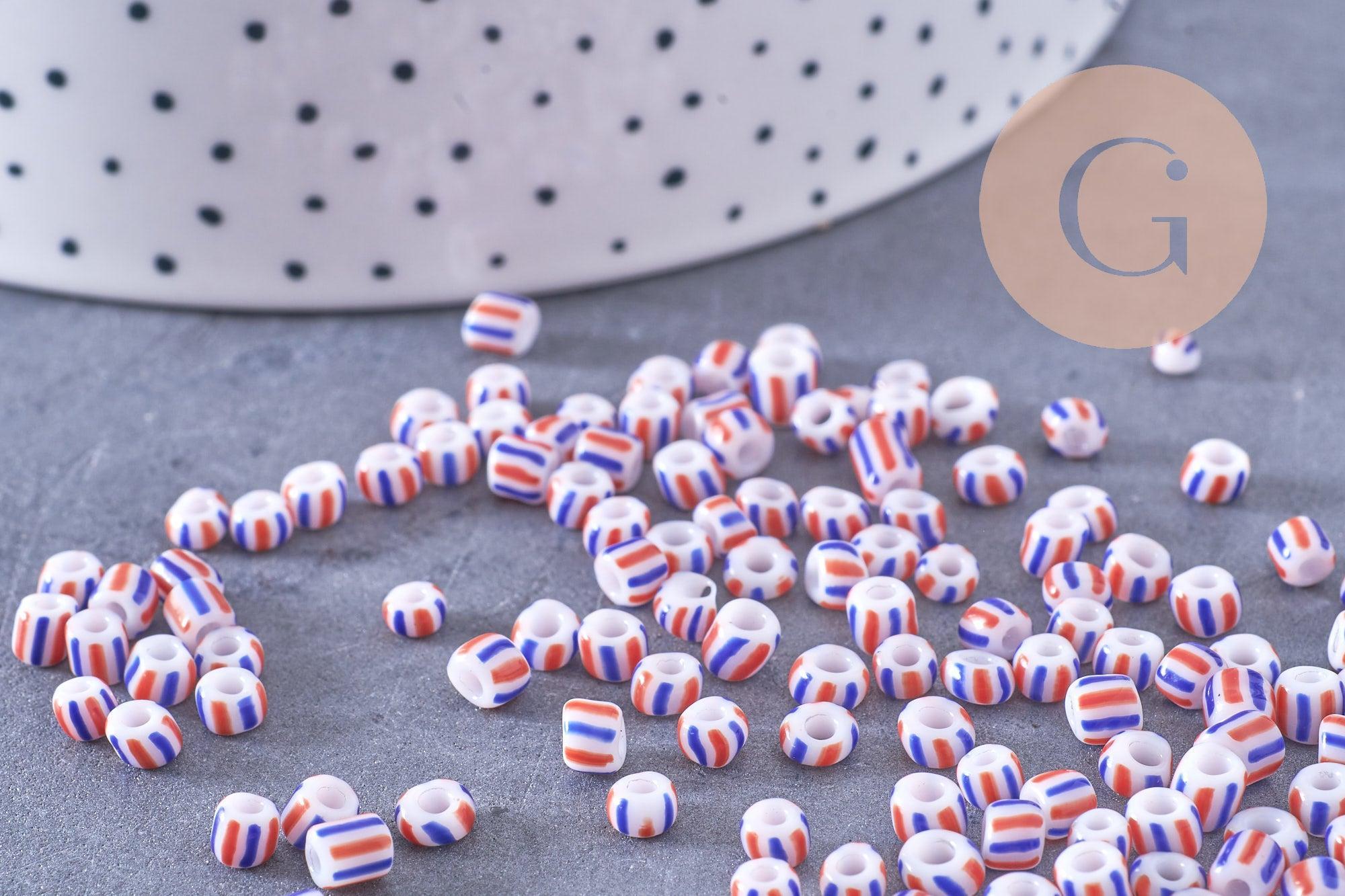 Petite perle rocaille verre rayé bleu blanc rouge 3x4.5mm, x10 Gr (G10709)
