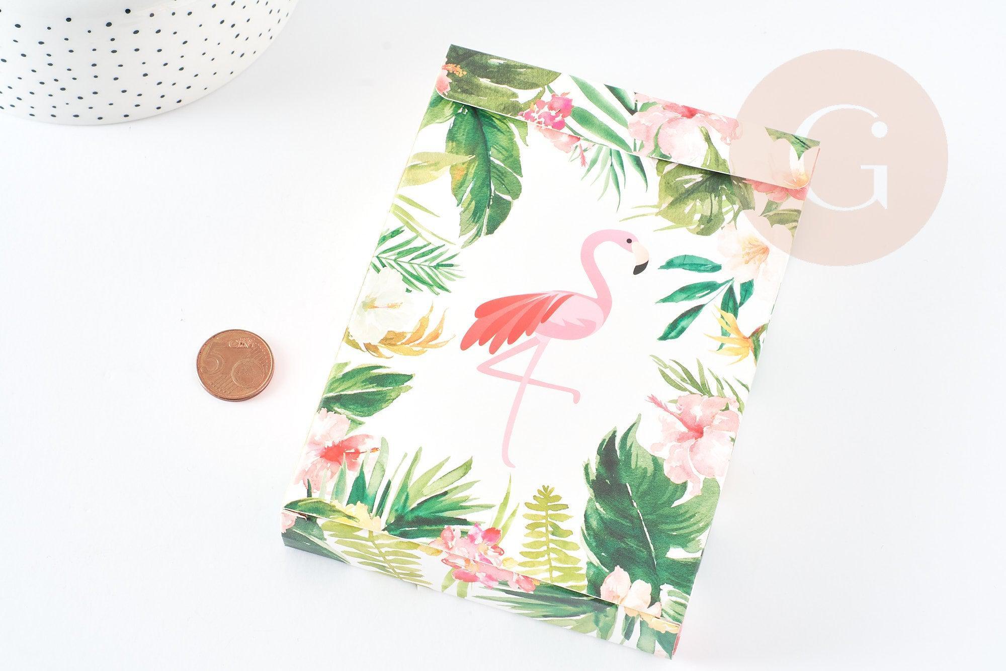 Fall for this set of cardboard sleeves decorated with a tropical leaf pattern and a pink flamingo, for party decoration or your small wedding, birthday and other party gifts