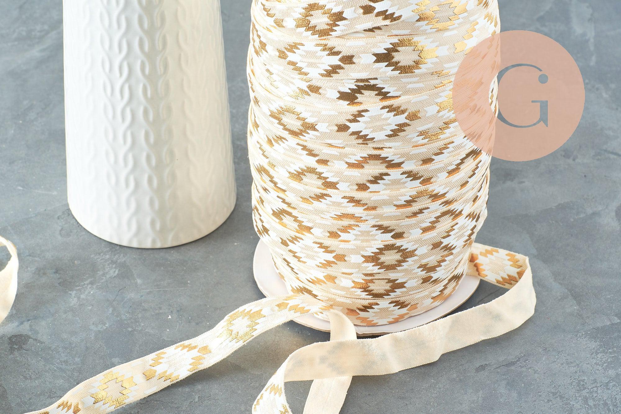 You will love this wide elastic ribbon with its gold pattern on an ecru background.