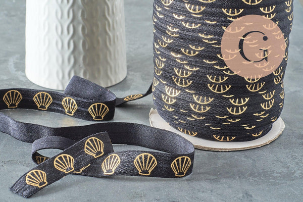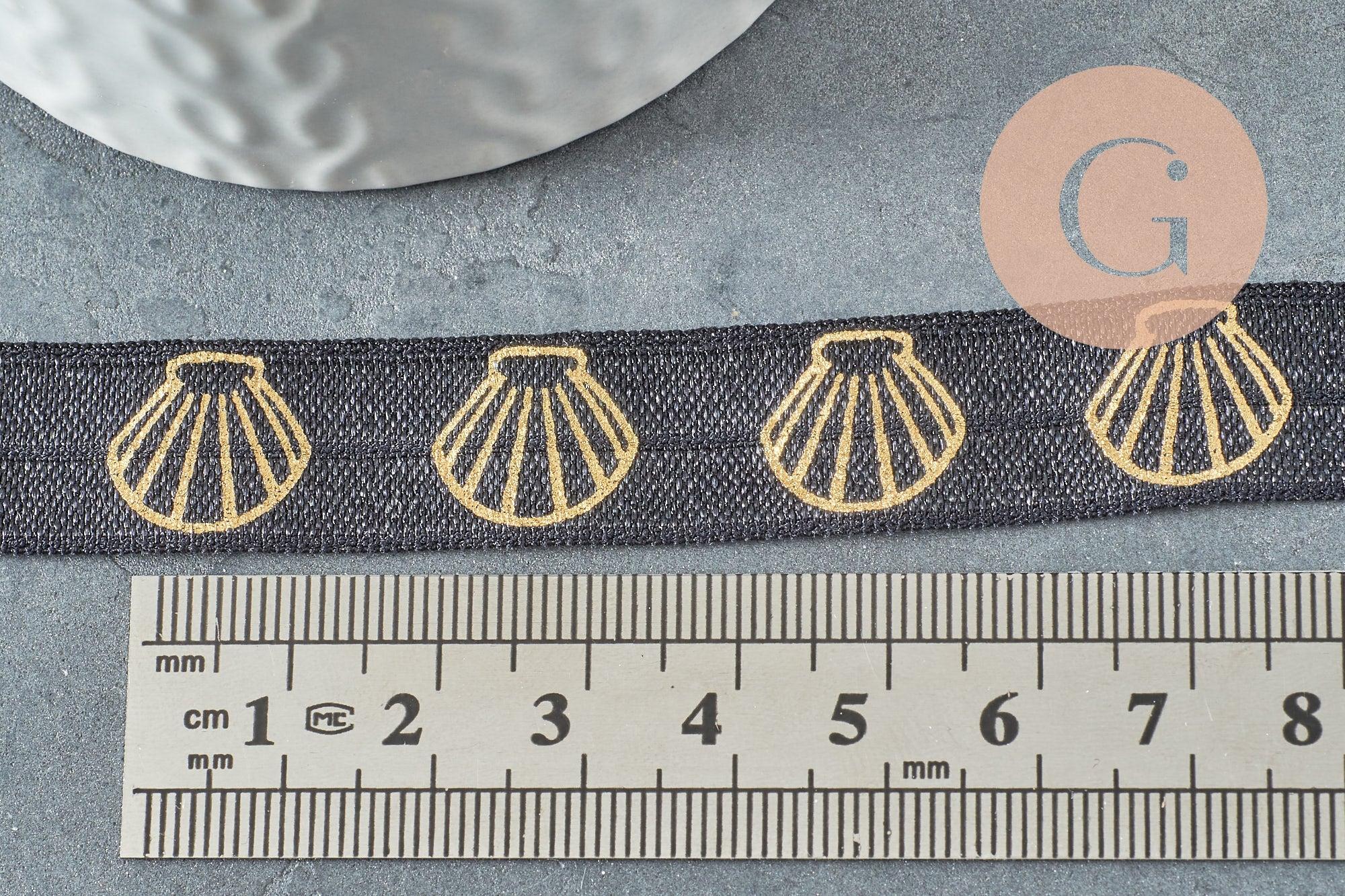 You will love this wide elastic ribbon with its gold pattern on a black background.