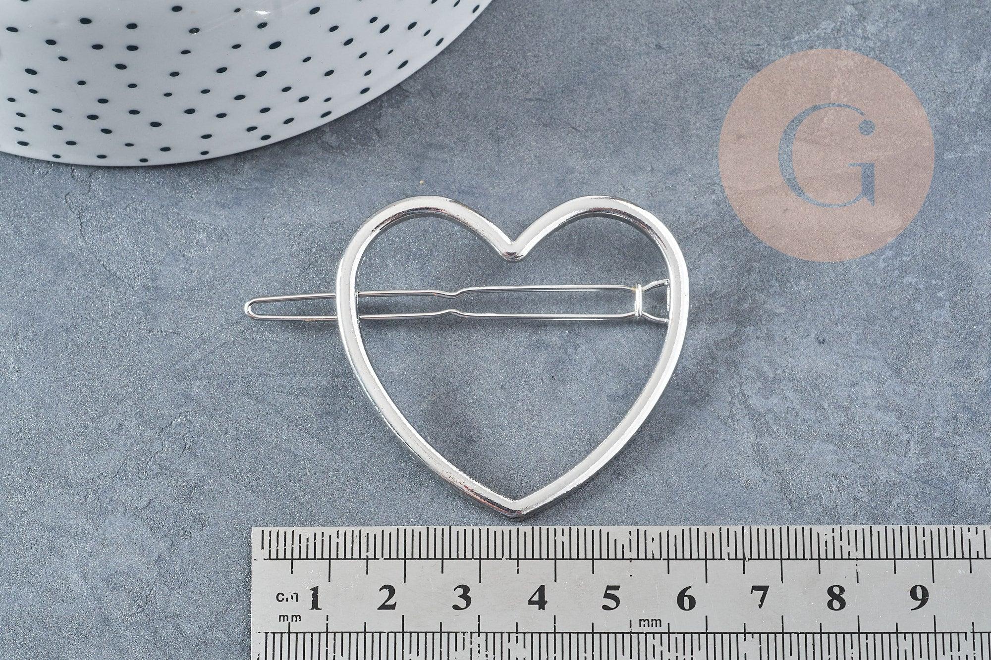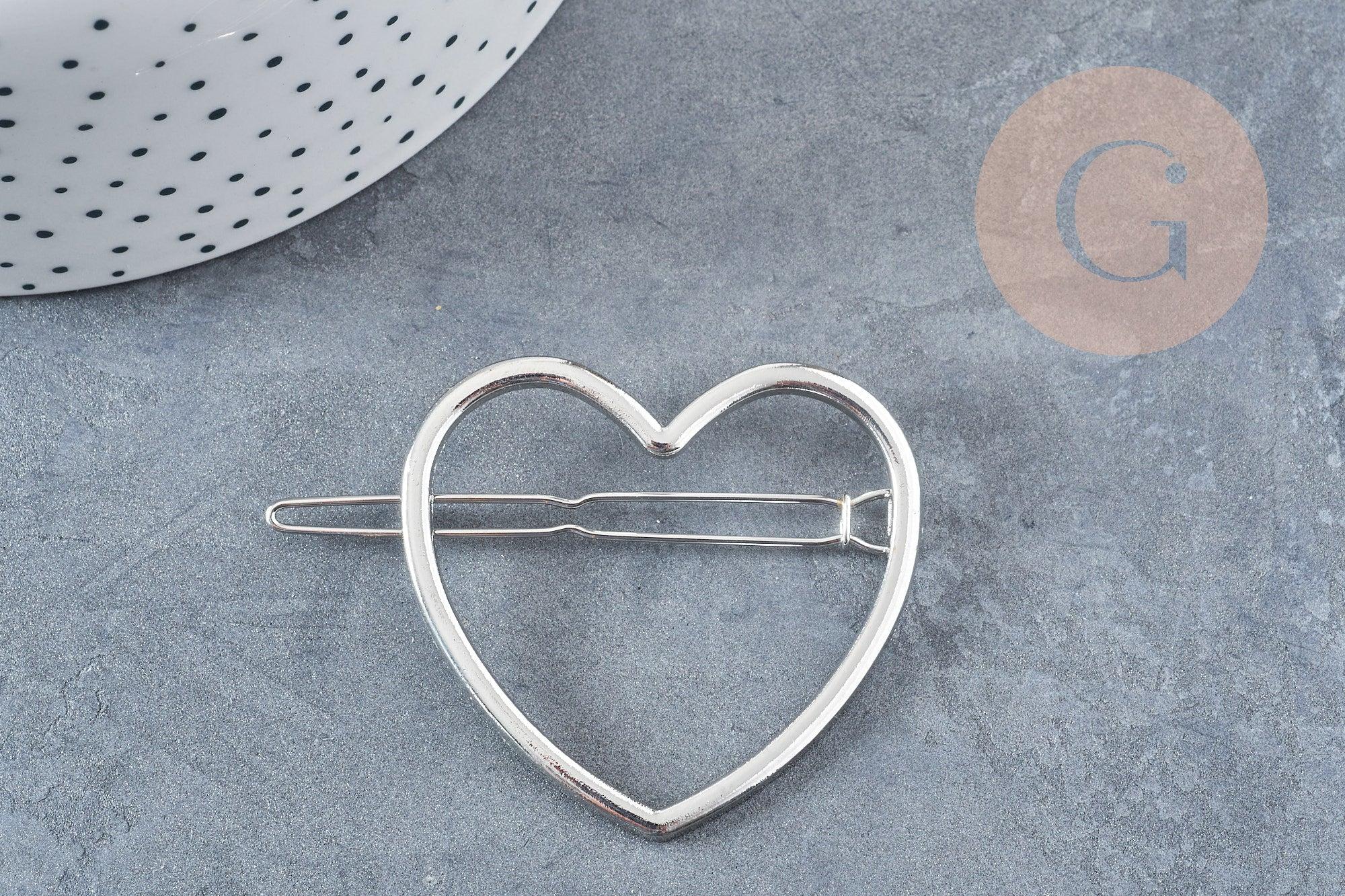 A heart-shaped silver metal barrette , to be adopted immediately to make personalized barrettes, with pretty rhinestones.